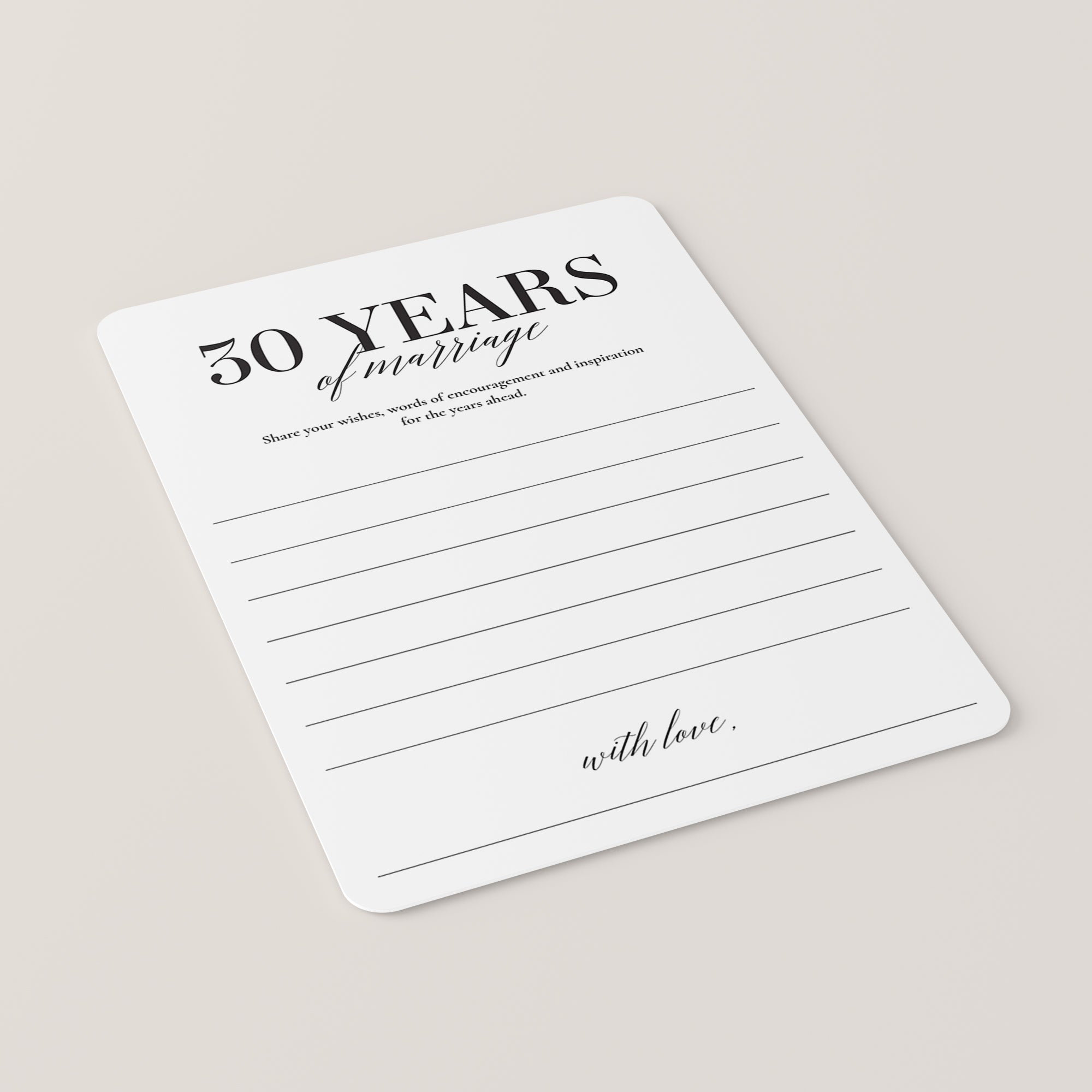 Create an amazing keepsake for the 30th anniversary couple with these modern, yet sophisticated, Wishes and Advice cards. Let every guest write down their wishes, words or encouragement and inspiration for the years ahead. It's the perfect addition to a 30th wedding anniversary party.