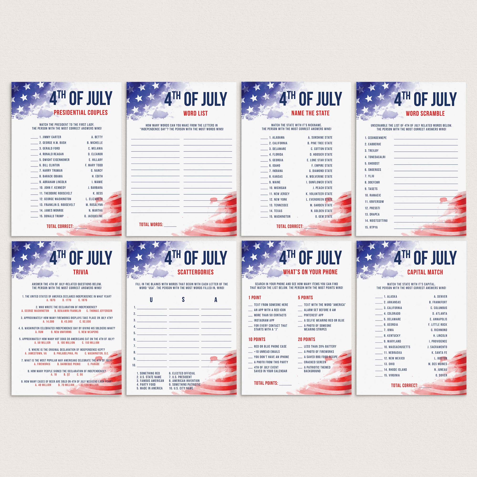 Are you hosting a July 4 party for family and friends? This red, white and blue July games bundle with 8 patriotic themed games will help you create lasting memories. The games will be the perfect addition to your 4th of July party.