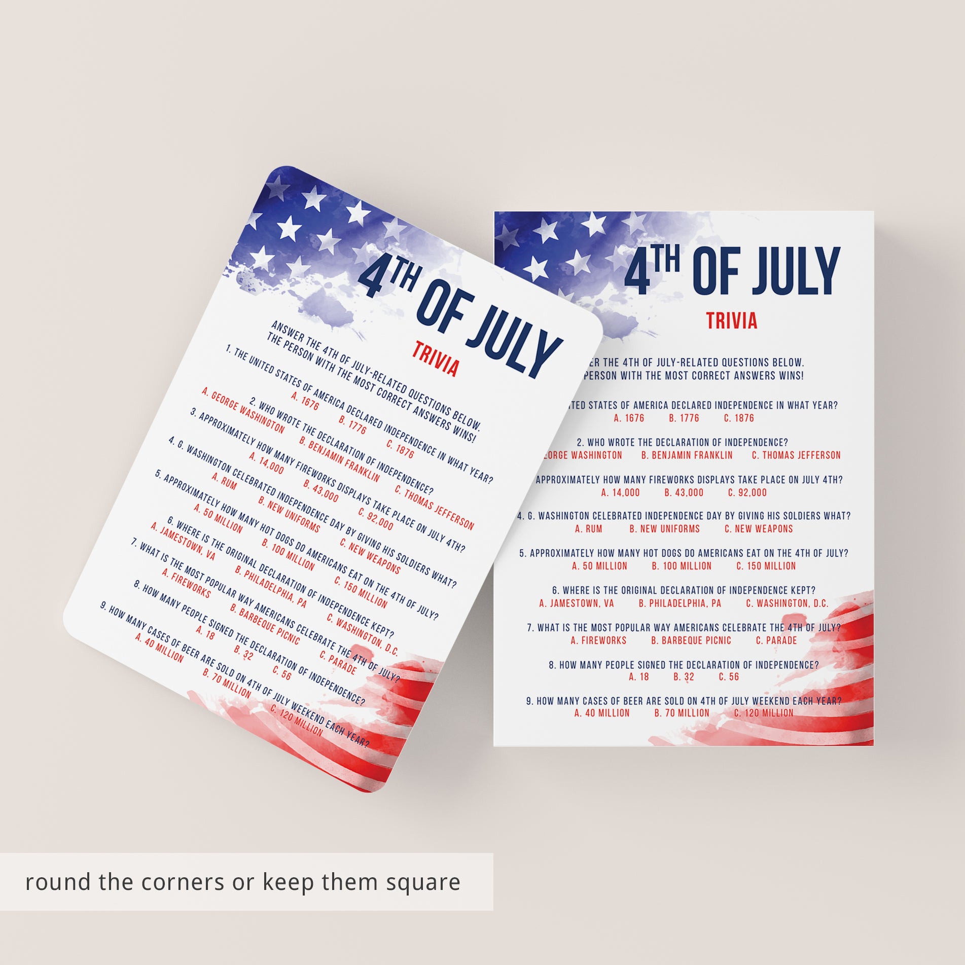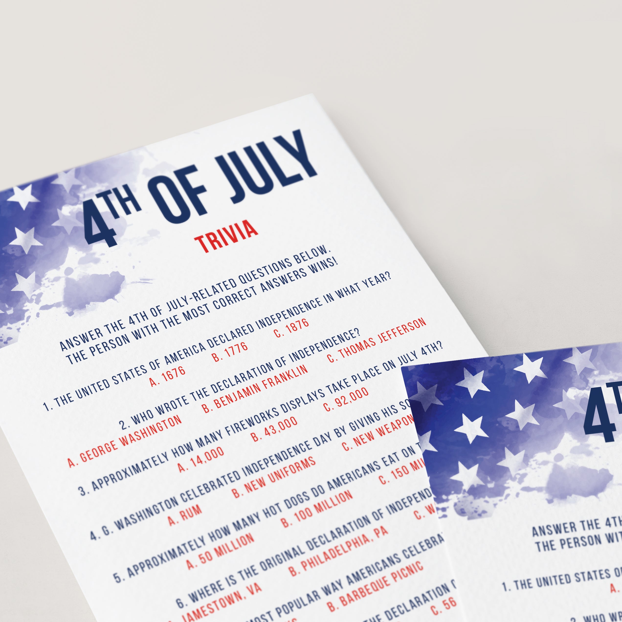 This printable 4th of July trivia quiz is an instant download. After purchase you will receive a download link immediately on screen. Also within minutes of your order and payment, an e-mail will be sent to you with a link for your download.