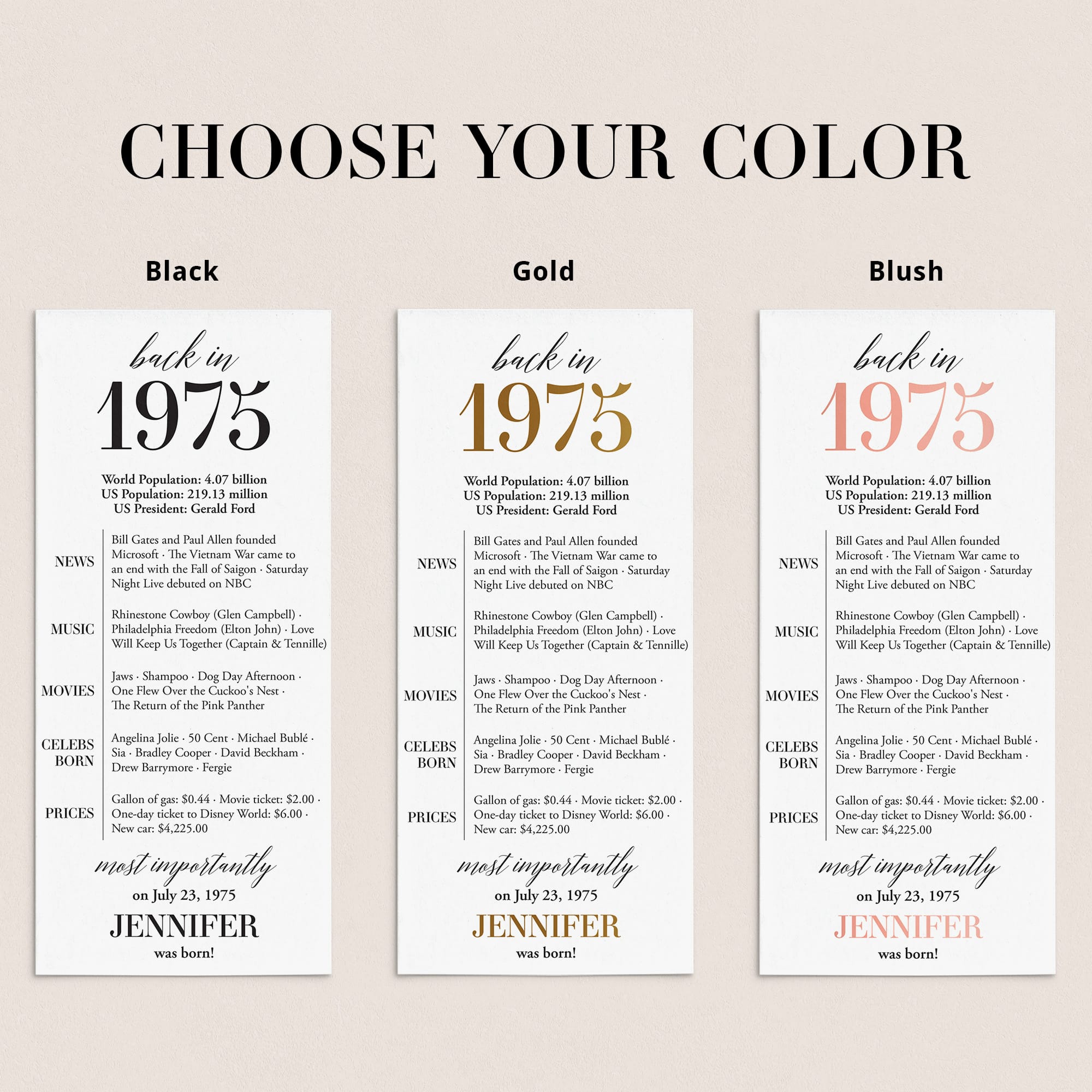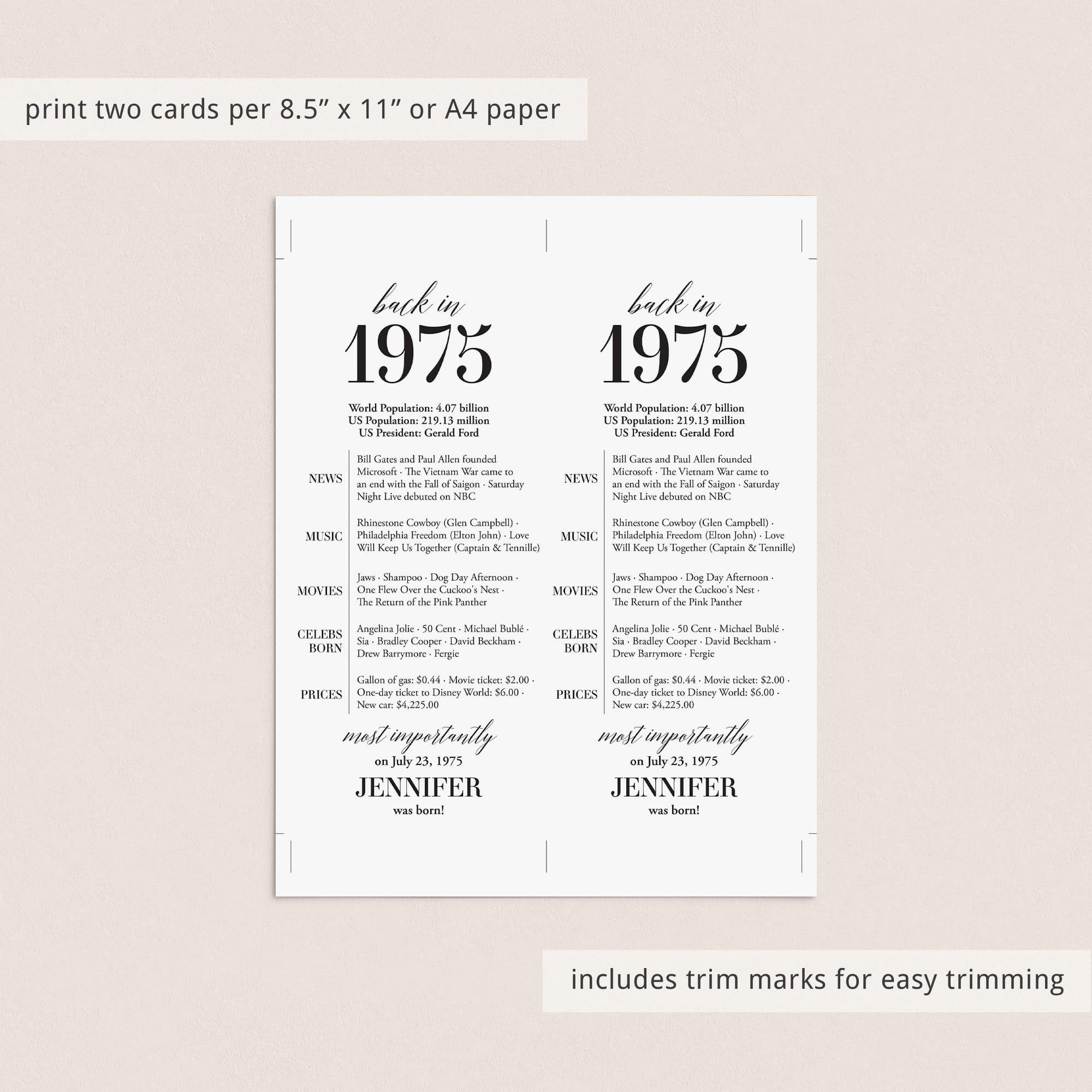 Are you looking for a simple yet elegant way to add a personal touch to a birthday celebration? Our “Back in 1975” table card is the perfect addition to any birthday party for someone turning 50 in 2025! This modern and minimalist card, personalized with the honoree’s name and birth date, showcases entertaining facts from 1975.