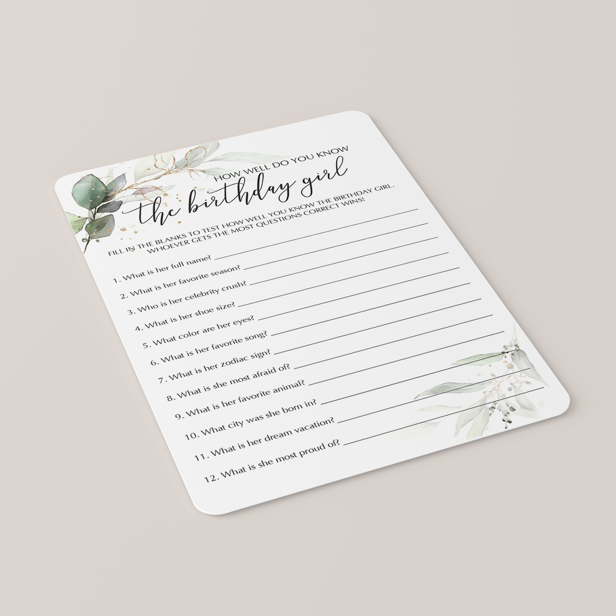 Test your birthday party guests how well they know the birthday girl and play ‘How well do you know the birthday girl’ with this greenery birthday trivia quiz. This birthday trivia is a great way to bring disparate people together and to put them all in a party mood. It's the perfect addition to your modern birthday party.