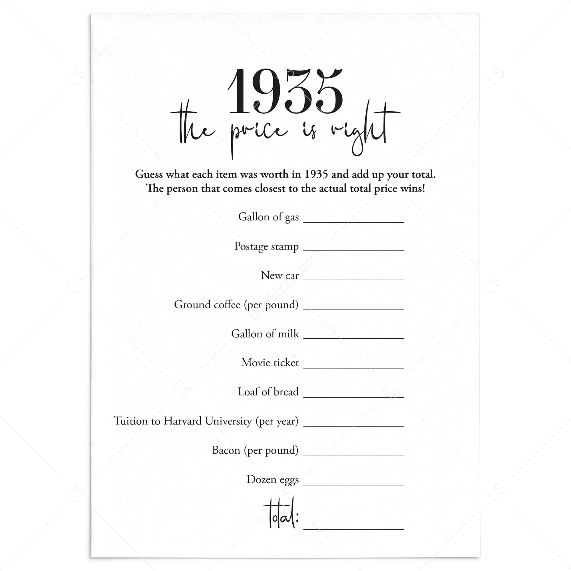 To determine the ultimate winner, simply add up everyone's guesses and see who comes closest to the actual total of these 1935 prices. It's a game of memory and estimation that will have your guests engaged and reminiscing about the good ol' days.