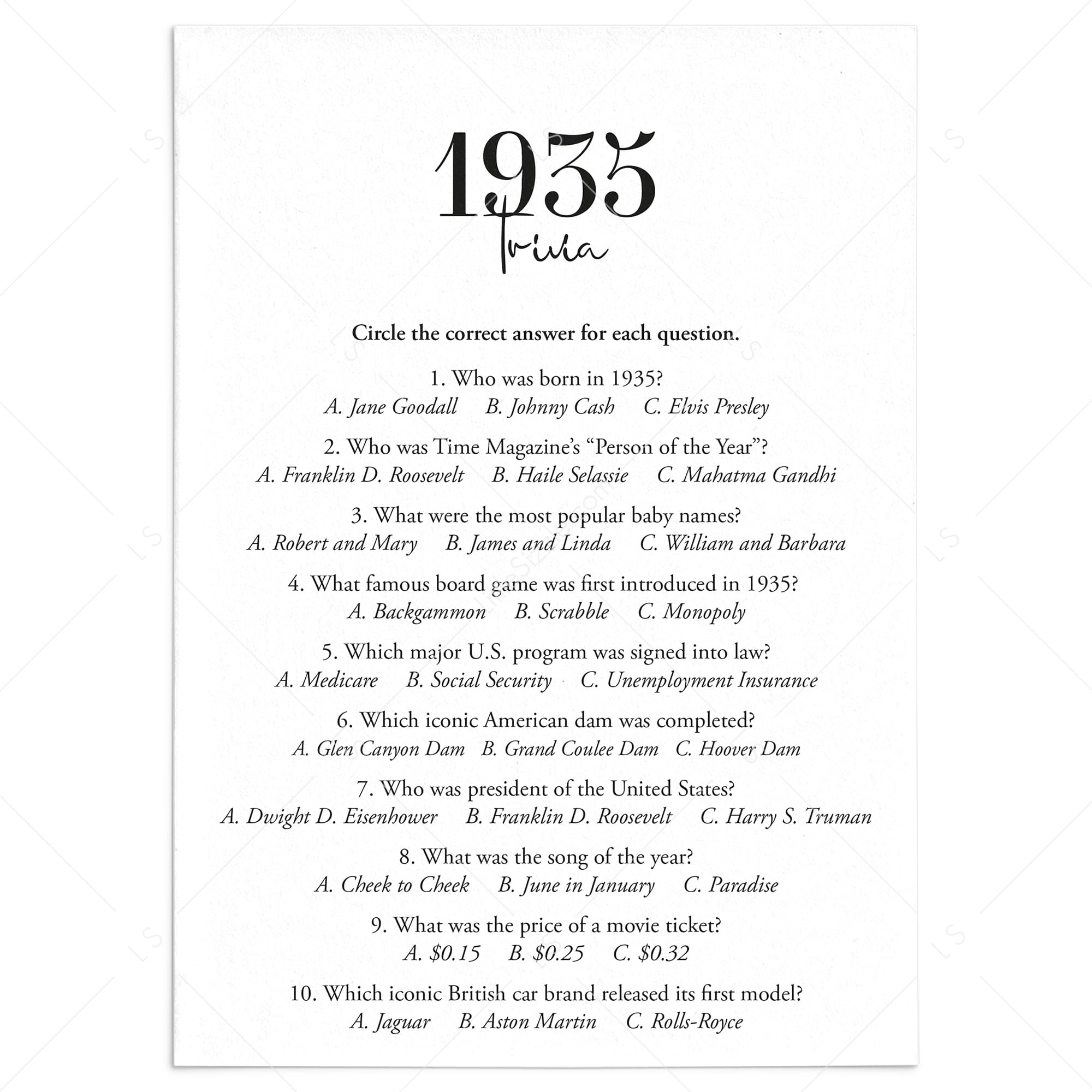 This 1935 trivia quiz is a digital download. After purchase you will receive a download link immediately on screen. Also within minutes of your order and payment, an e-mail will be sent to you with a link for your download.