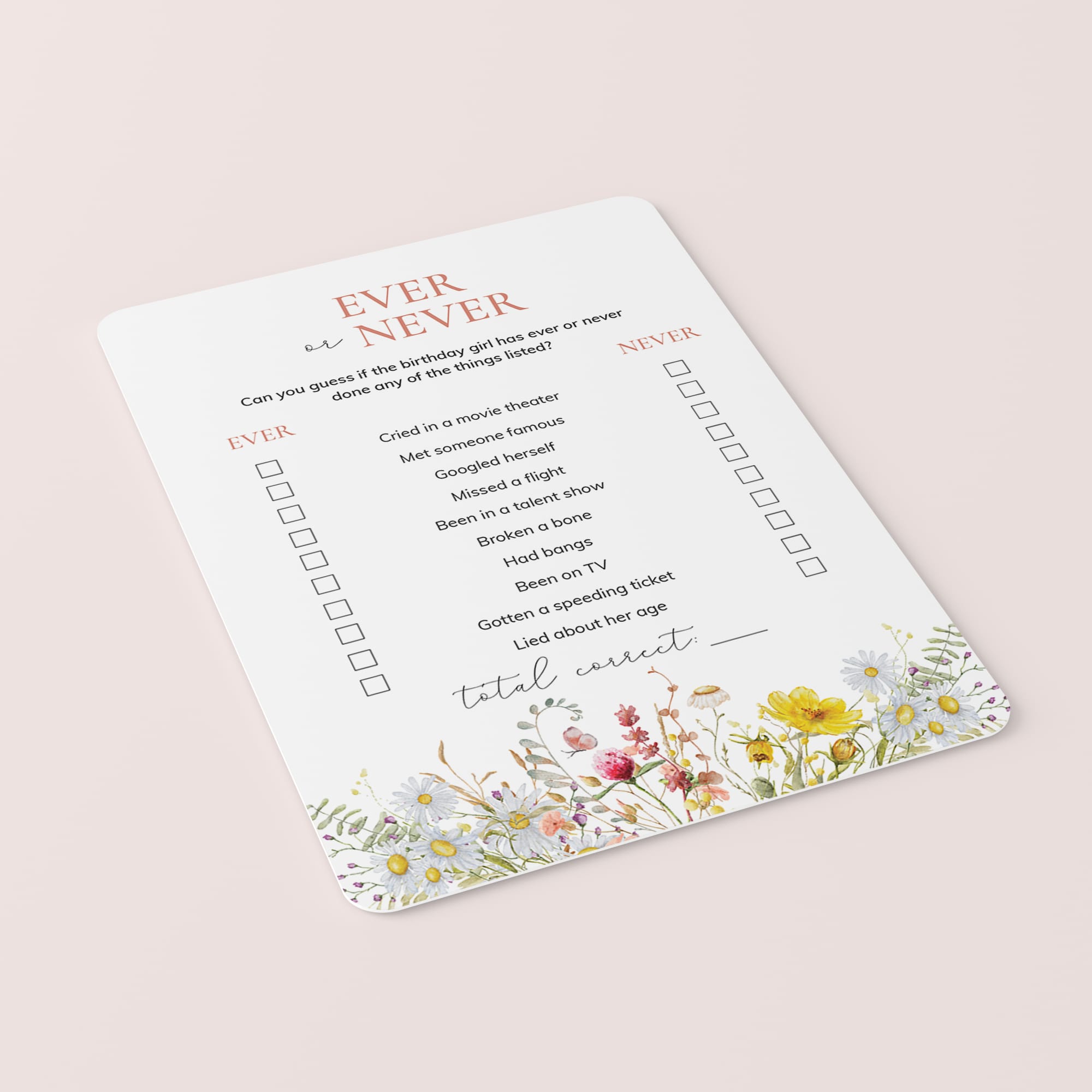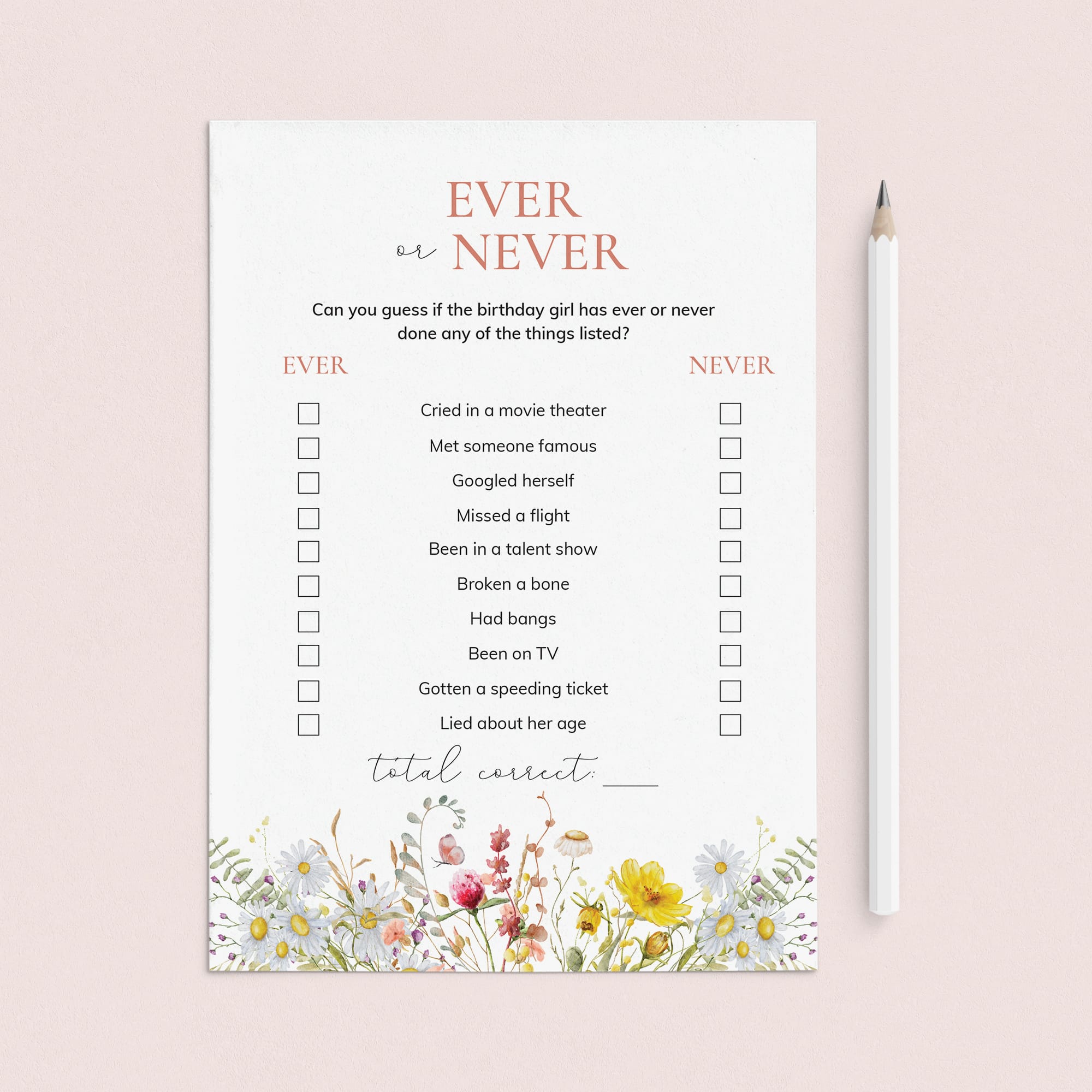 Are you looking for a hilarious birthday game for her? Play Ever or Never! Whether you're celebrating your BFF's 30th birthday, your co-worker's turning "forty and fabulous," or your mother's turning 57 for the twelfth time, this fun and easy birthday party game with gorgeous watercolor wildflowers will have guests reminiscing of years gone by.