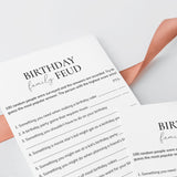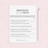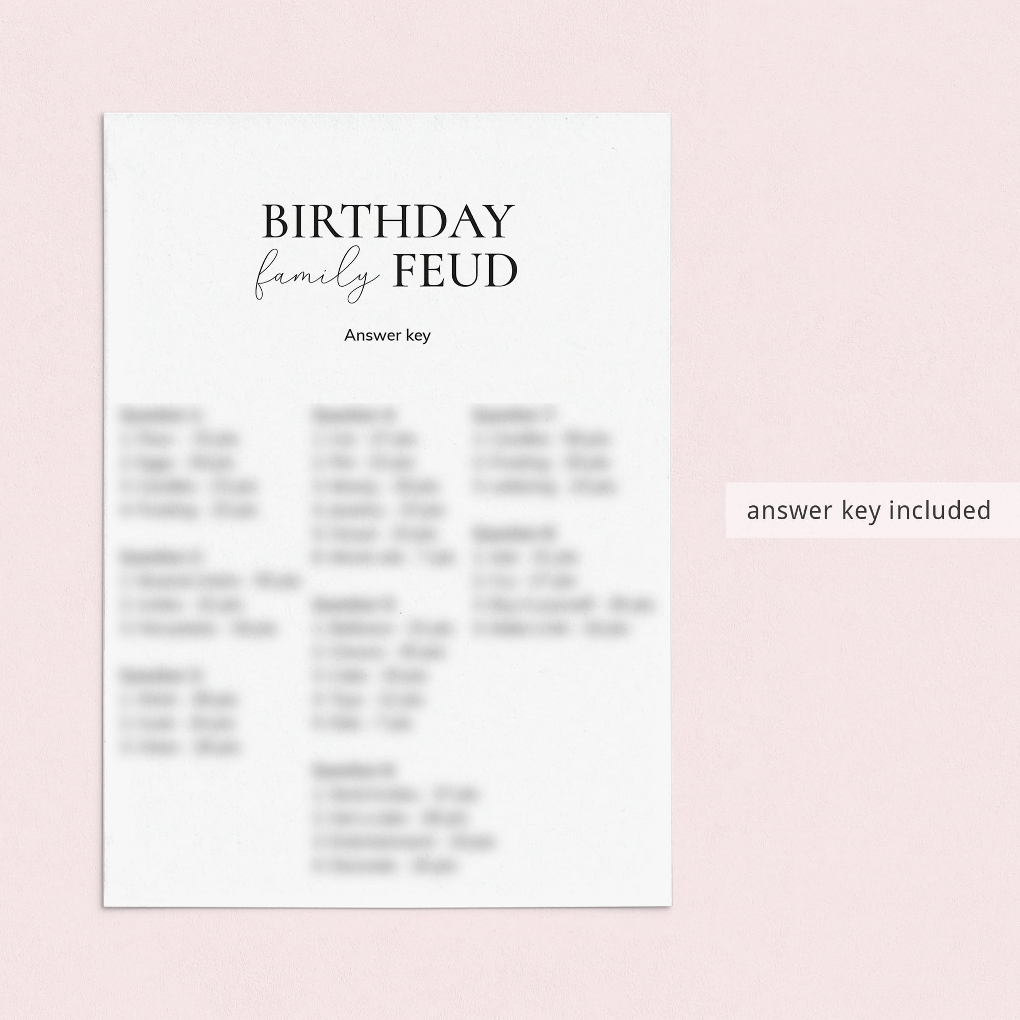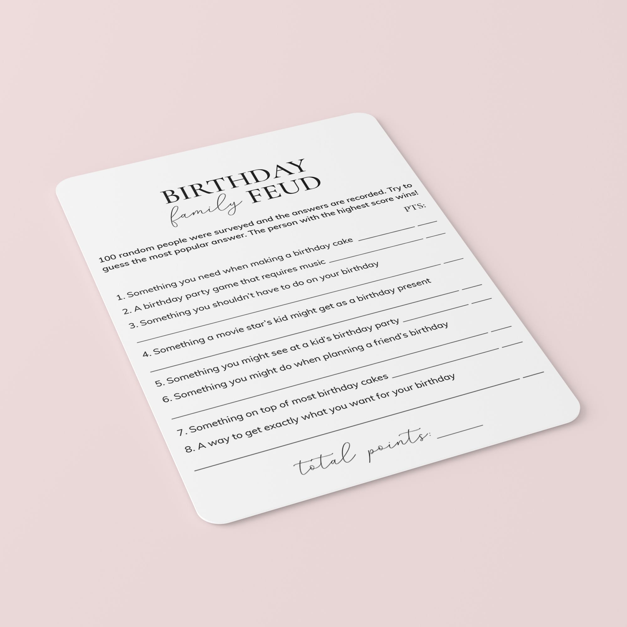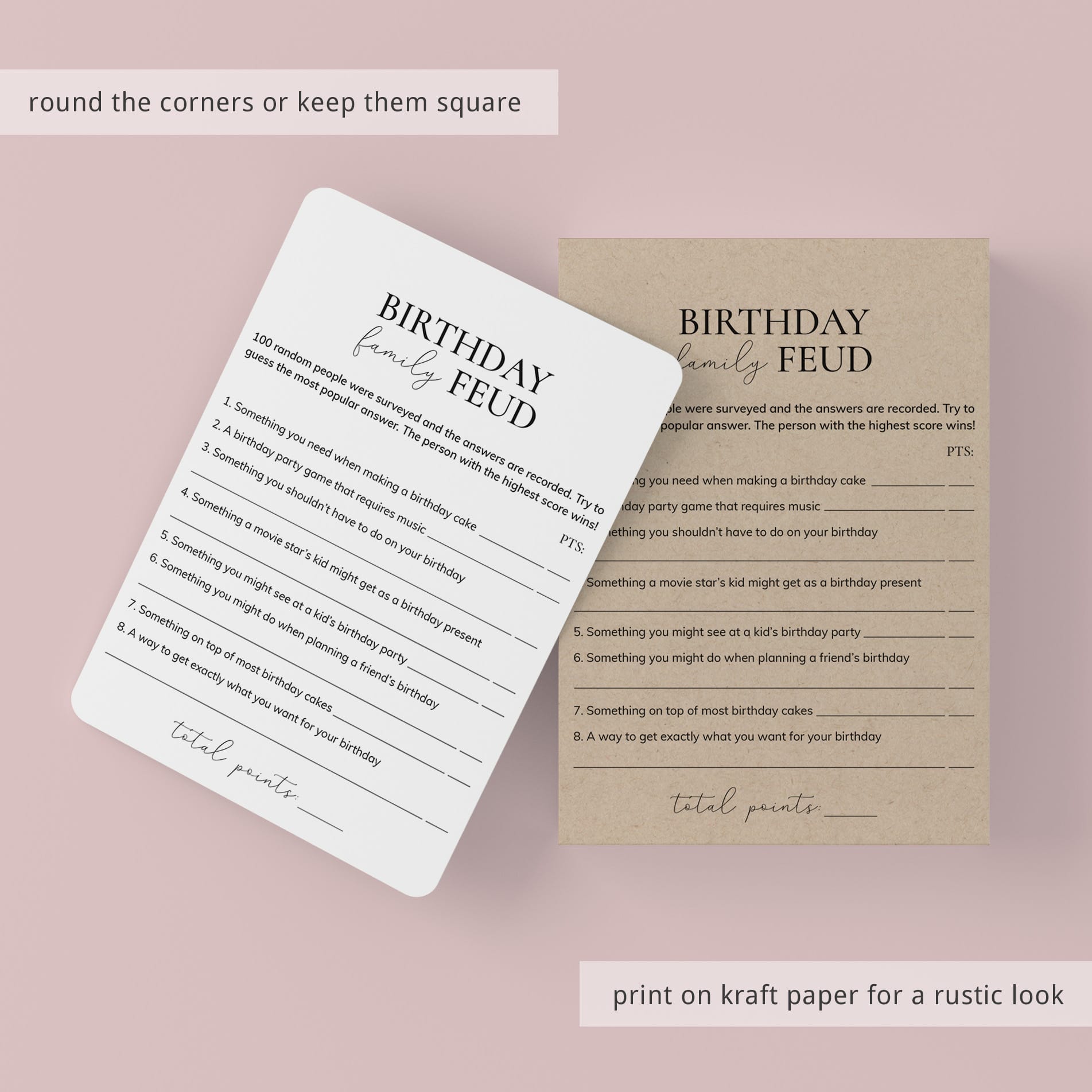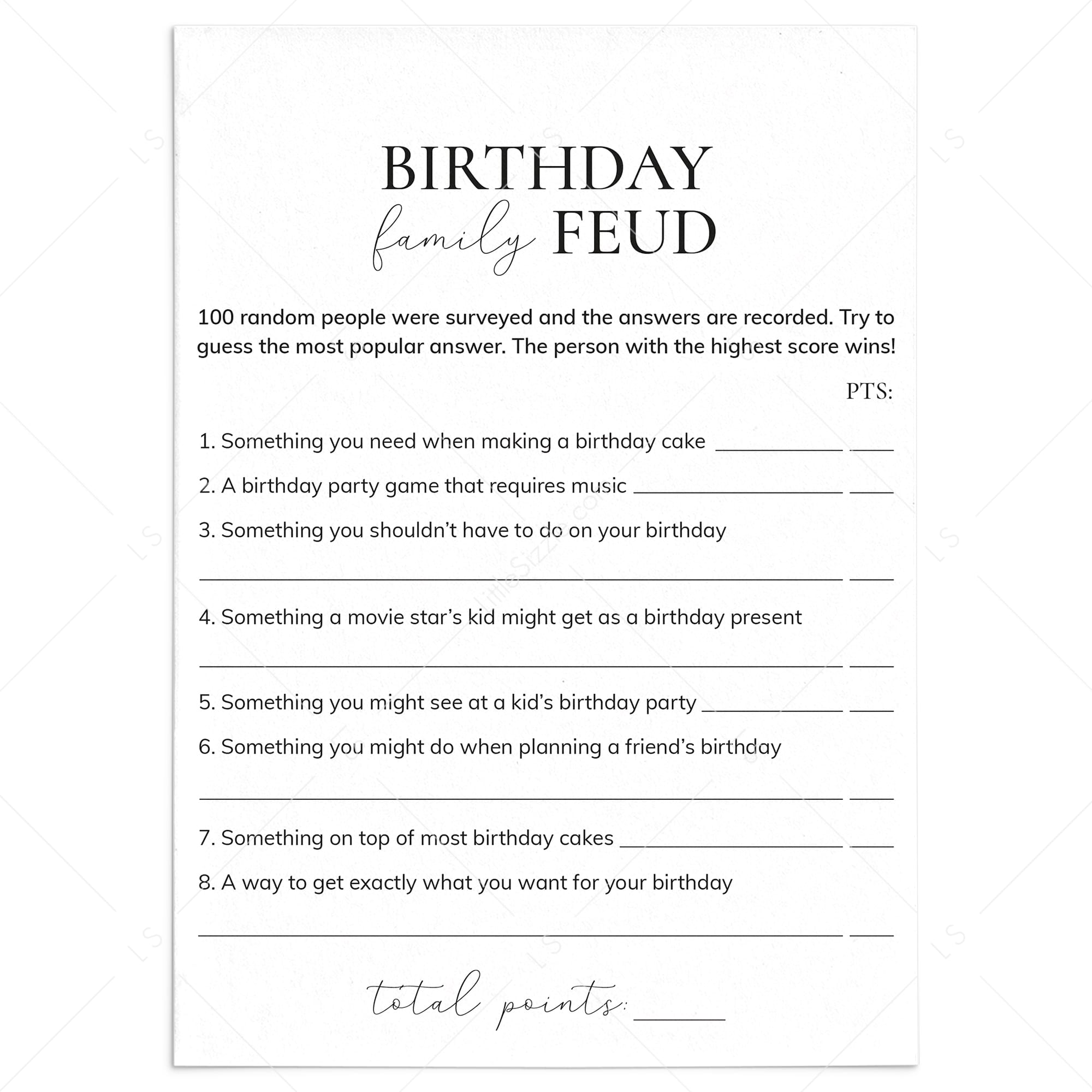 Add some fun to your birthday party with this minimalist Birthday Family Feud game. Family Feud is one of the best games ever. Have your friends and family compete to guess the most popular answer to these 8 birthday feud questions. An answer key with Birthday Feud answers and points is included. The person or team with the highest score wins!