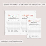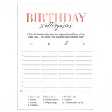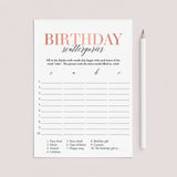 How many words can you fill in with the letters "C", "A", "K" and "E"? Play Birthday Scattergories at your women's birthday party with these modern blush game cards to ensure lots of fun and laughter. It's a great game for all ages and the design will fit any women's birthday party theme.