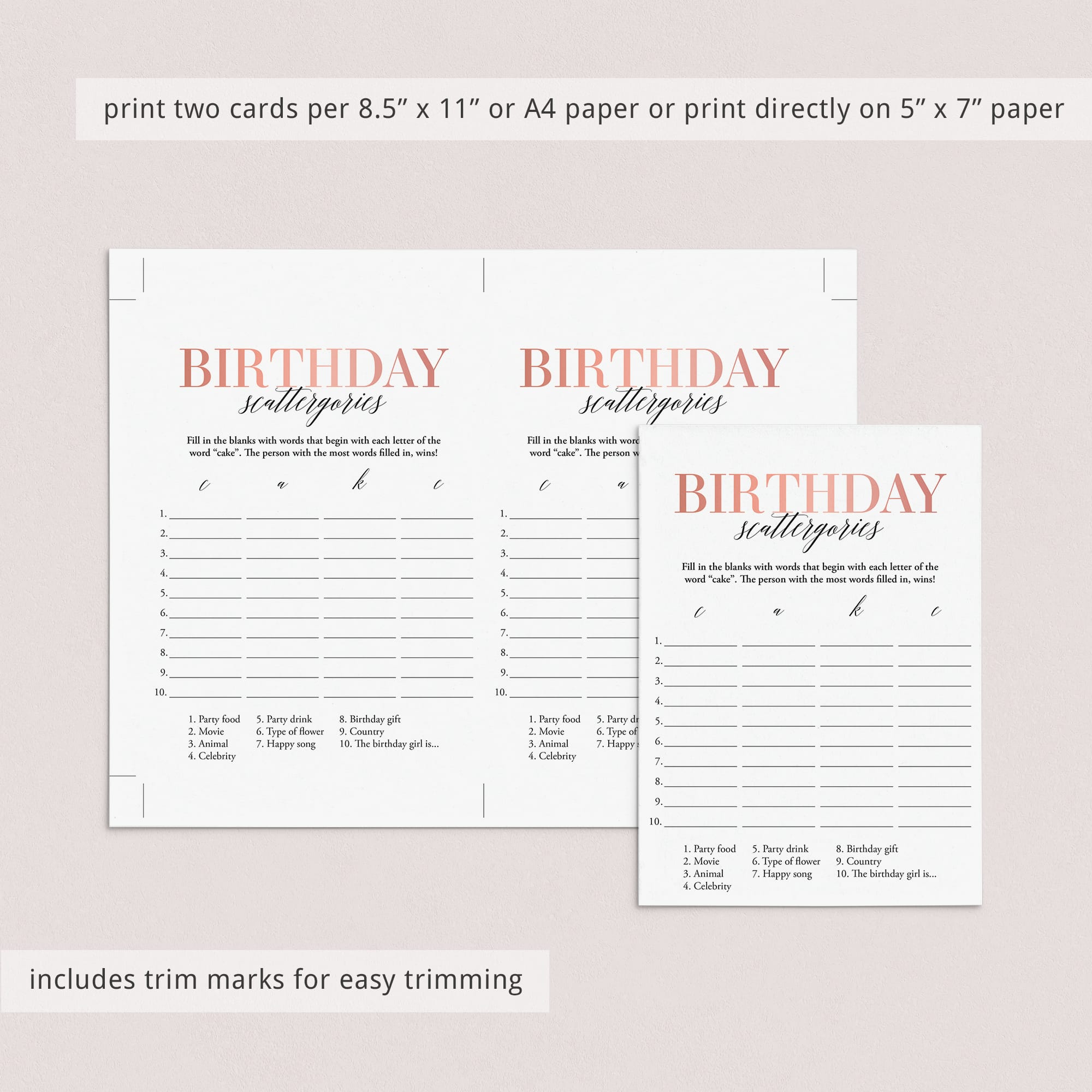 How to play the Birthday Scattergories game? Simply hand out a game sheet and a pen to your guests. They will have to come up with as many words related to the categories at the bottom of the sheet. The difficulty is that the words must begin with the letters in the word "CAKE". The person that gets the most answers filled in within the set time, wins!