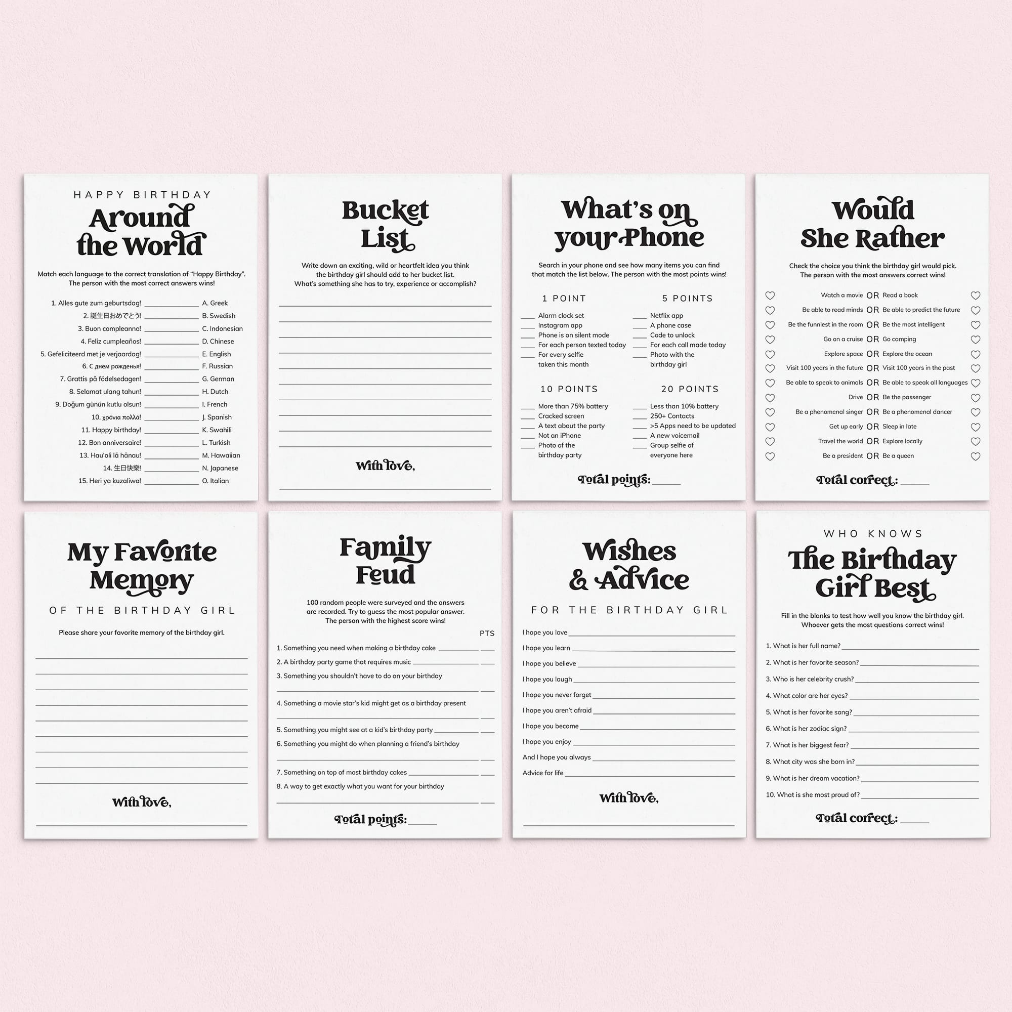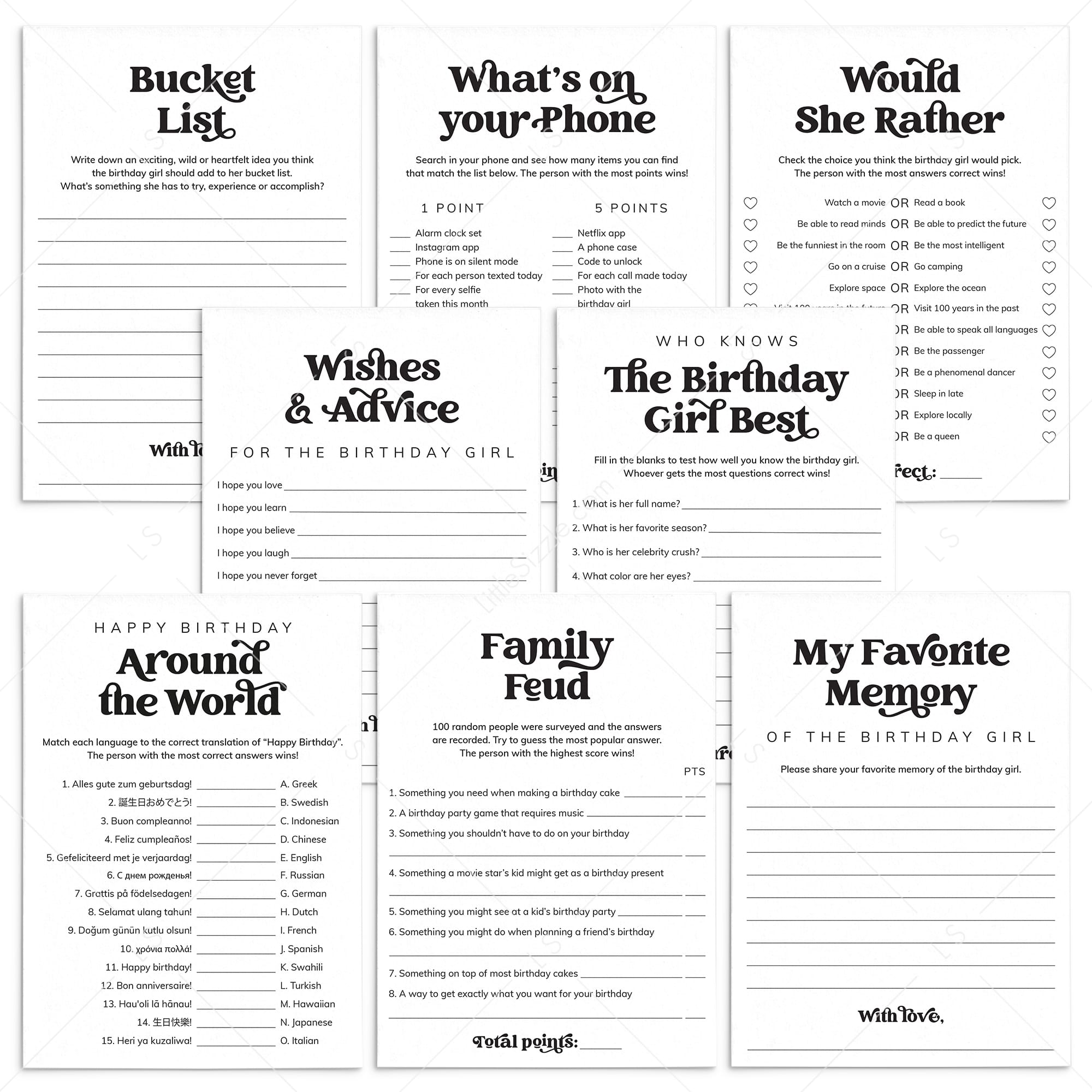 Add extra fun to her celebration with this Birthday Games Bundle for Her! Designed with a creative vintage script and classic black and white style, these 8 party games are a perfect match for any birthday theme. With popular activities like 'Who Knows the Birthday Girl Best' and 'Wishes and Advice for the Birthday Girl,' this bundle is perfect for a fun and memorable gathering with friends and family.