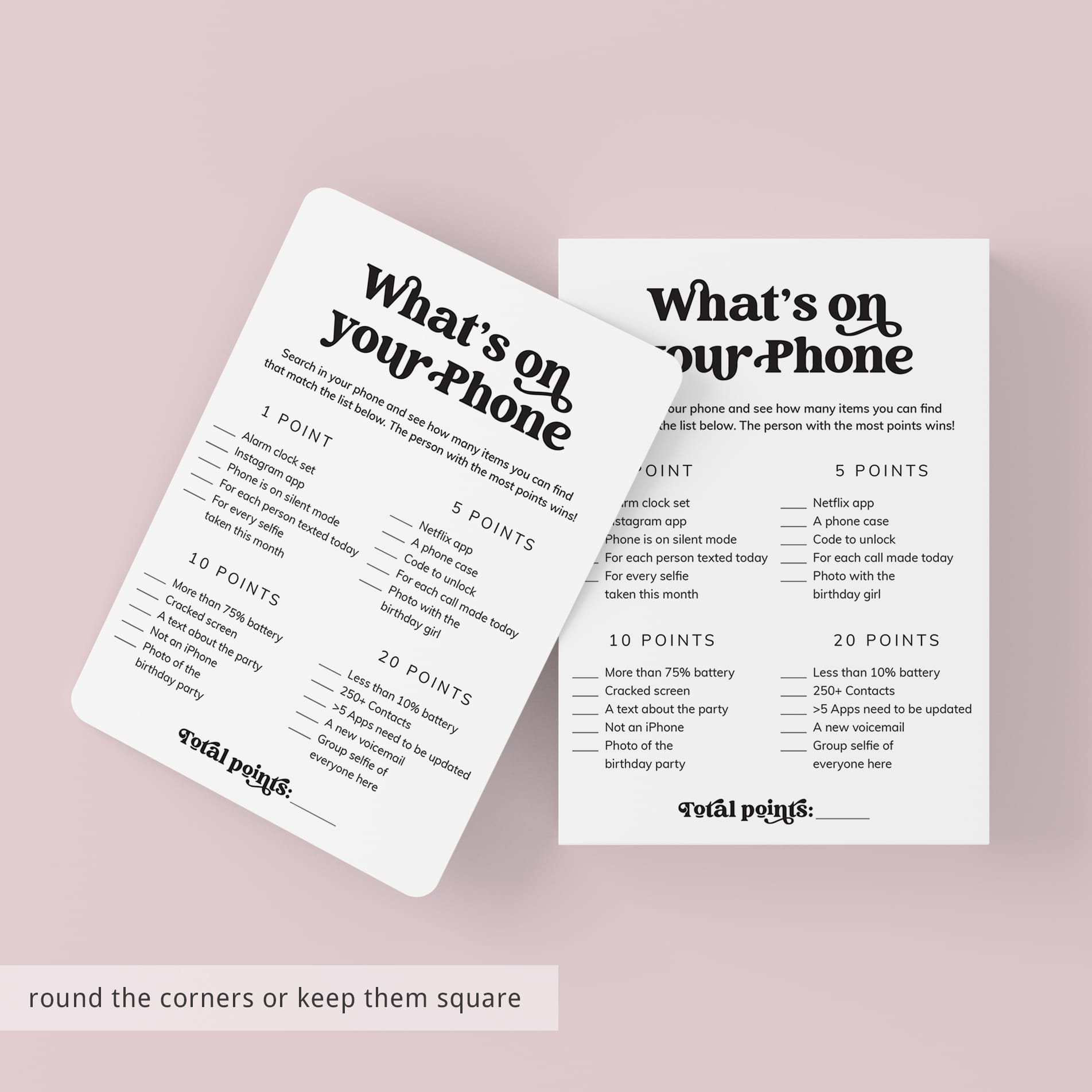 Print the games right from your computer in a matter of minutes or have the cards printed at your favorite print shop. The games have been designed in black and white. You can print on kraft paper to create a rustic look or print on colored card stock to match your party color palette. We recommend printing on a nice heavy card stock for highest quality feel.