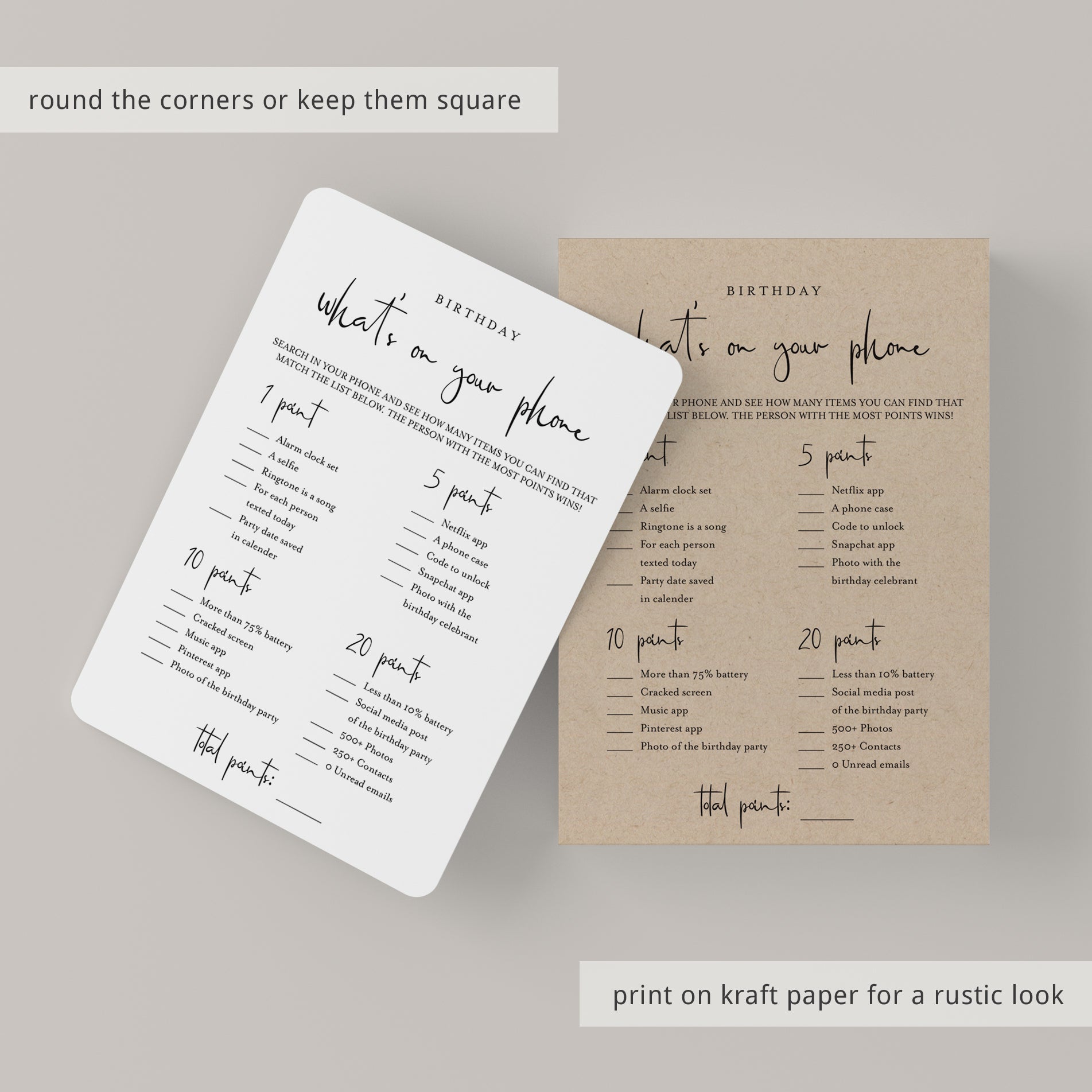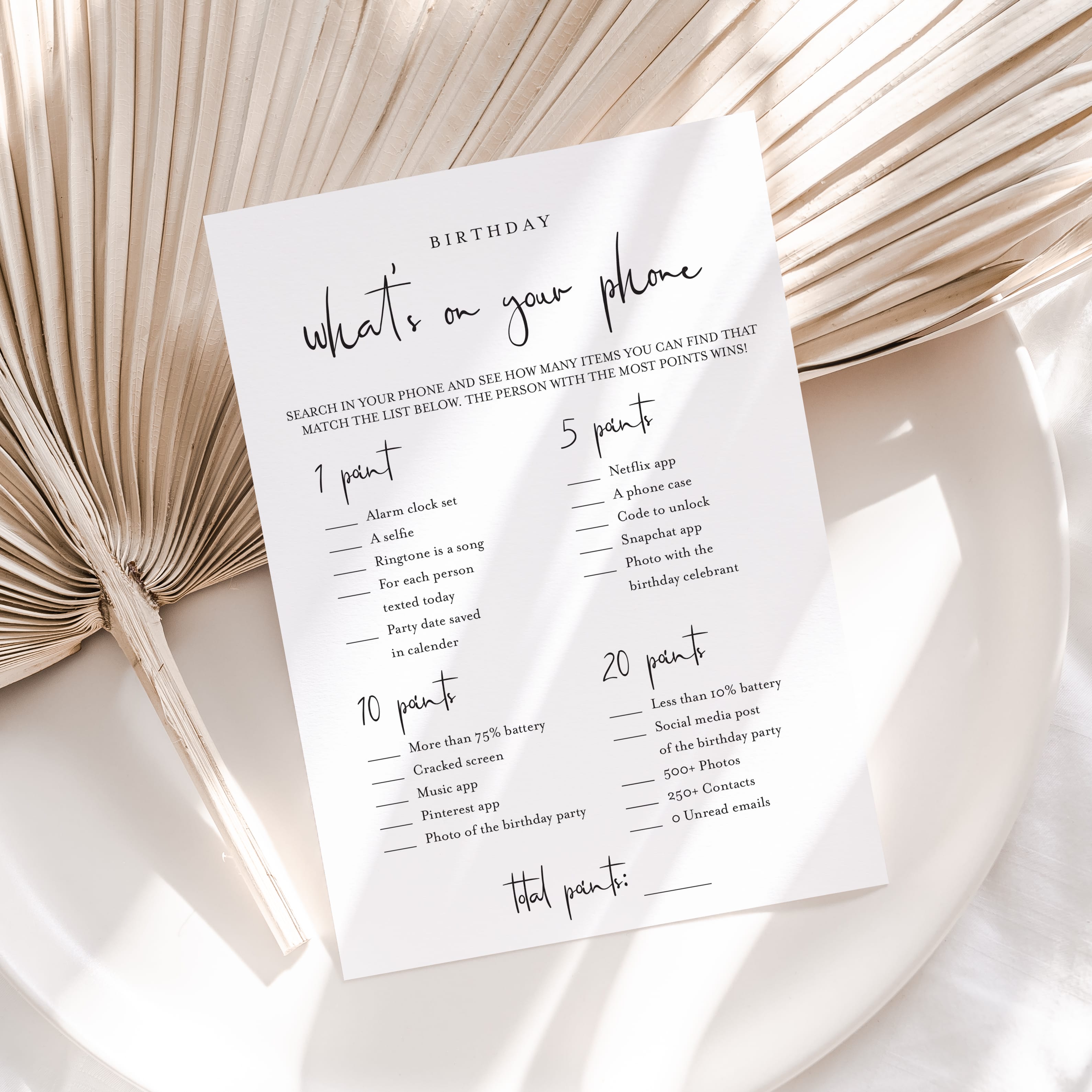 What’s On Your Phone is similar to the What’s In Your Purse game, but instead of searching for the items physically, your guests will just search for the listed items using their phone. They earn points for each item that they have in their phone.