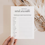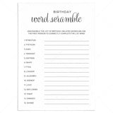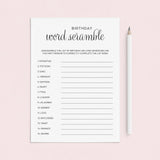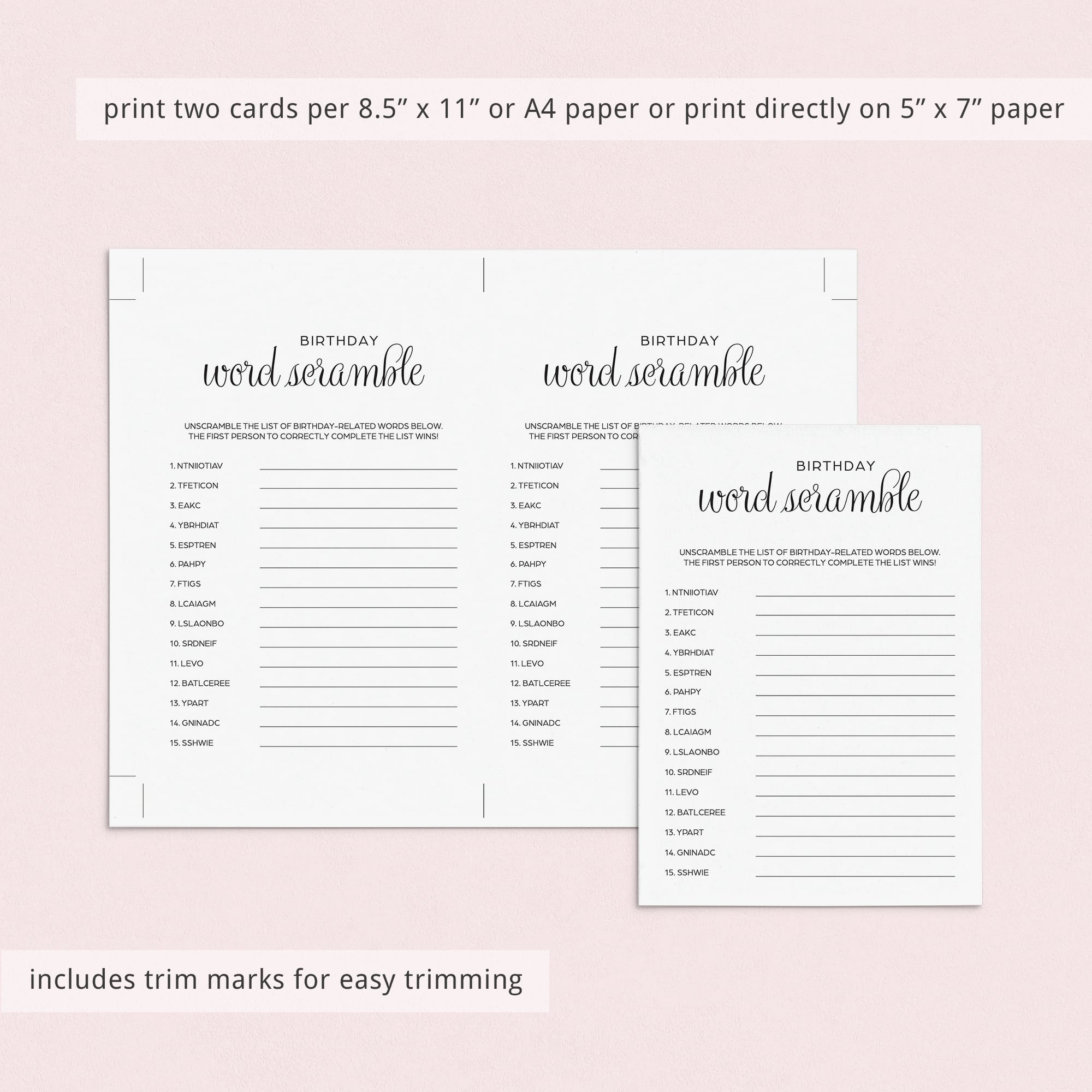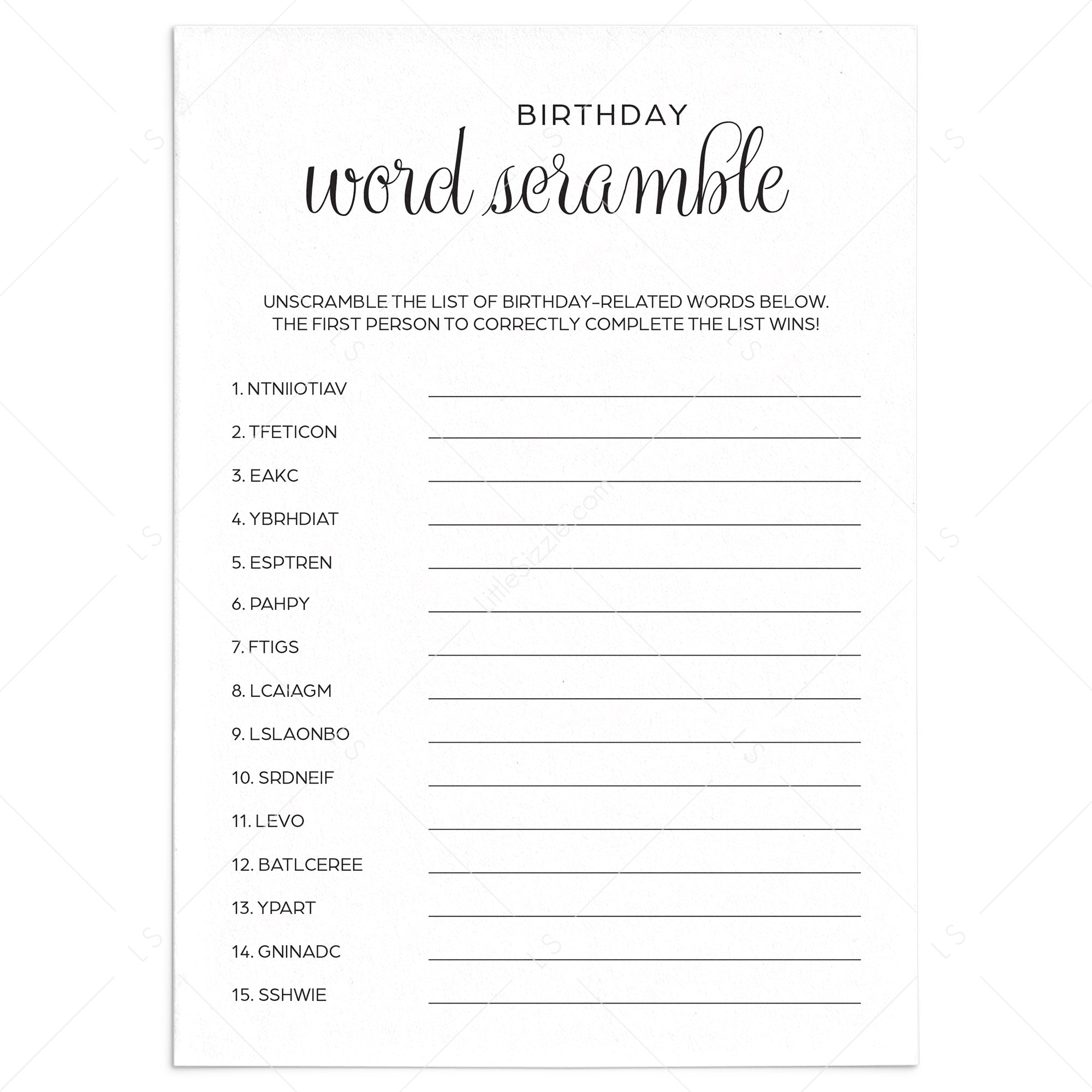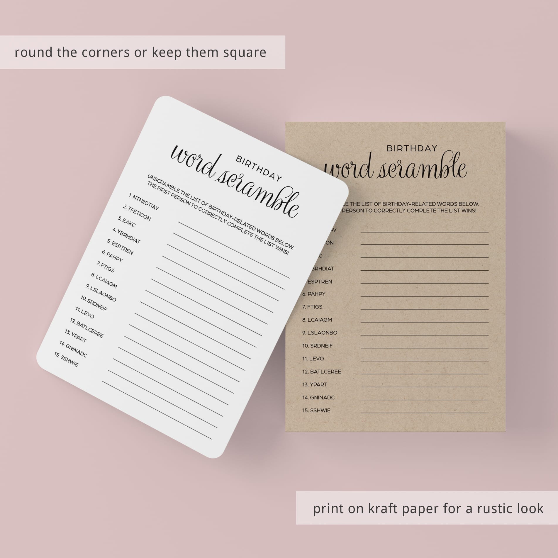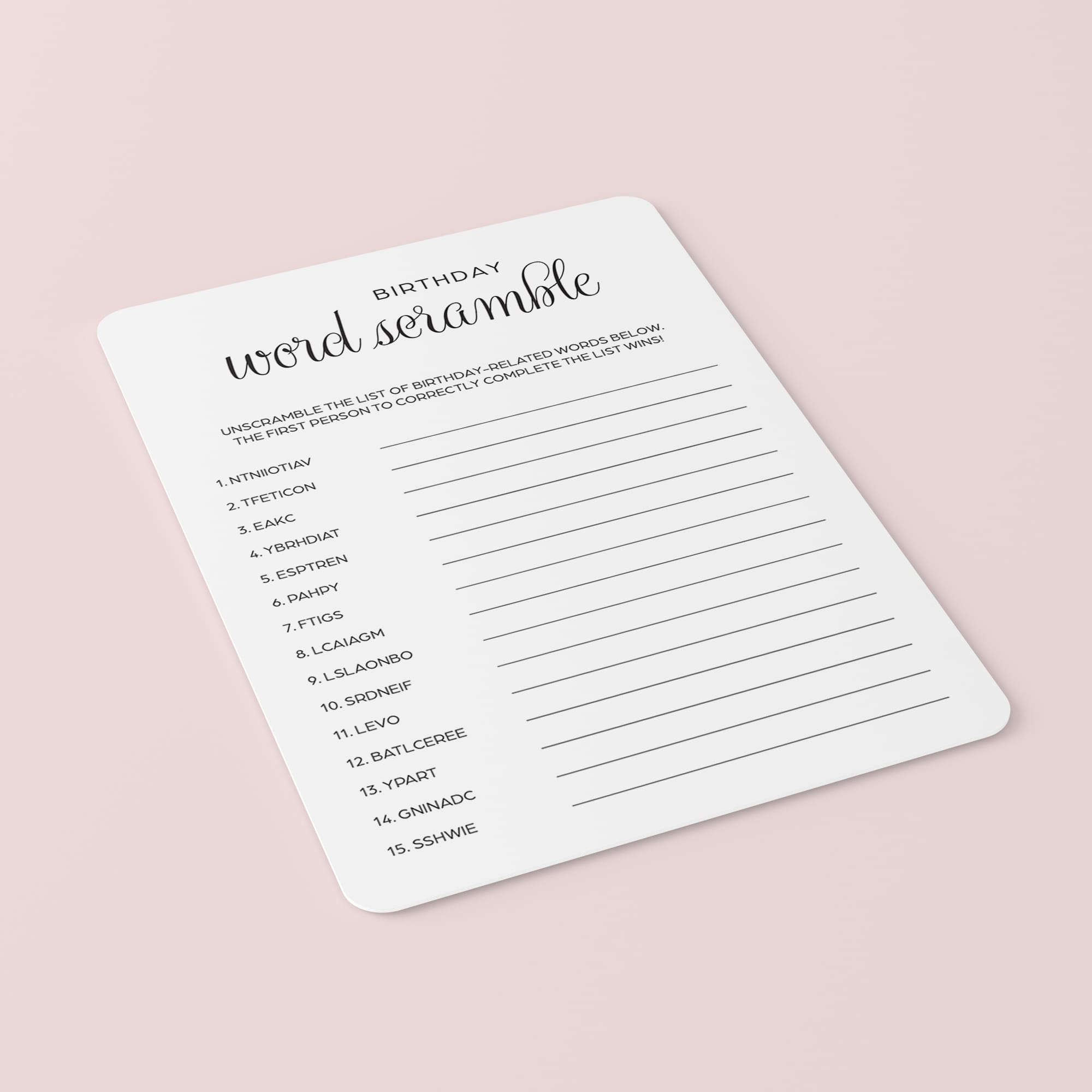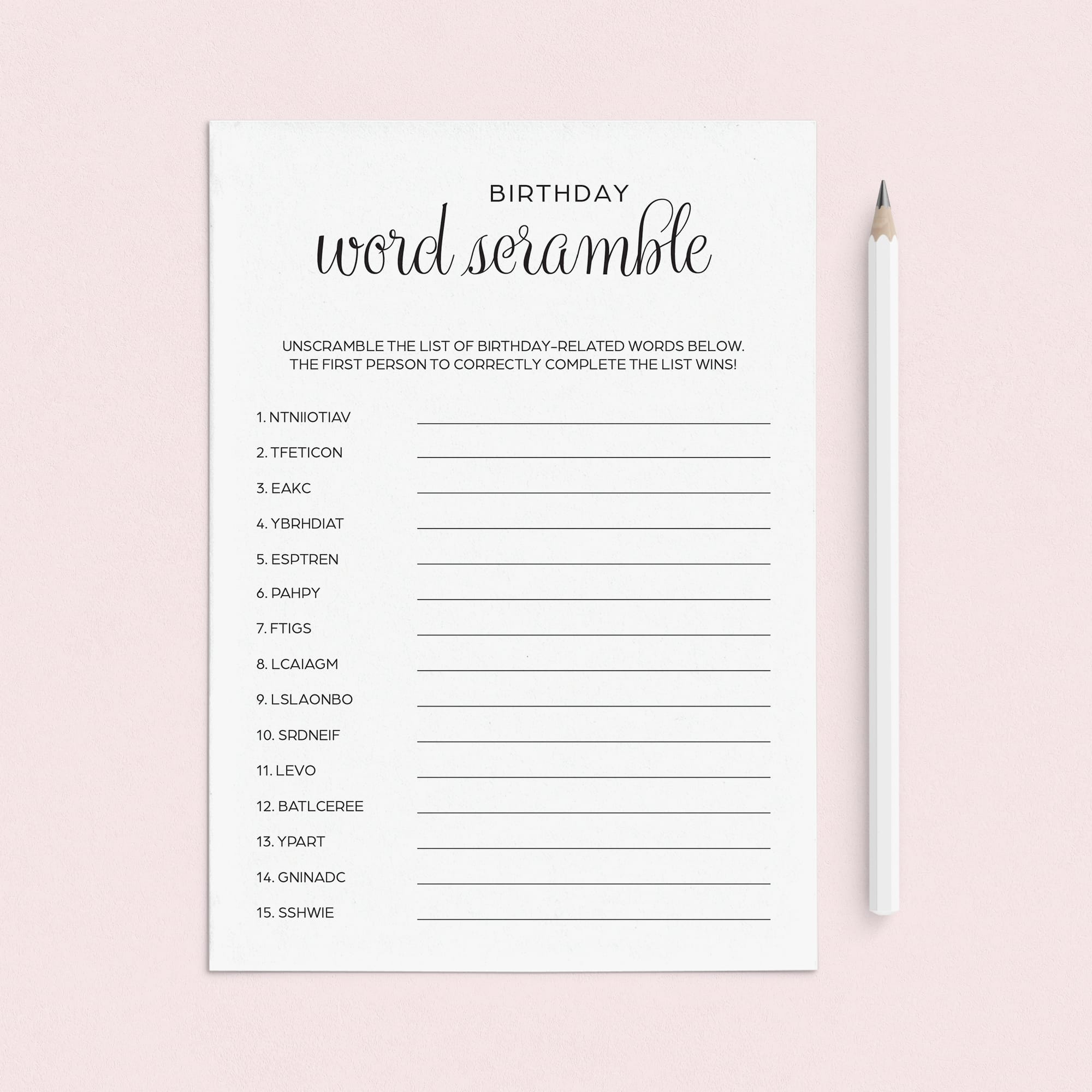 Play one of the most popular party games with this black and white Birthday Word Scramble game. The birthday game has a calligraphy script, but with a modern updated twist; a casual, whimsical, fun look that will fit any birthday party theme. This game will create a fun and enjoyable moment for all of your guests.