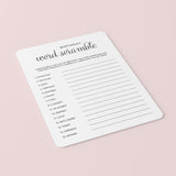 Print the game right from your computer in a matter of minutes or have the game cards printed at your favorite print shop. The party game has been designed in black and white. You can print on kraft paper to create a rustic look or print on colored cardstock to match your party color palette. We recommend printing on a nice heavy card stock for highest quality feel.