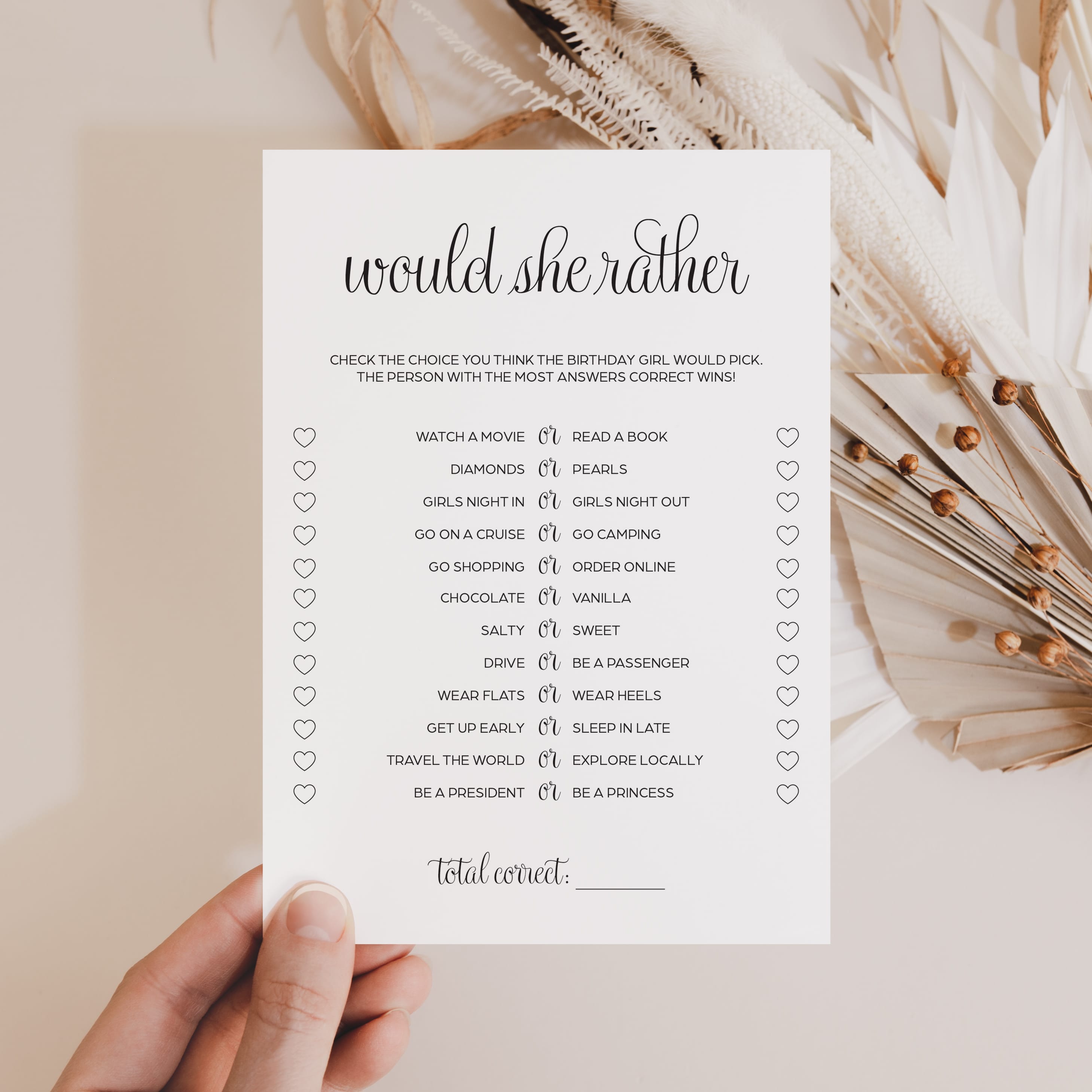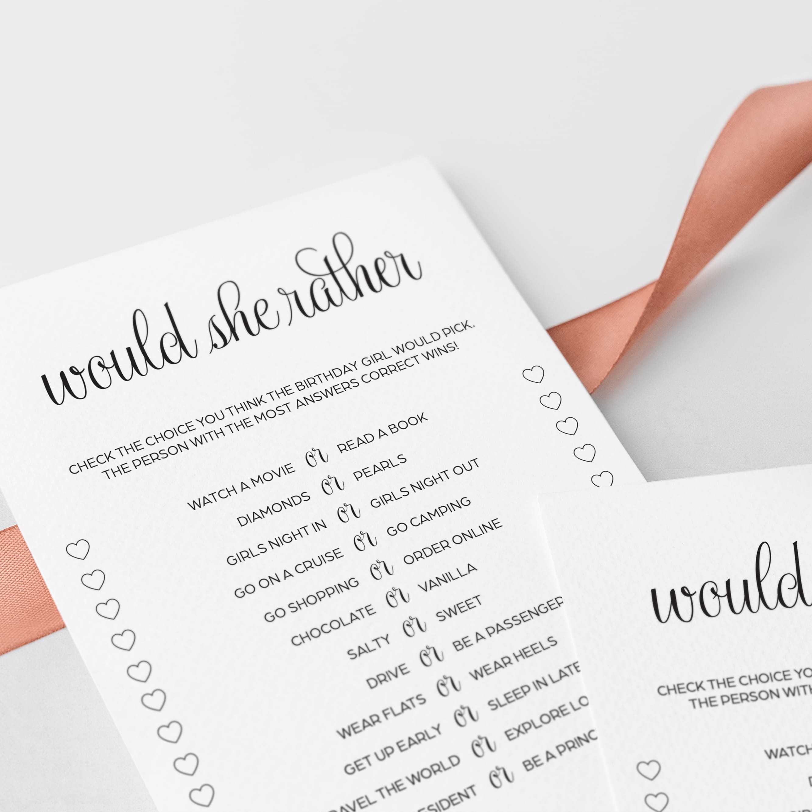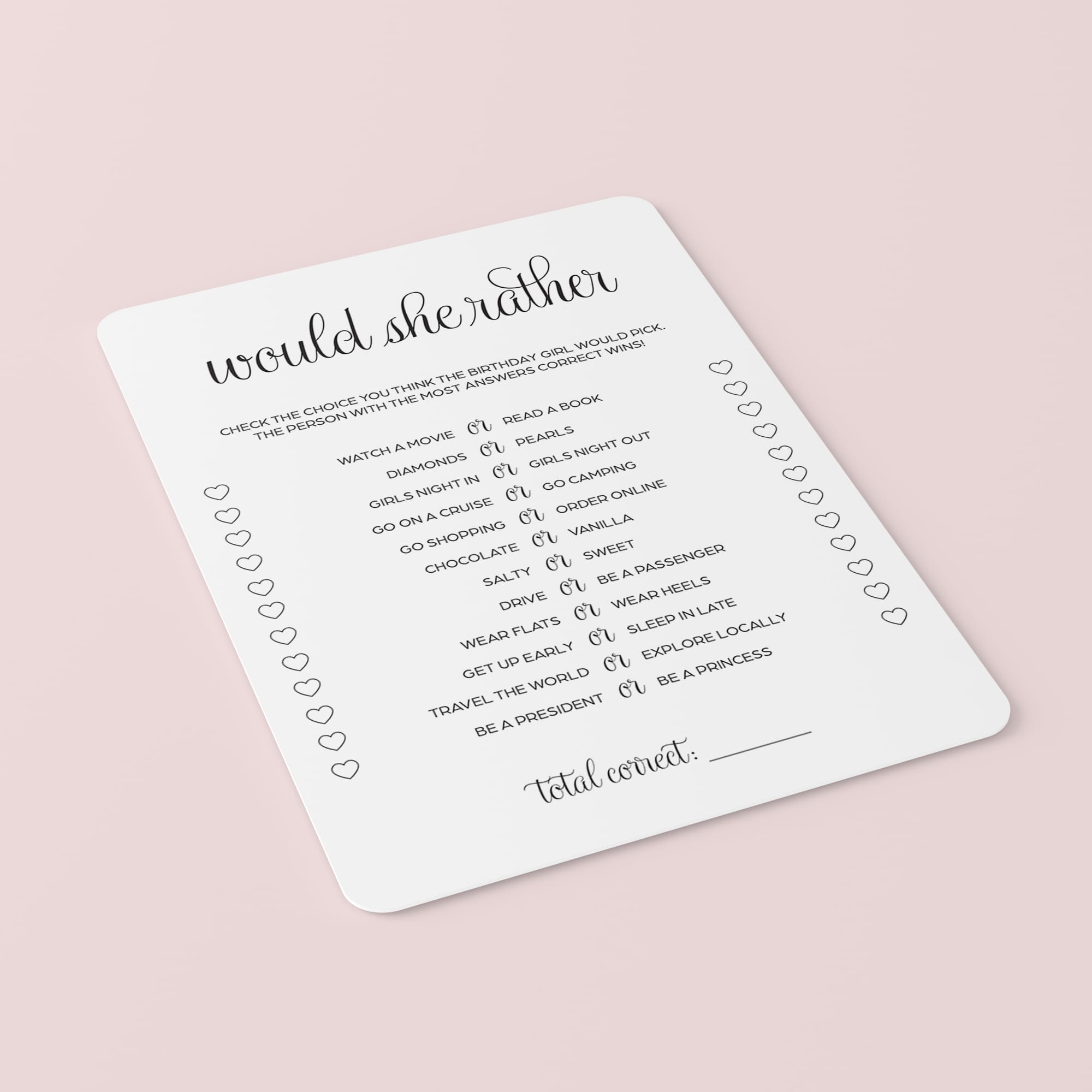 Play this fun birthday Would She Rather game and WOW your guests with your elegant game cards!