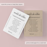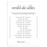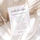 Are you looking for the perfect ice breaker to get people talking and in the party mood for your birthday party? Play Birthday Would She Rather! After all, your guests have one thing in common: you know the birthday girl. This black and white Would She Rather birthday game with calligraphy script is the perfect addition to your women's birthday party.