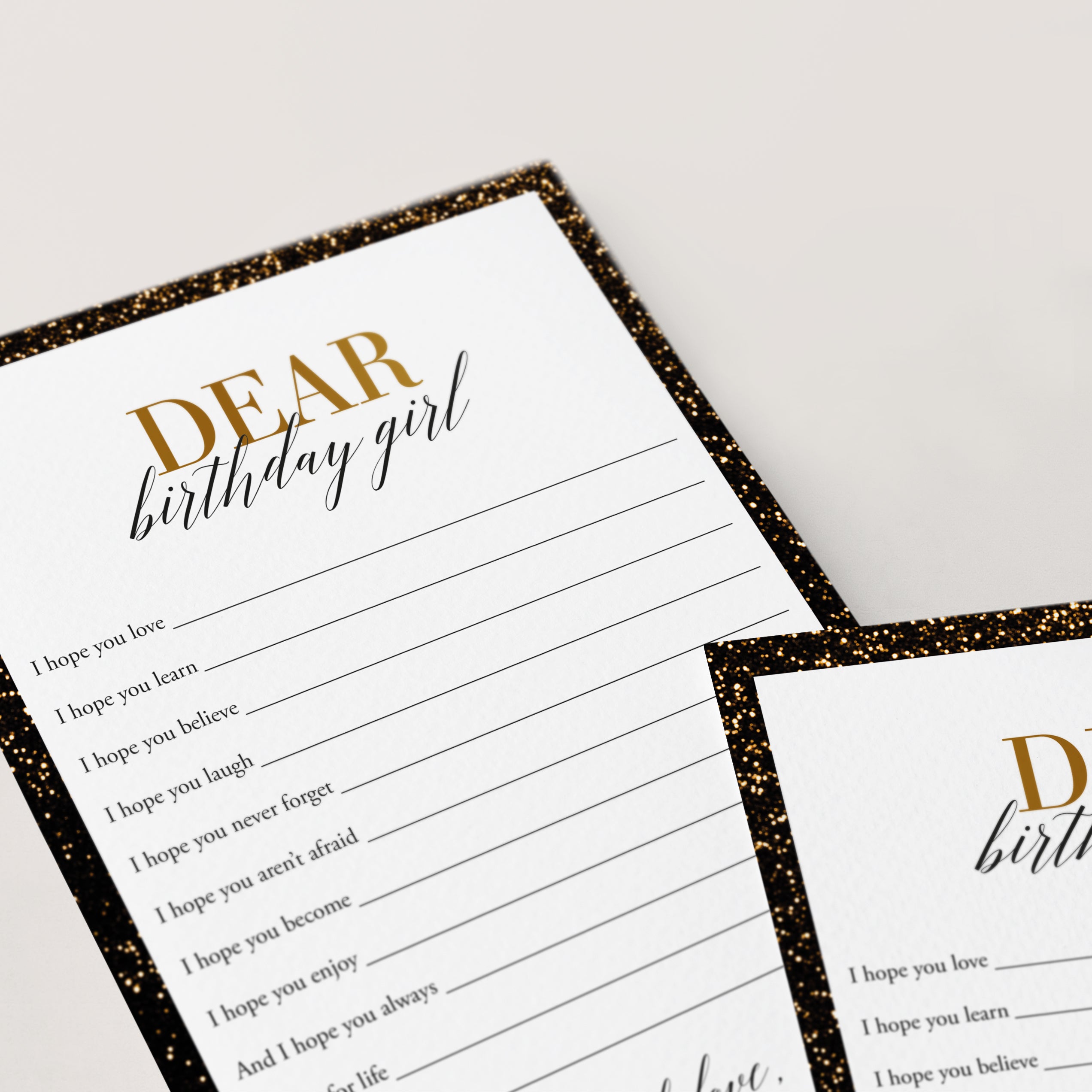 Create an amazing keepsake for the birthday girl with these black and golden glittery Wishes for Birthday Girl cards. The elegant and sparkly birthday wishes cards will fit any women's birthday party theme. Let every guest write down their wishes for the birthday girl and collect the cards for the lucky gal.