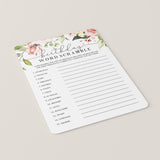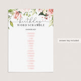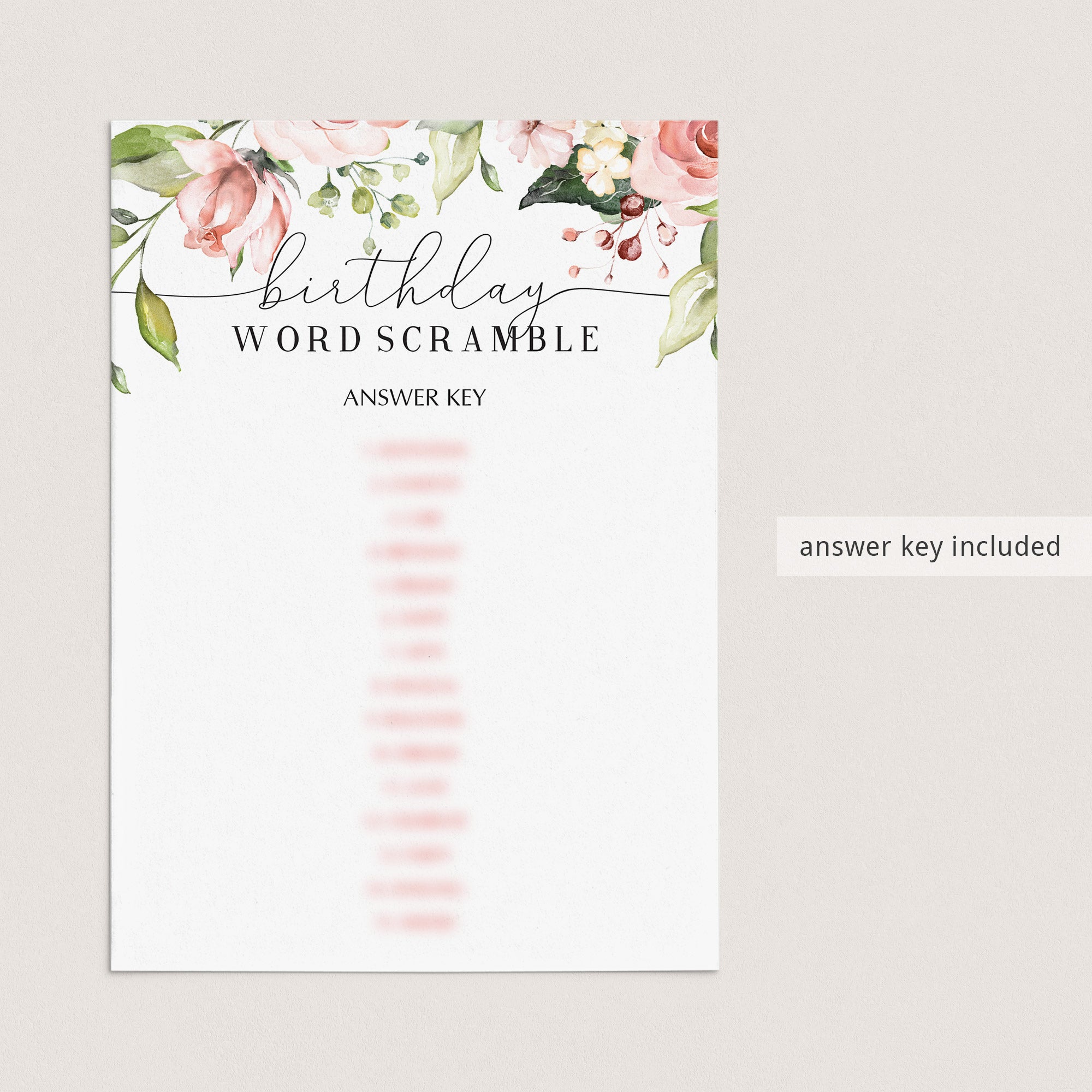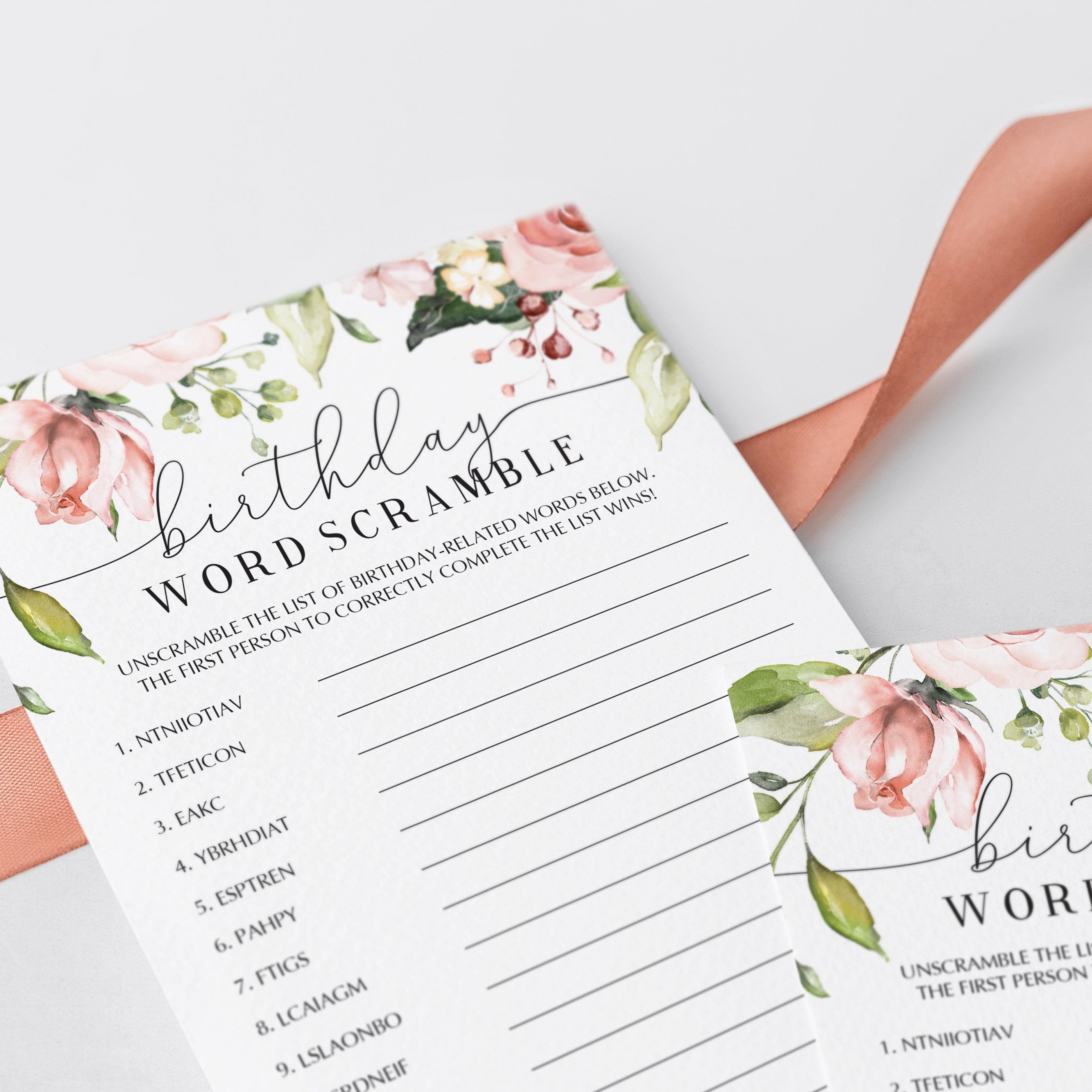 Play one of the most popular party games with this gorgeous blush floral Birthday Word Scramble game with watercolor flowers. This game is the perfect addition to your floral birthday party for her and will create a fun and enjoyable moment for all of your guests. It is a fun and easy game for kids and adults.