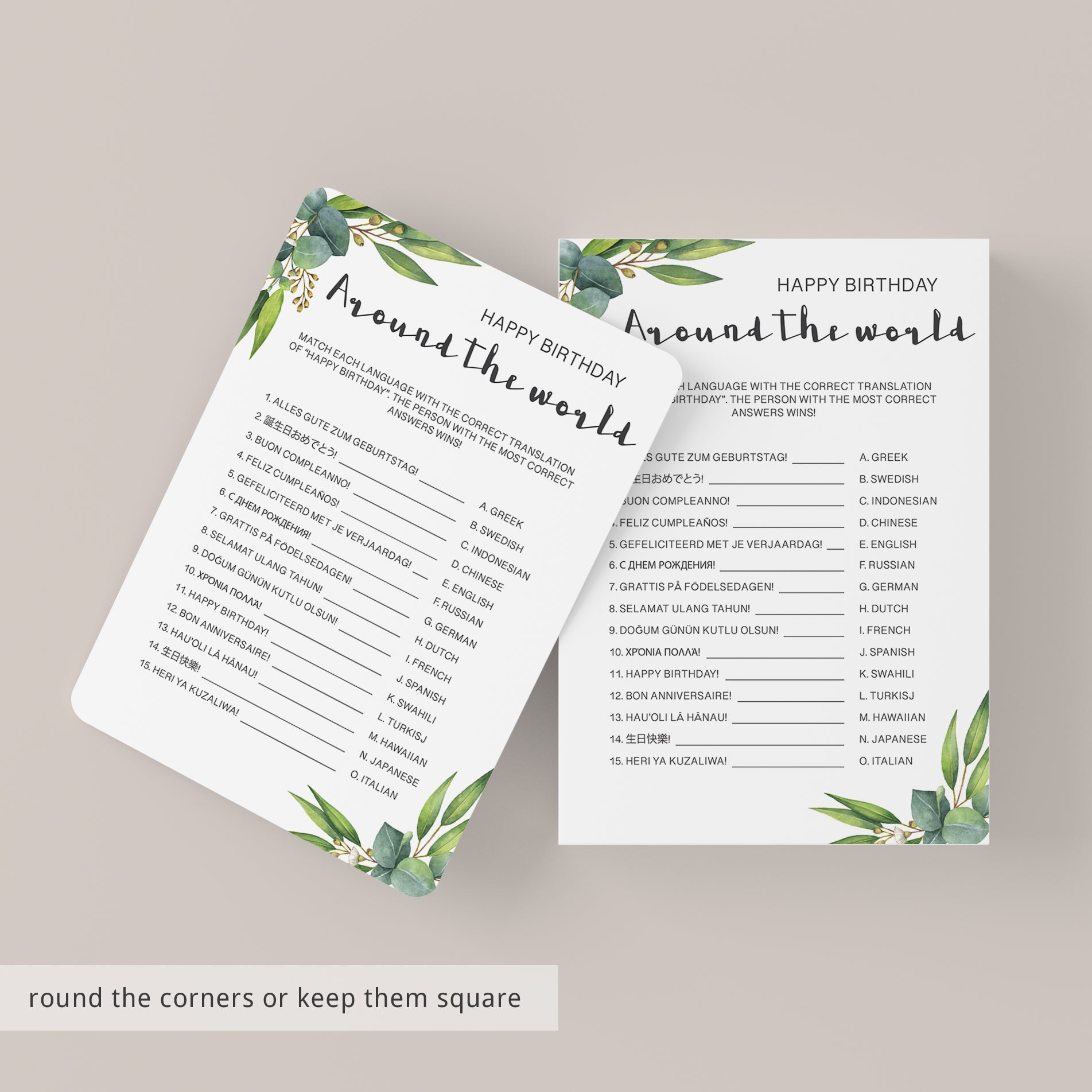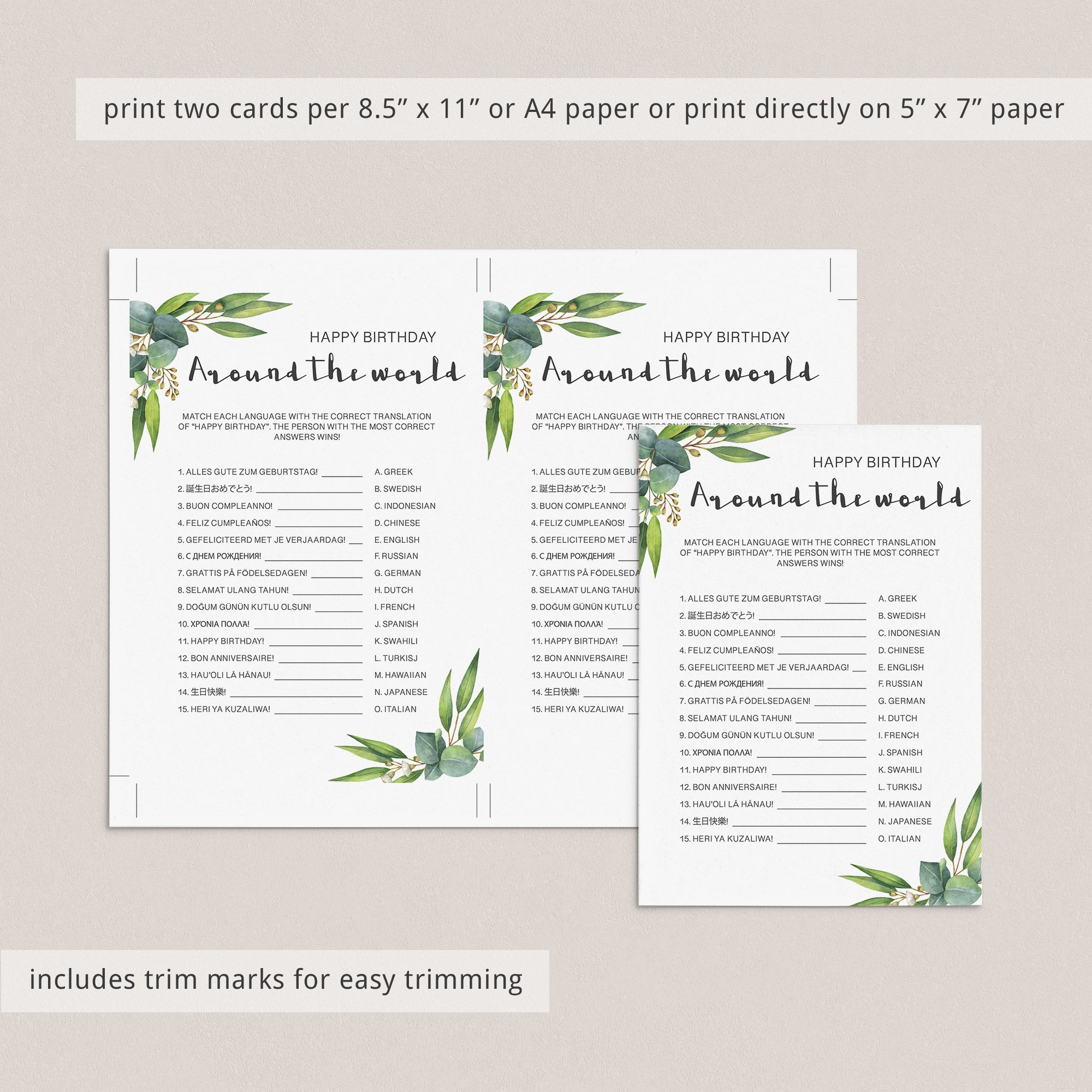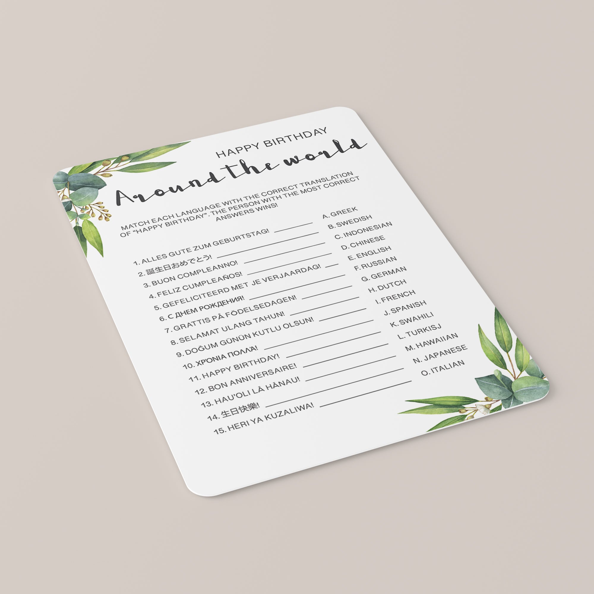 The game is very easy to play. Print and distribute these botanical theme birthday party game cards with eucalyptus leaves and a pen to each of your guests. They have to match each version of the words “Happy Birthday” with its language of origin. The person with the most correct answers wins. This game is the perfect addition to a greenery theme birthday party.