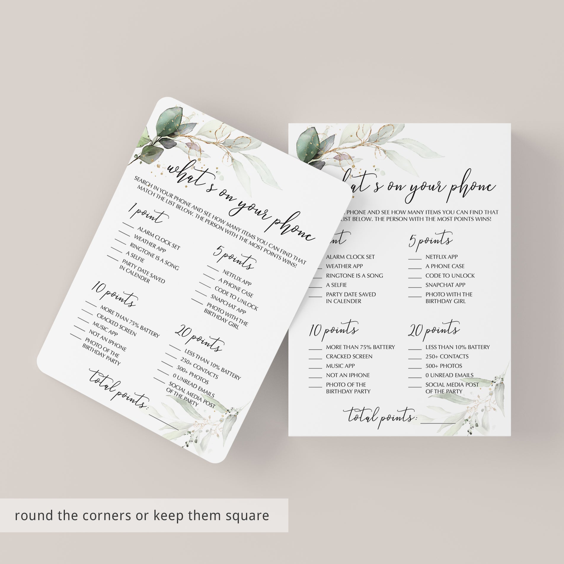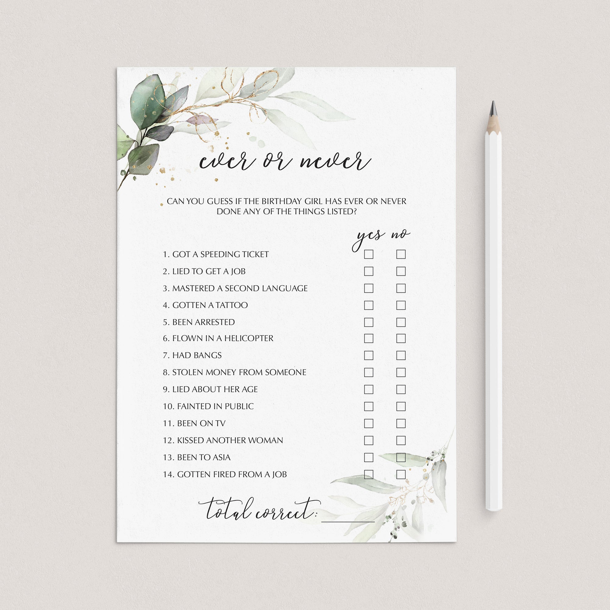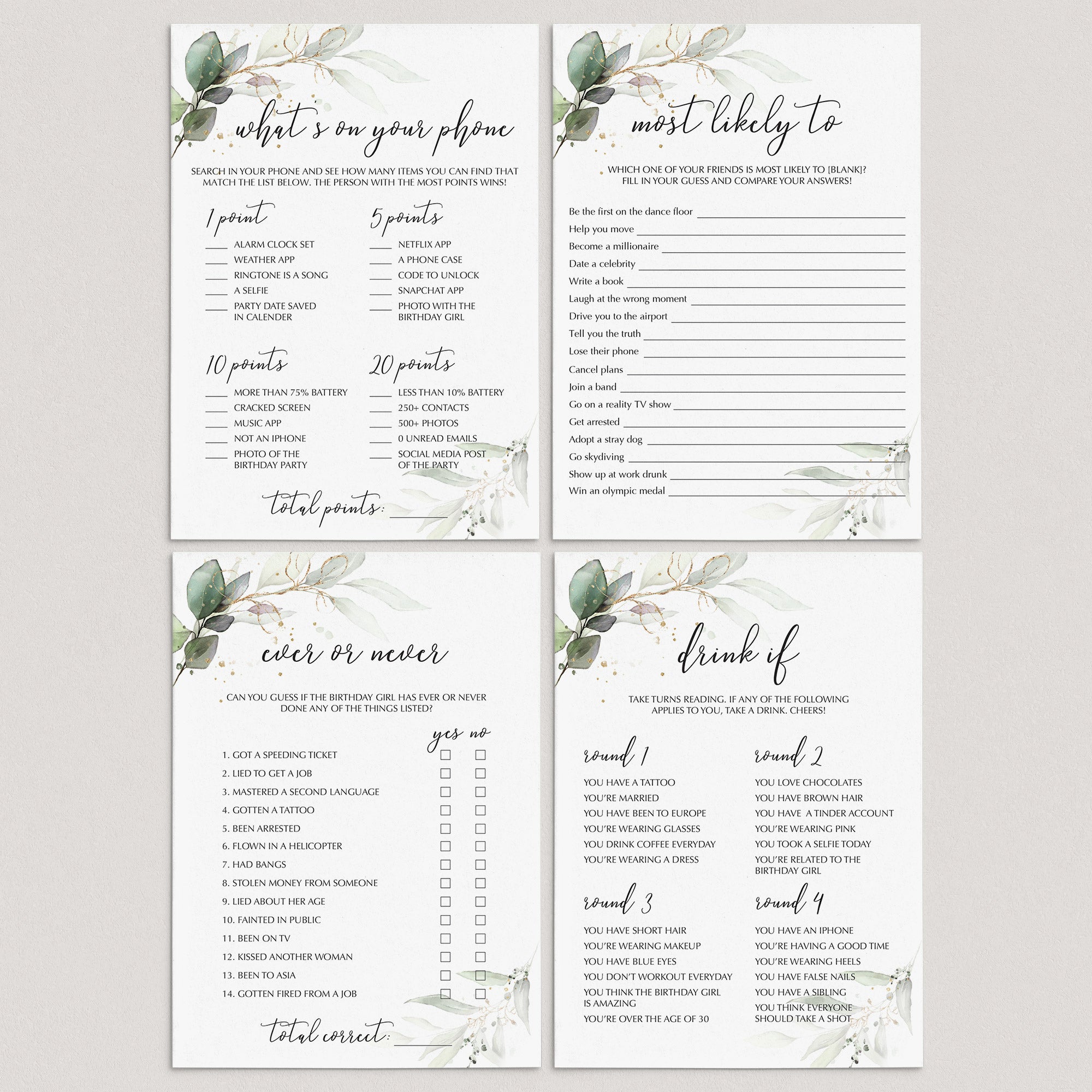 Are you hosting a ladies birthday party? Add some fun to the party with this chic birthday party games pack with 4 hilarious adult birthday games. Whether you're celebrating your BFF's 30th birthday, your co-worker's turning "forty and fabulous," or your mother's turning 57 for the twelfth time, these ladies birthday party games will get everyone laughing and mingling. The games with watercolor leaves and faux gold foil are the perfect addition to a modern chic ladies birthday party.