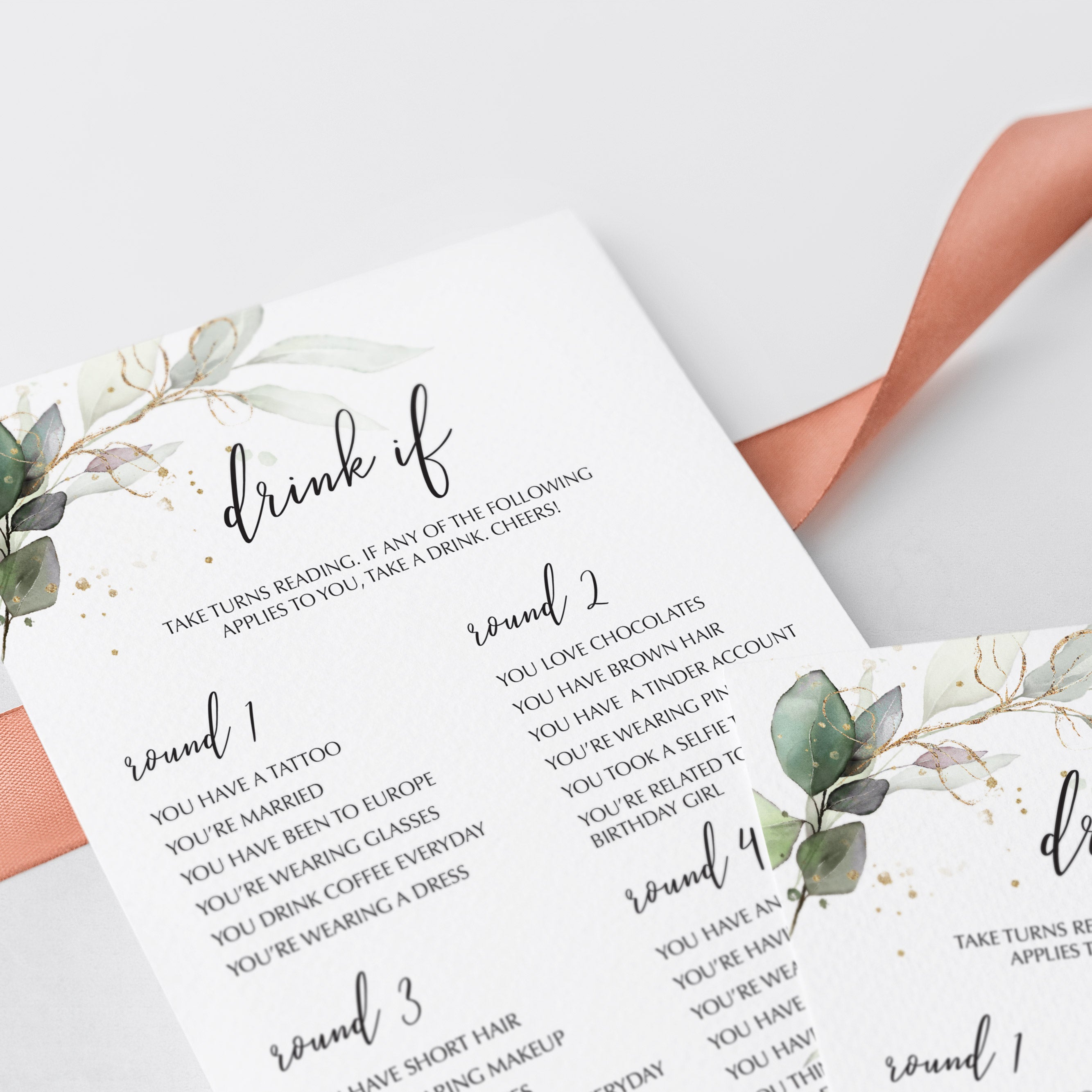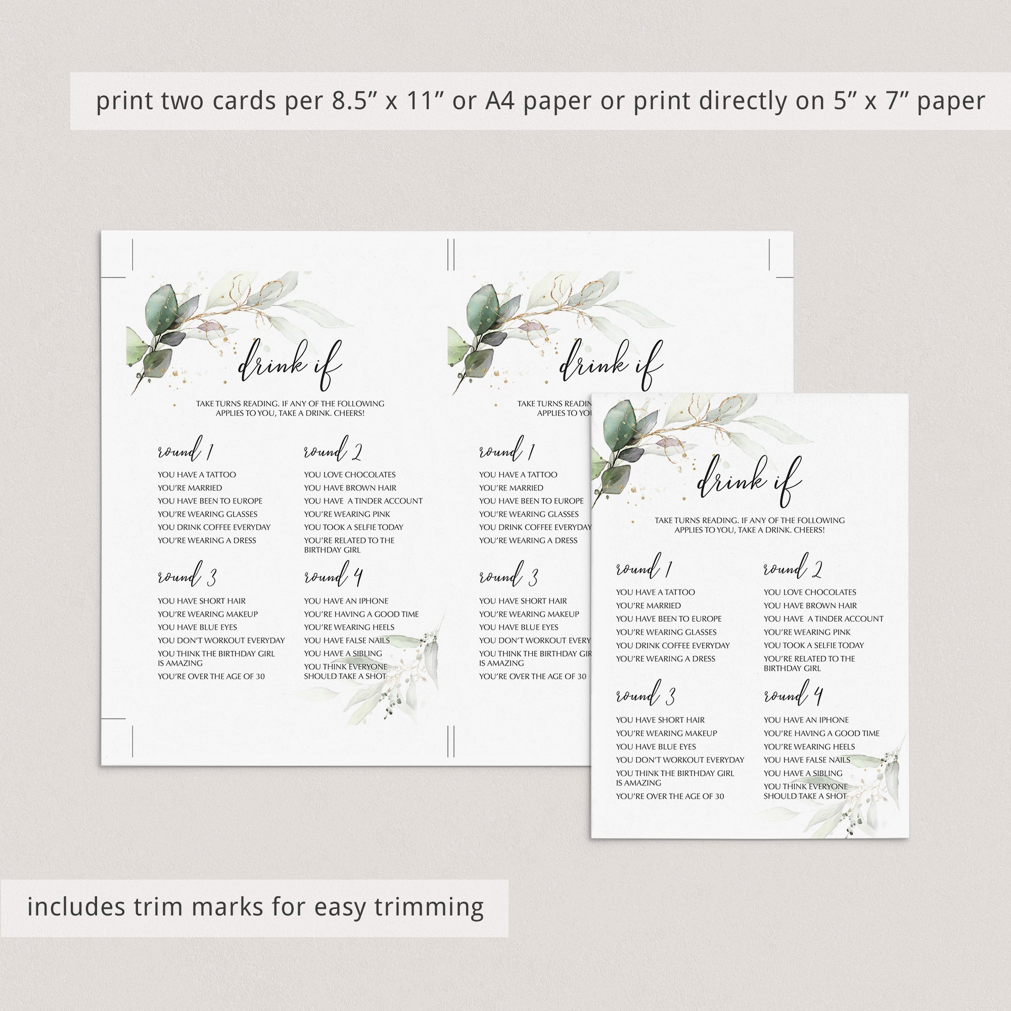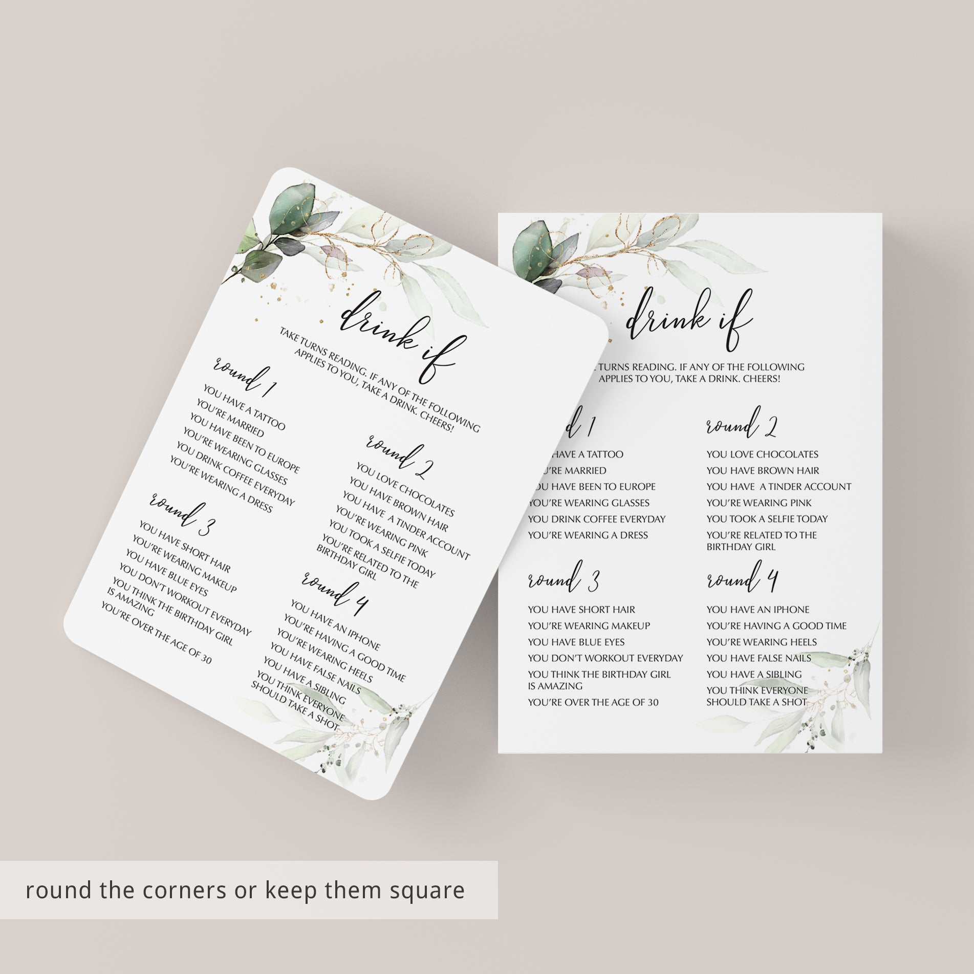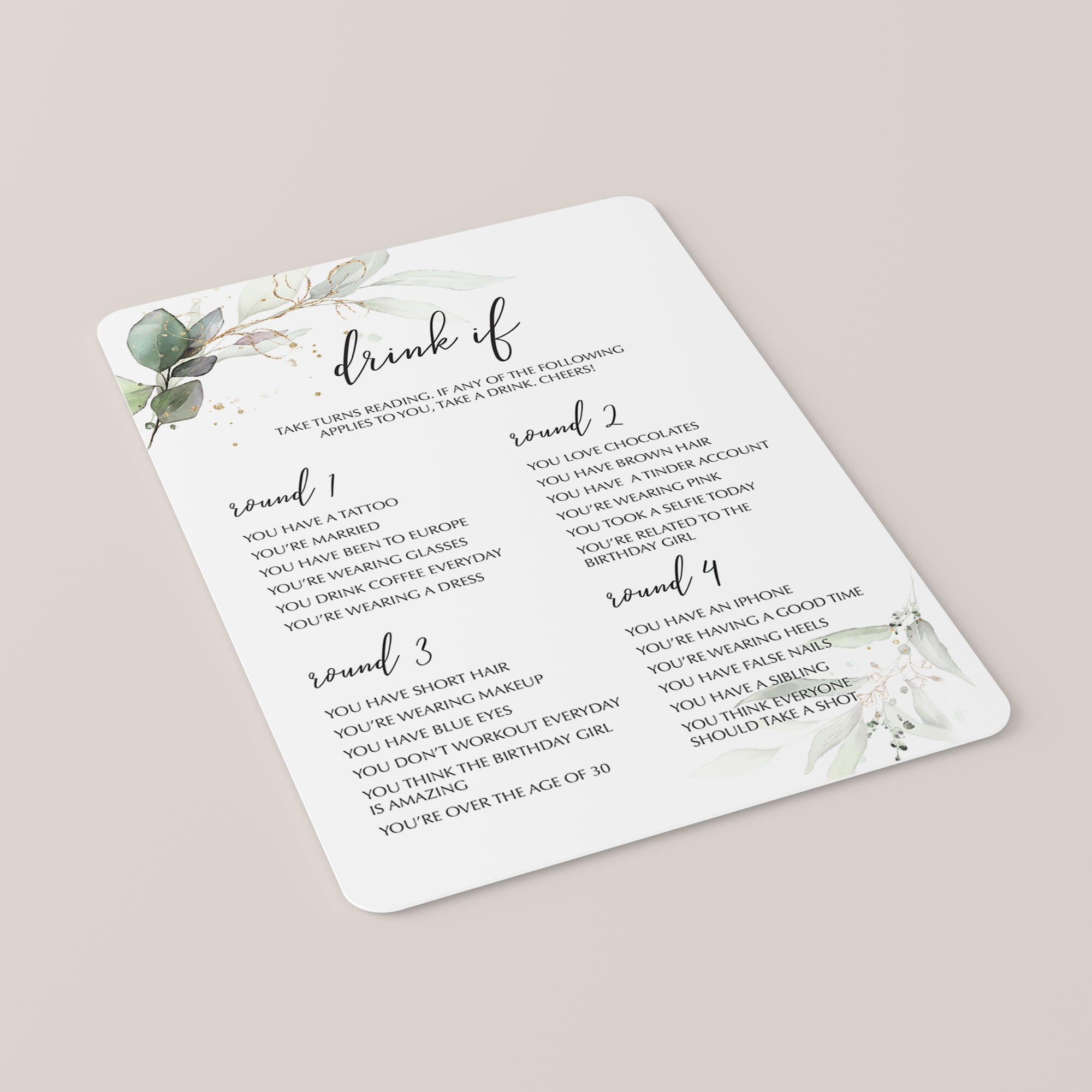 Add some fun to your ladies birthday party with this greenery and gold Birthday Party Drinking Game. Lots of fun and laughter guaranteed!