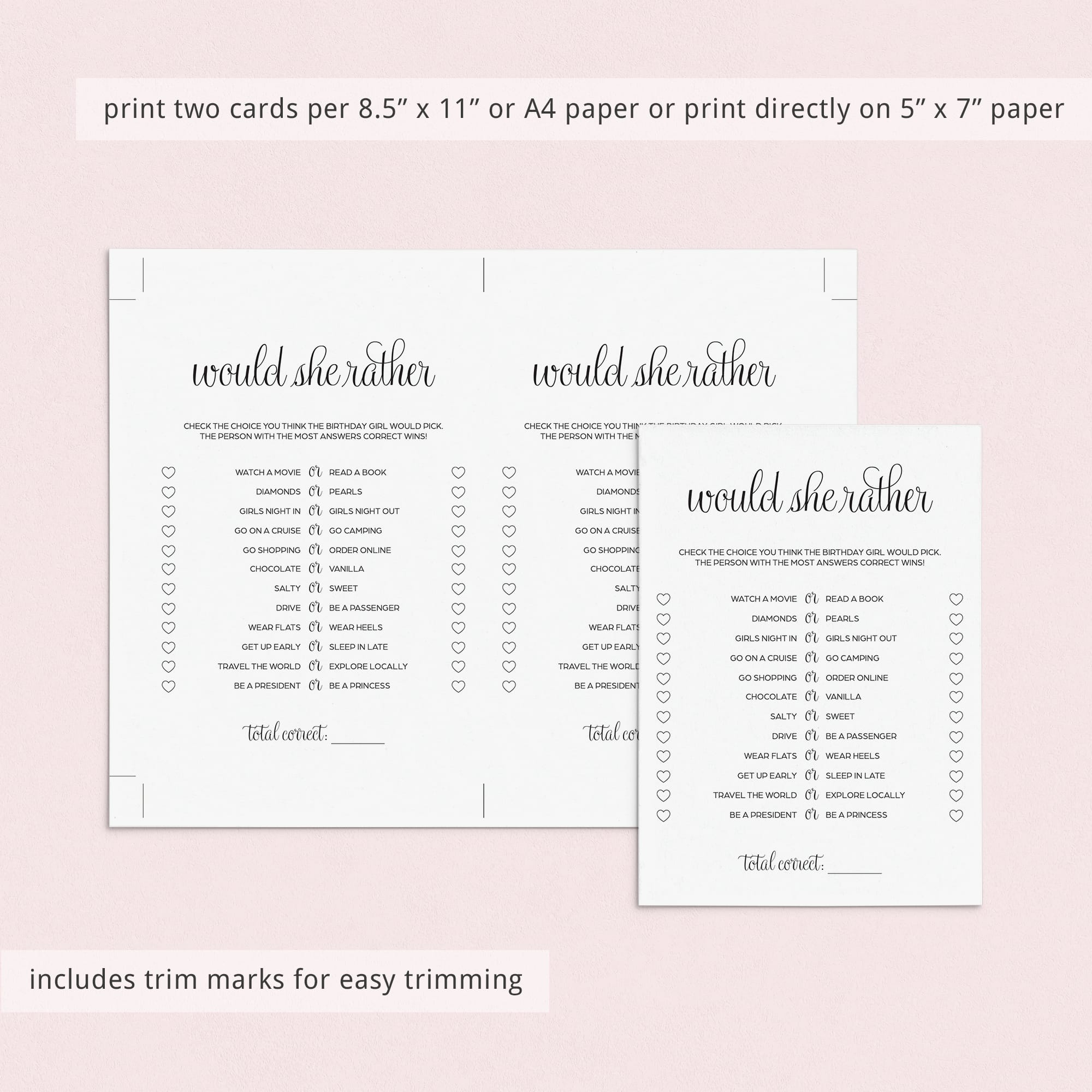 Print the games right from your computer in a matter of minutes or have the birthday cards printed at your favorite print shop. The games have been designed in black and white. You can print on kraft paper to create a rustic look or print on colored card stock to match your party color palette. We recommend printing on a nice heavy card stock for highest quality feel.