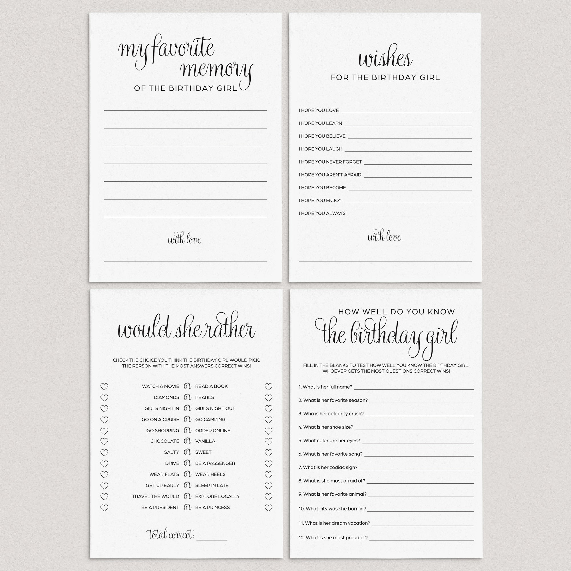 Are you hosting a girl birthday party? Add some fun to the party and create meaningful keepsakes for the birthday girl with this elegant girl birthday party game cards bundle. The black and white birthday cards with calligraphy script the perfect addition to any girl or women's birthday party.