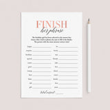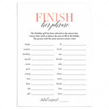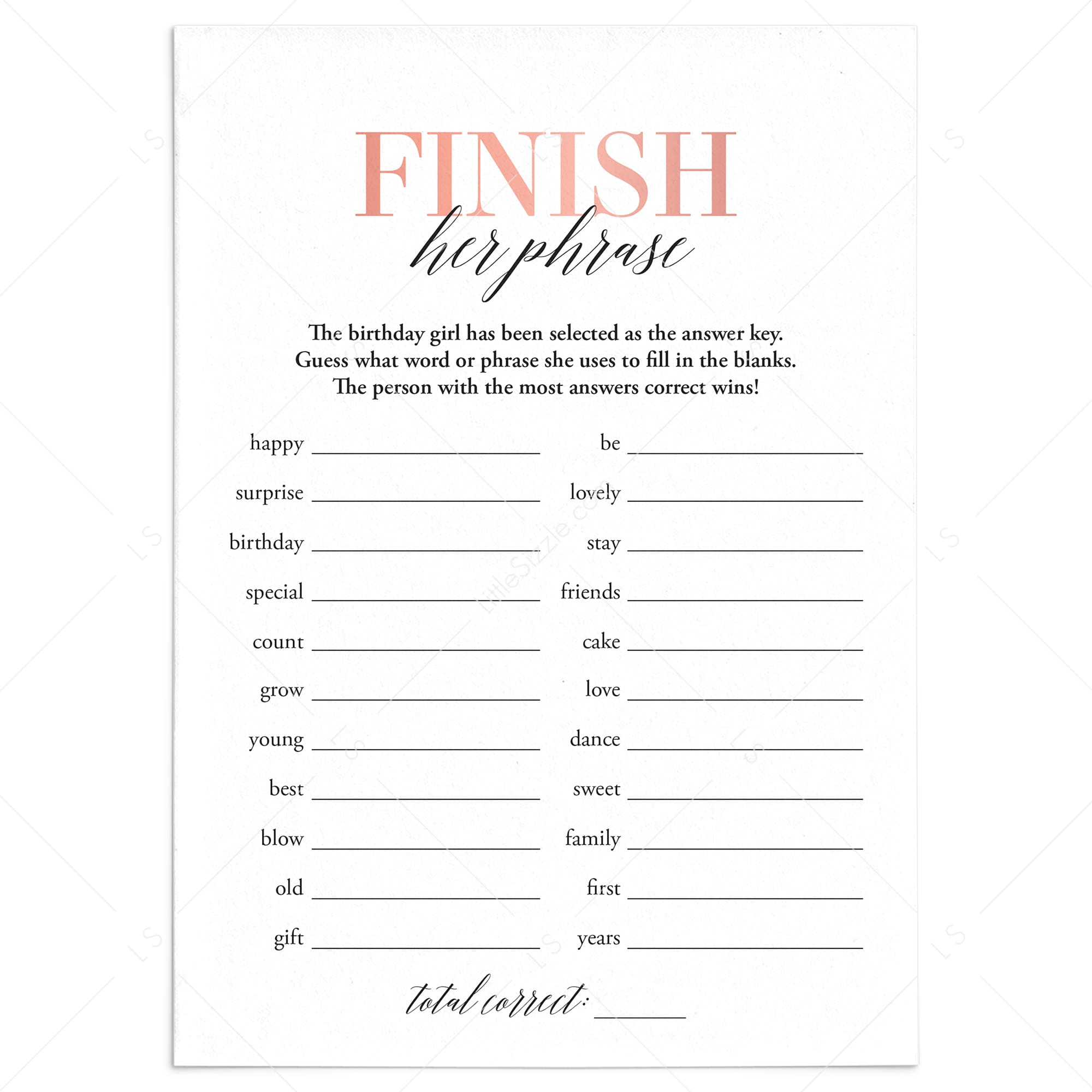 Are you looking for a last minute icebreaker game for your birthday party? Play Finish Her Phrase with these modern blush birthday game cards. The game has a modern look and with the calligraphy script it will fit any women's birthday party theme.