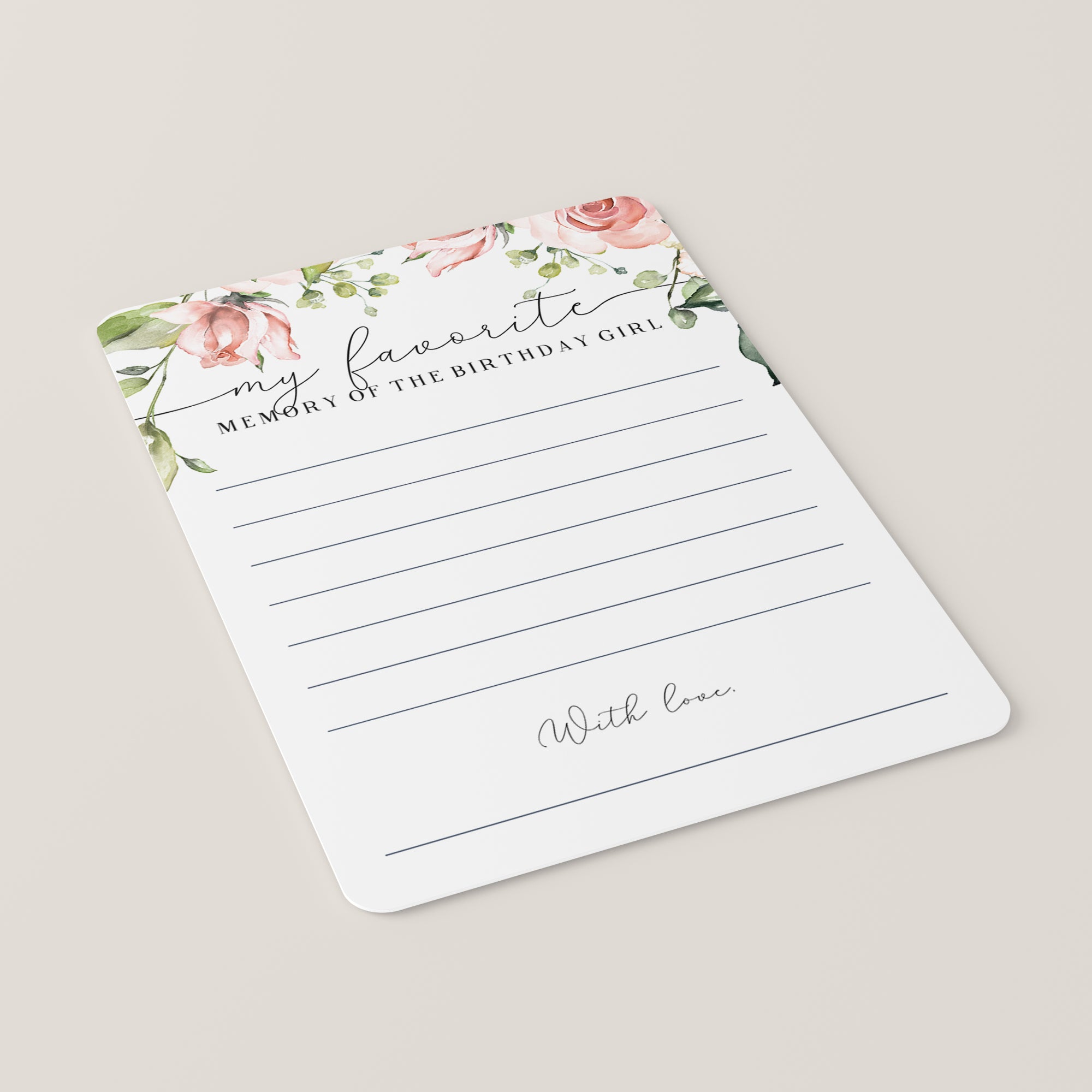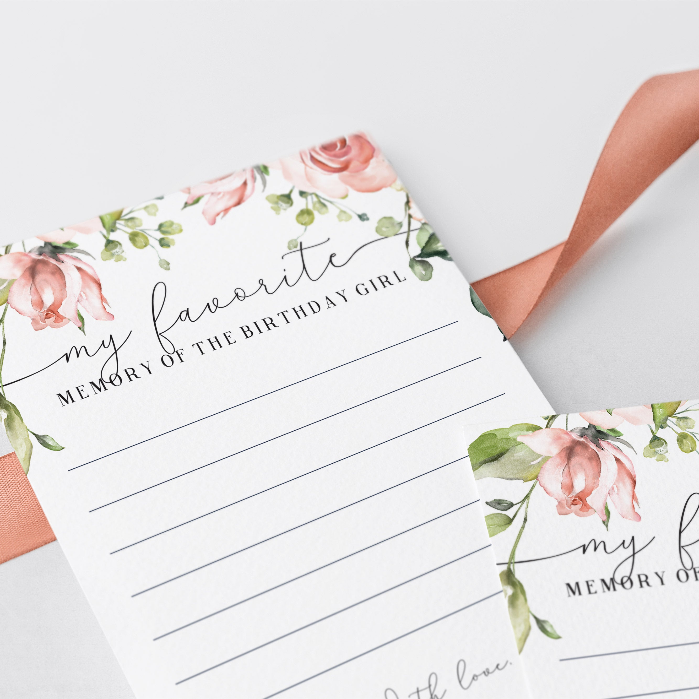 Are you looking for a memorable icebreaker game for your girl birthday party? Have everyone share their Favorite Memory of The Birthday Girl with these gorgeous blush floral game cards with watercolor flowers. It's the perfect addition to your floral themed girl birthday party and it's sure to be a hit.