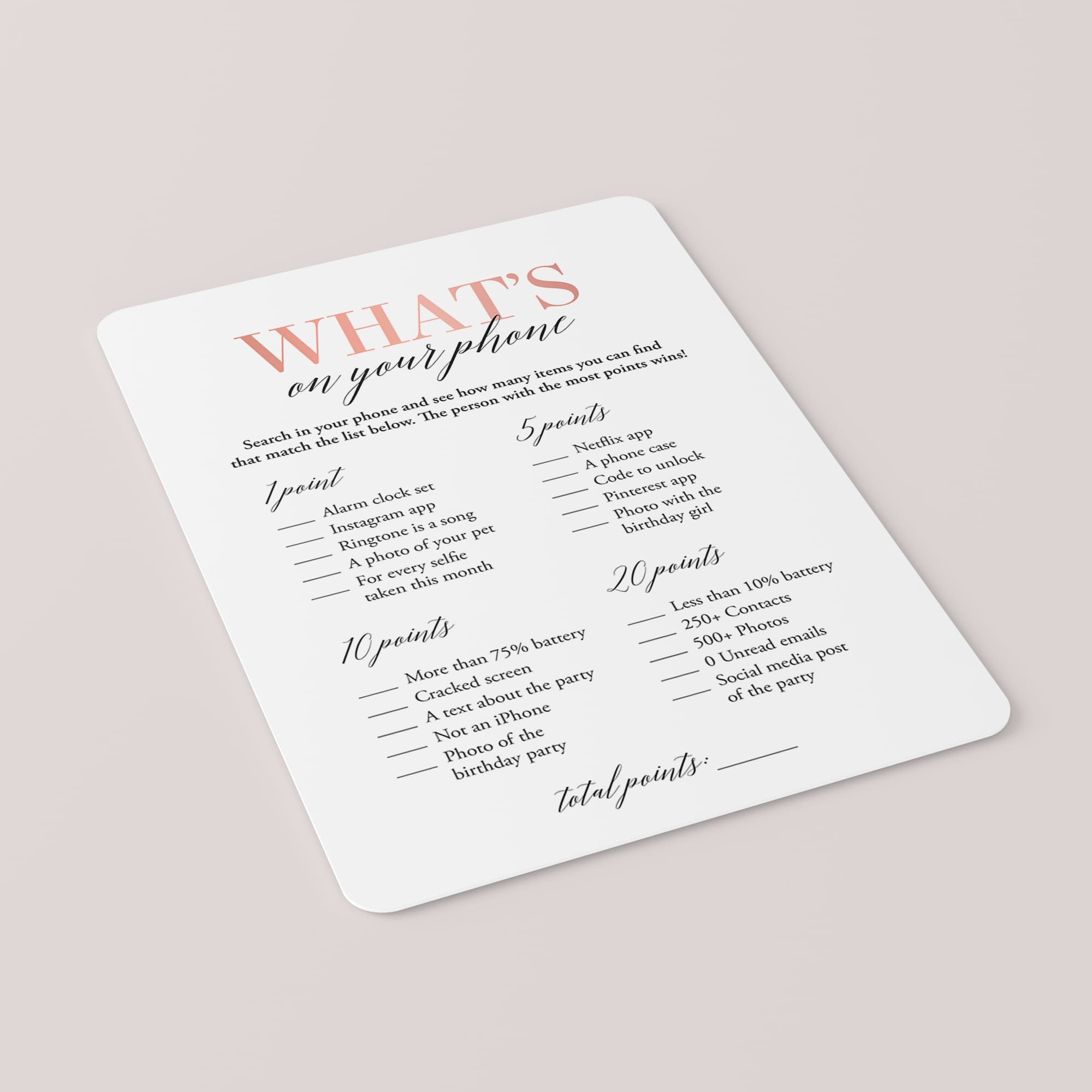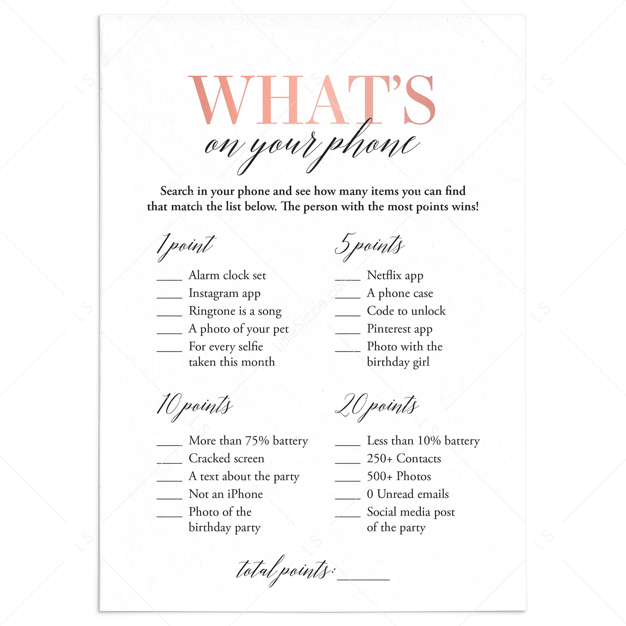 Add some fun to your birthday party with this rose gold birthday What’s On Your Phone game. It is the perfect icebreaker game, super easy to prepare for AND simple to play. All guests need to play is a smartphone, one of these Whats On Your Phone game cards and a pen. It's the perfect addition to any girl's birthday party.
