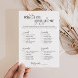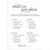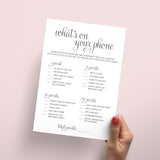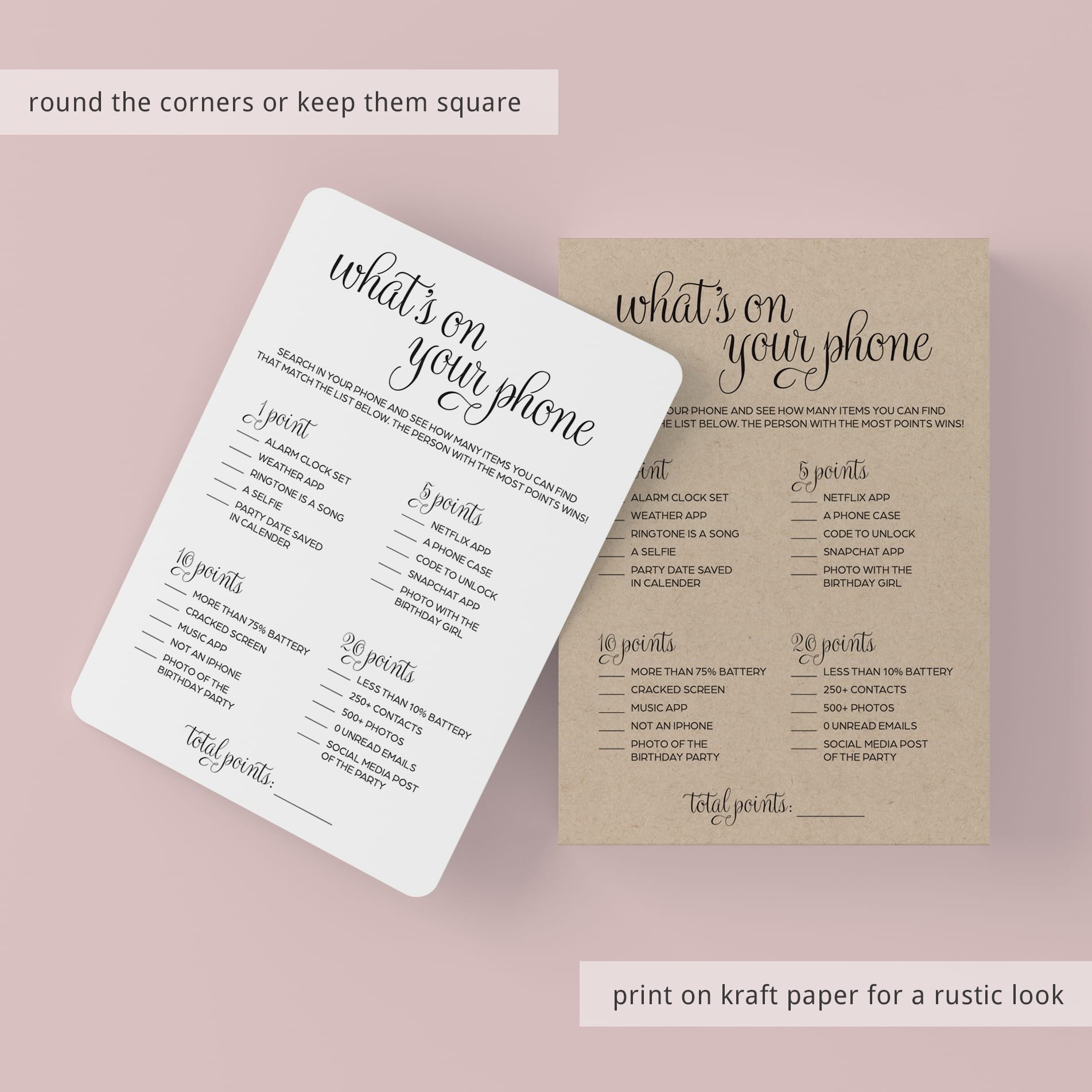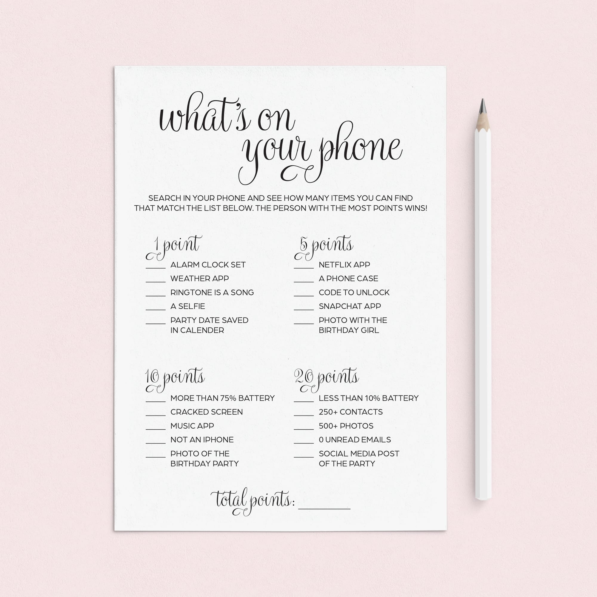 What’s On Your Phone is similar to the What’s In Your Purse game, but instead of searching for the items physically, your guests will just search for the listed items using their phone. They earn points for each item that they have in their phone.