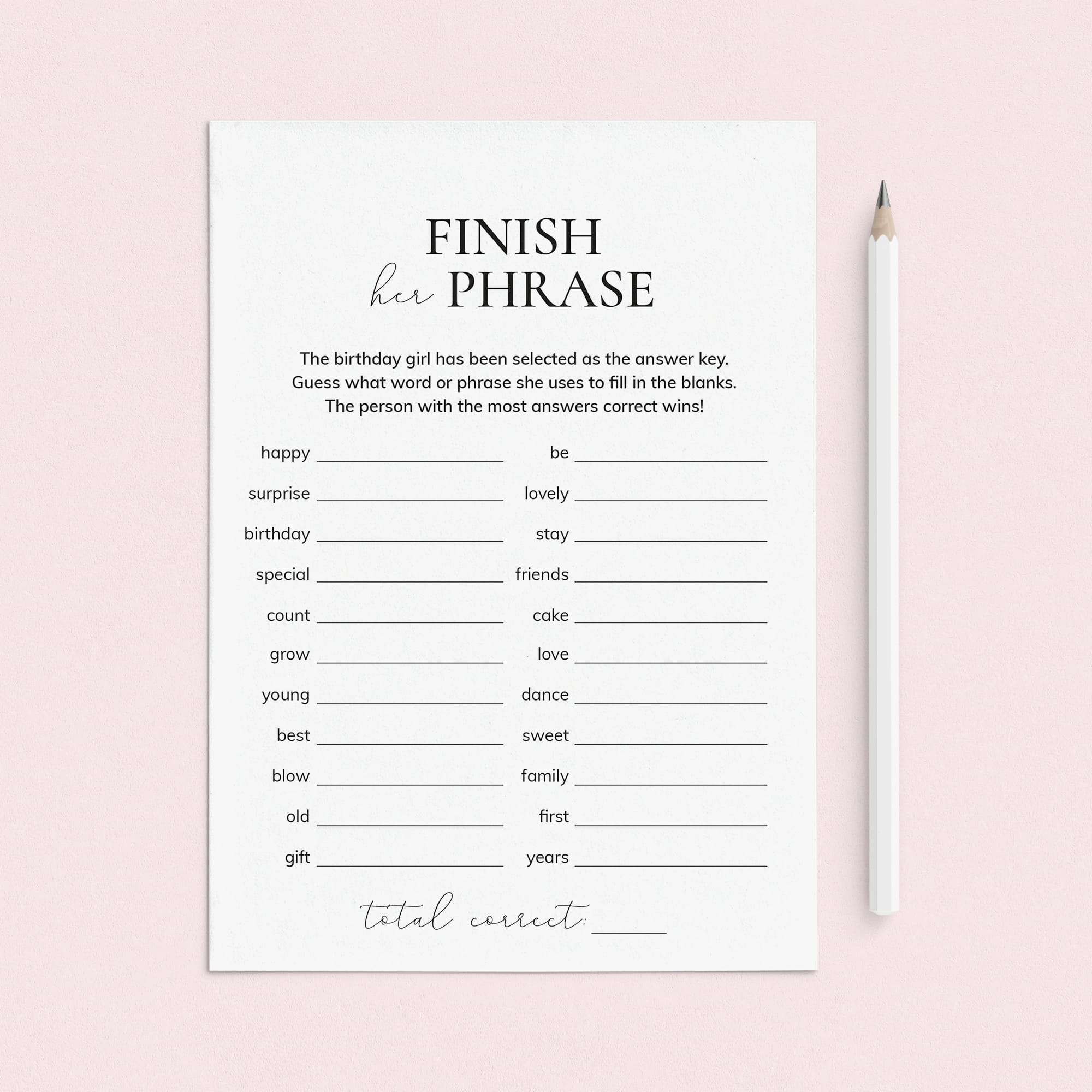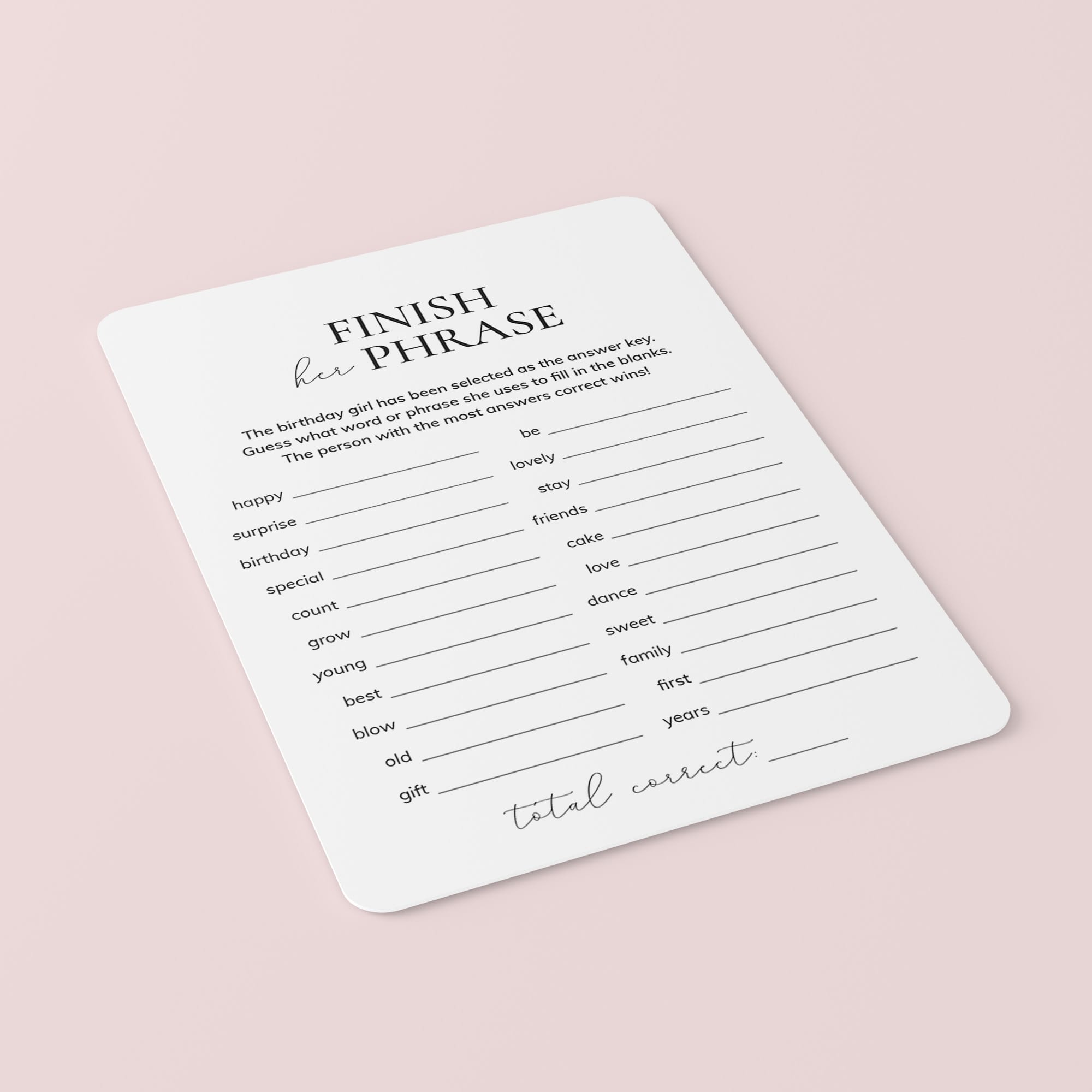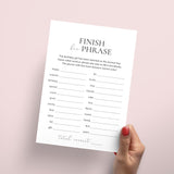 Are you looking for a last minute icebreaker game for your birthday party? Play Finish Her Phrase with these simple, yet elegant, birthday game cards. The minimalist game will fit any women's birthday party theme.
