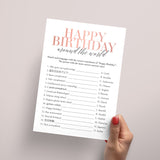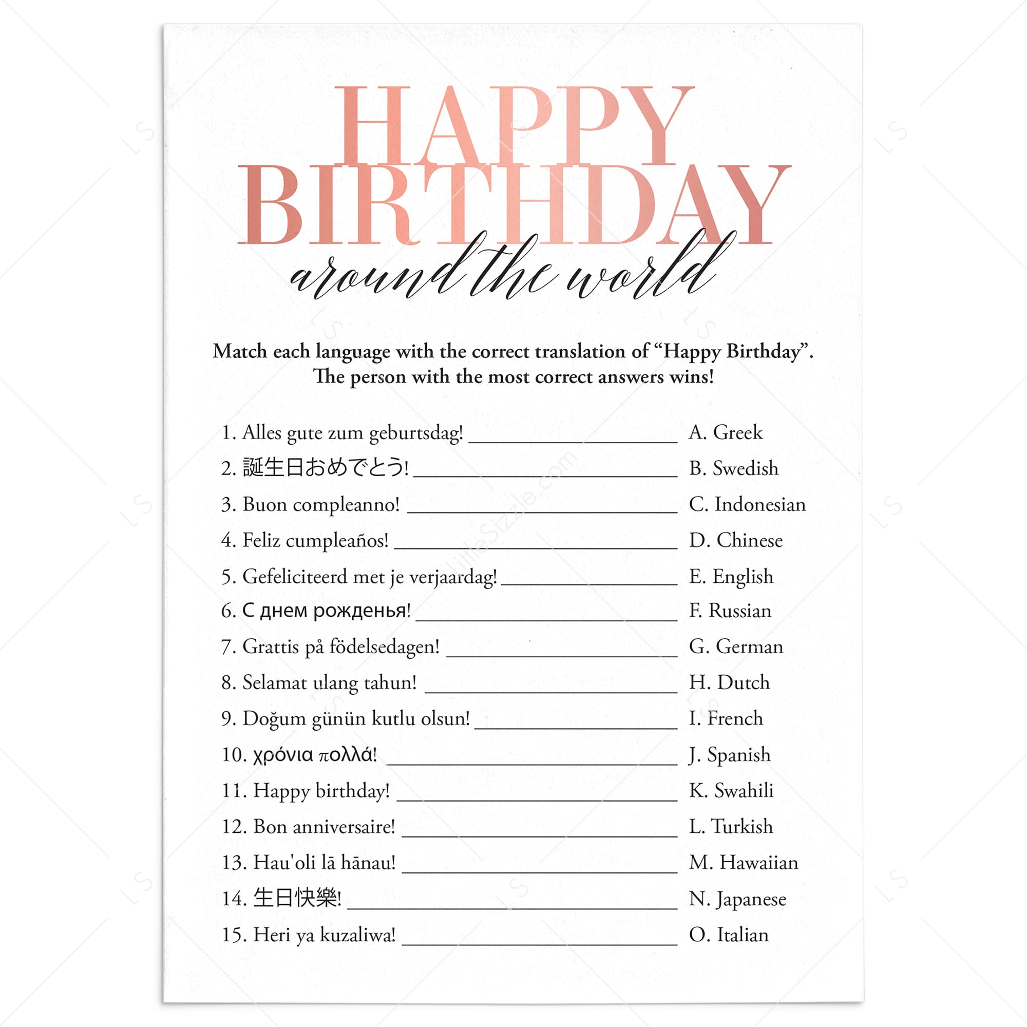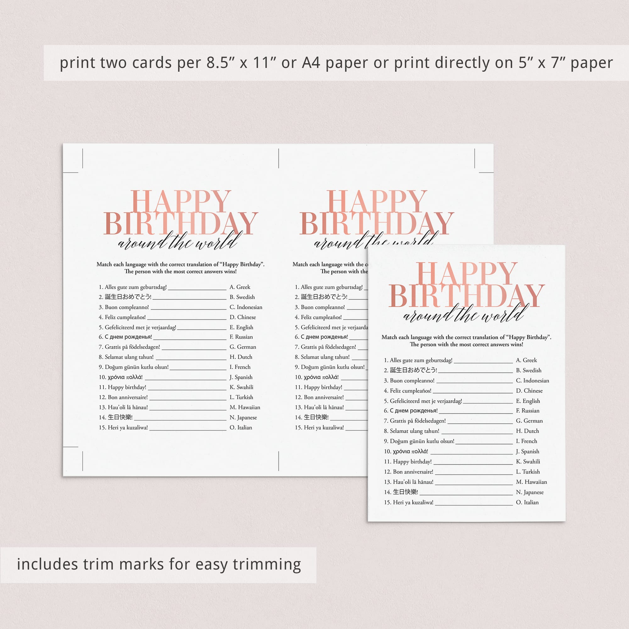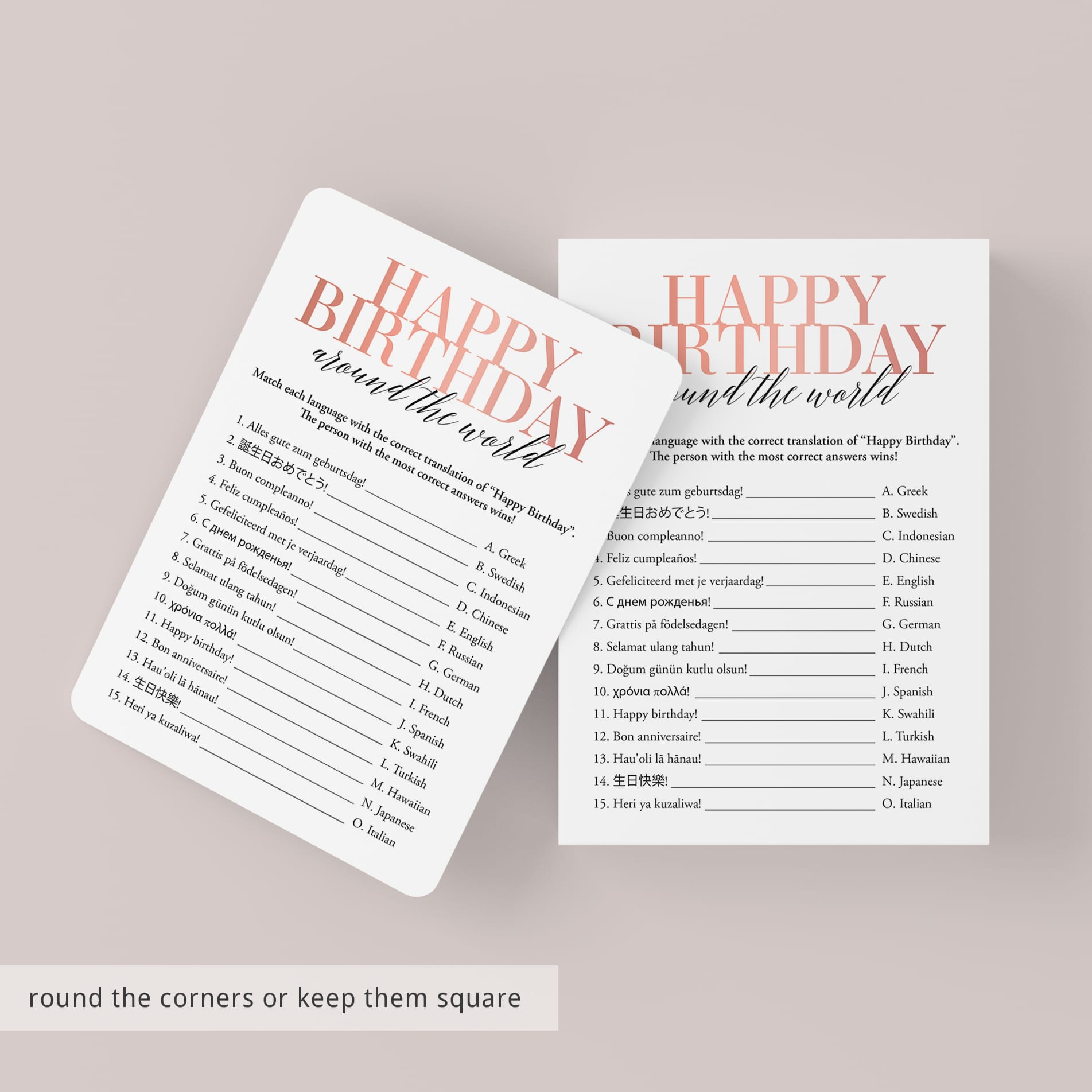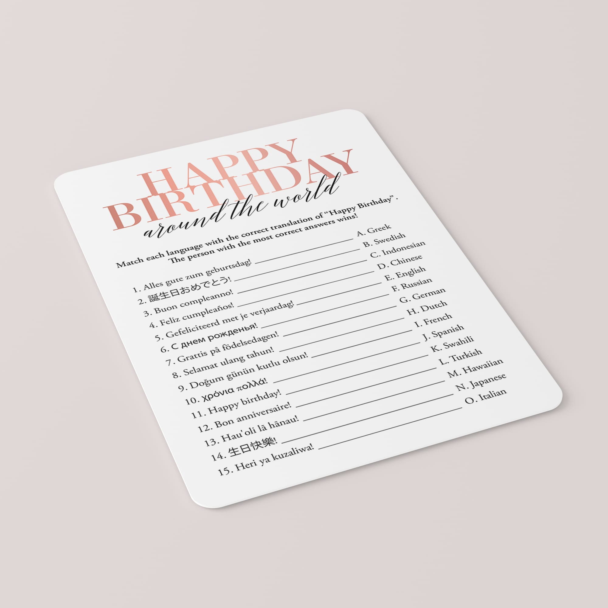 The game is very easy to play. Print and distribute these modern blush Around The World game cards and a pen to each of your guests. They have to match each version of the words “Happy Birthday” with its language of origin. The person with the most correct answers wins.