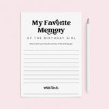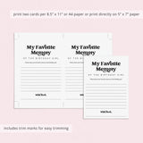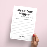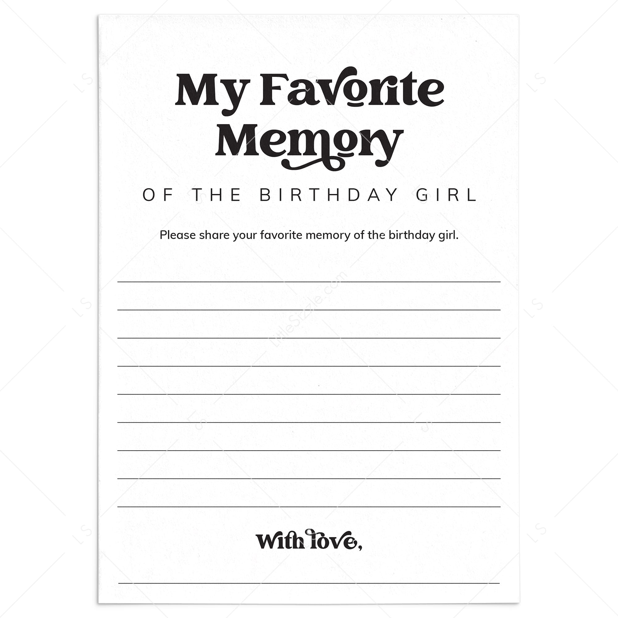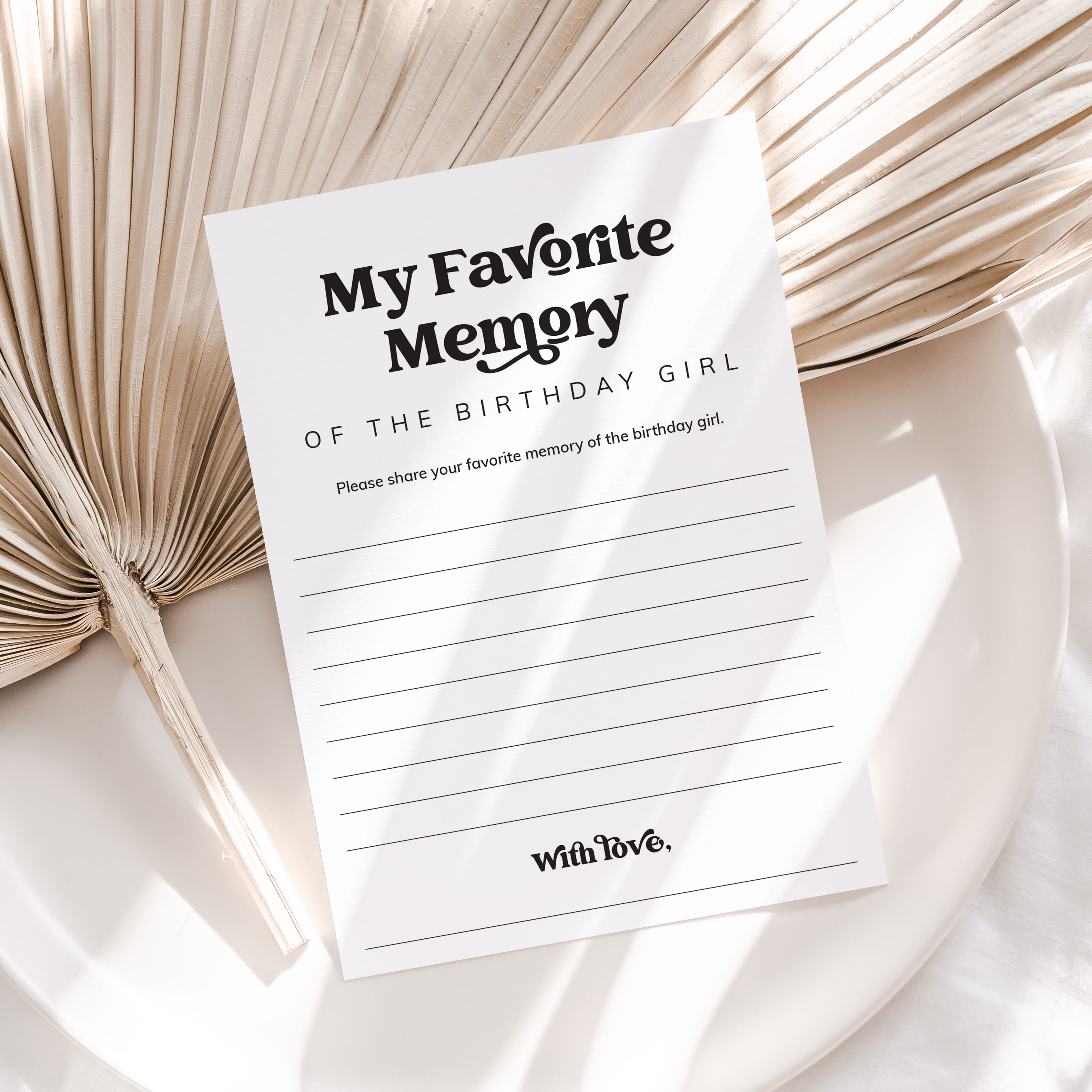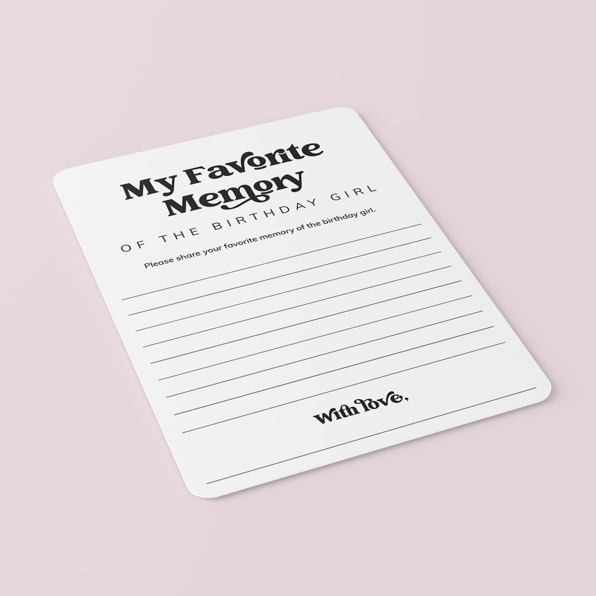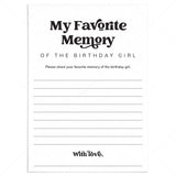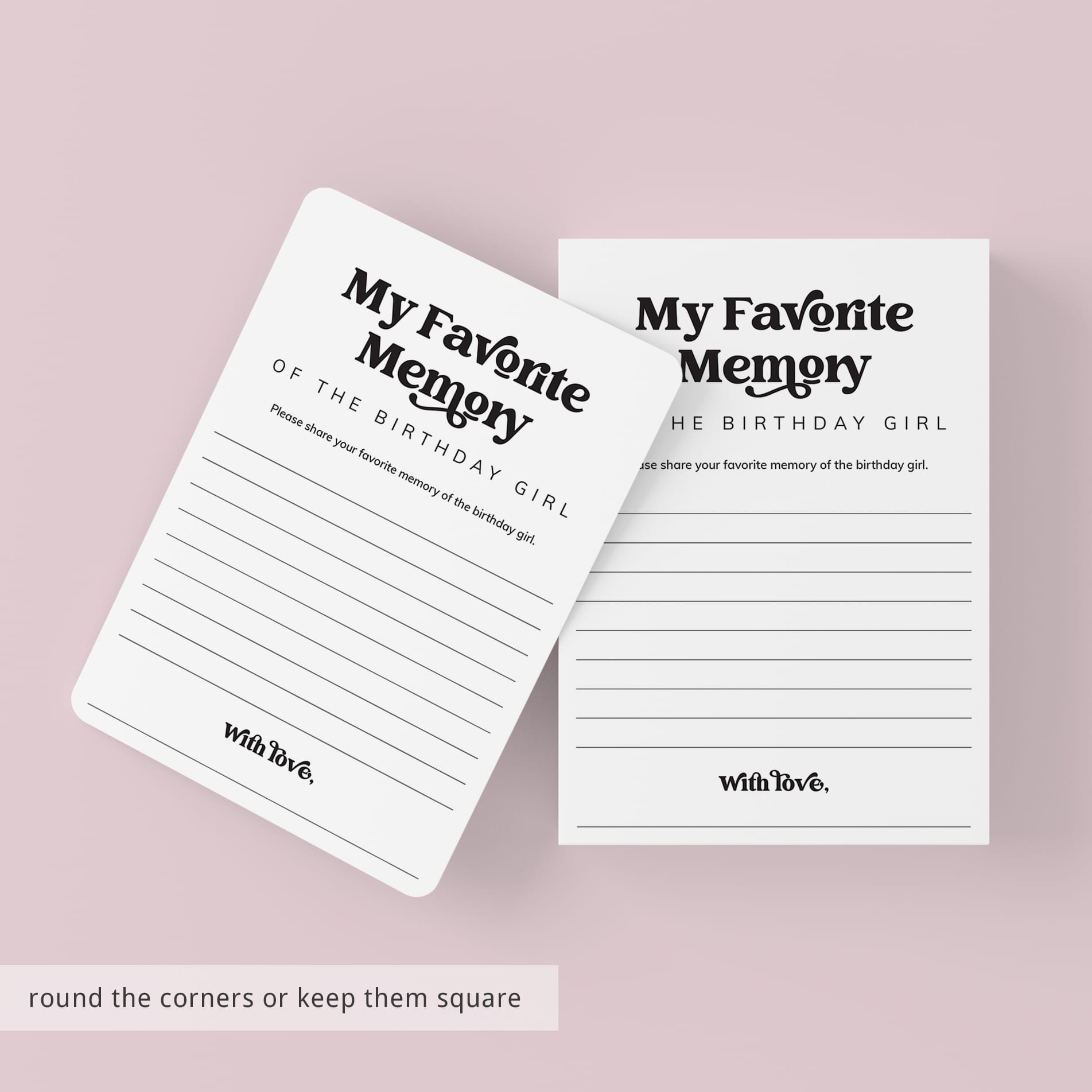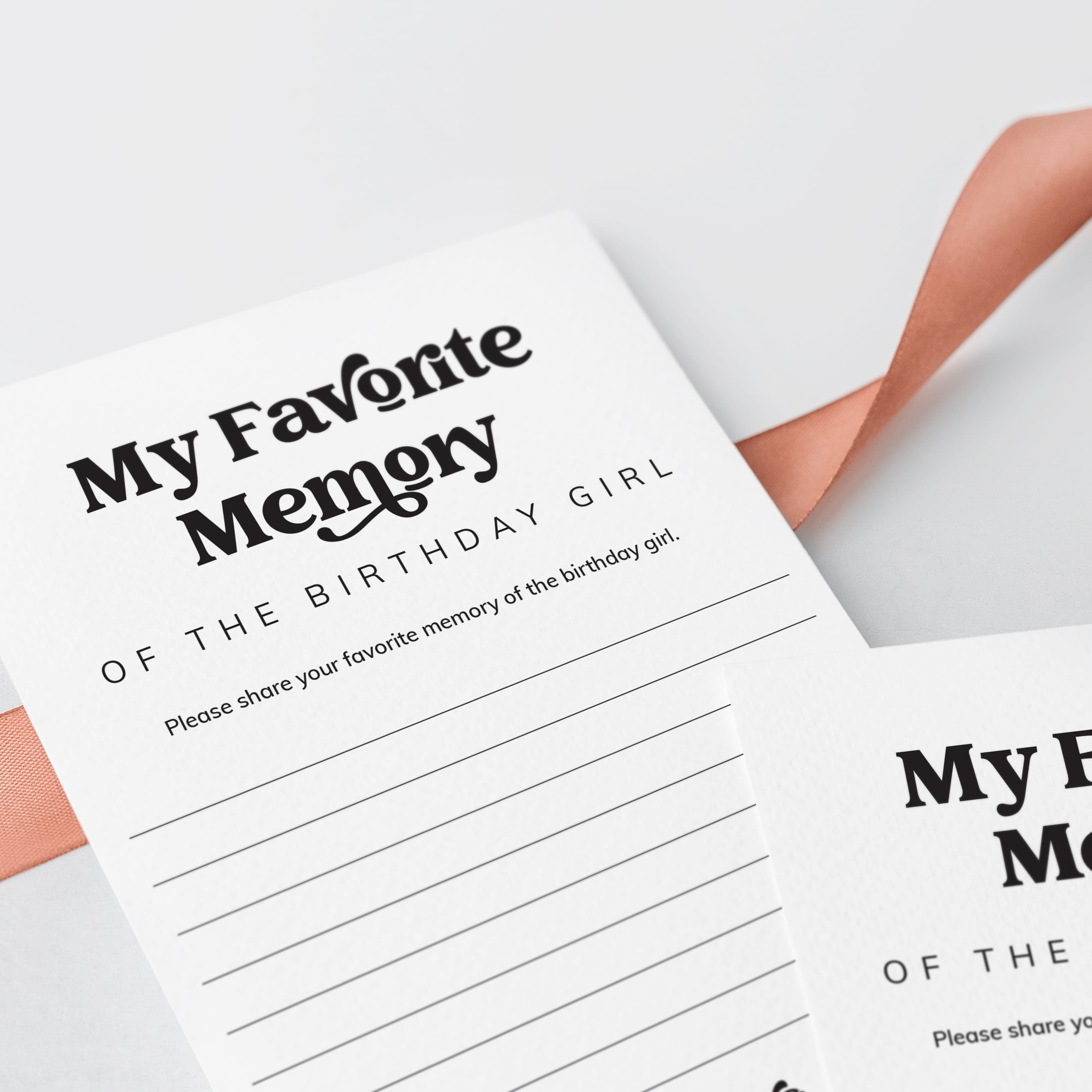 Are you looking for a memorable icebreaker game for your birthday party? Have your guests share their Favorite Memory of The Birthday Girl with these stylish memory cards with creative vintage script. It's the perfect addition to your girl birthday party and it's sure to be a hit!