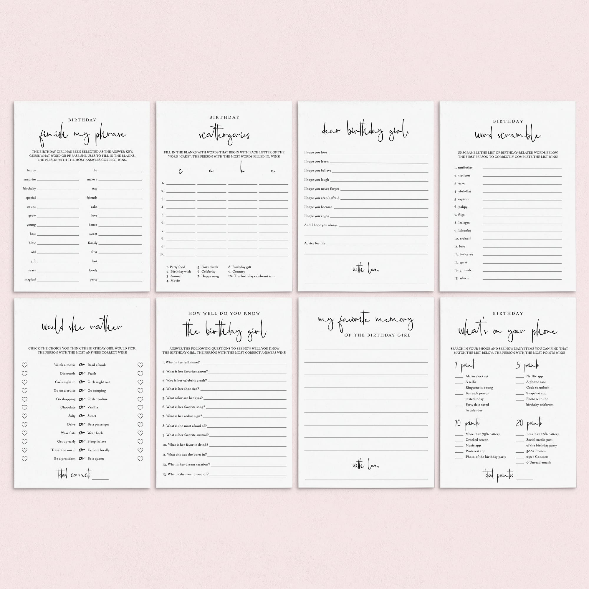 Are you hosting a birthday party for her and looking for some last-minute entertainment? This modern minimalist birthday game bundle with 8 popular party games will be the perfect addition to your party. This budget-friendly birthday game bundle will fit any birthday party theme.