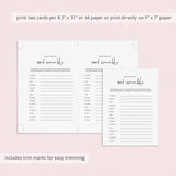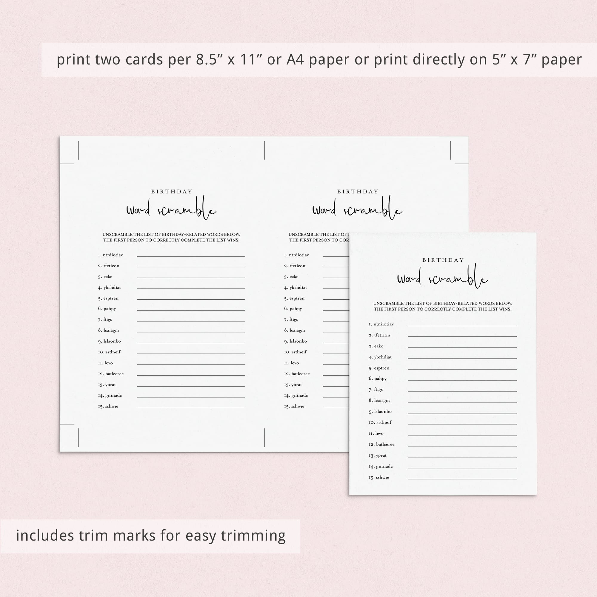 Print the games right from your computer in a matter of minutes or have the birthday cards printed at your favorite print shop. The games have been designed in black and white. You can print on kraft paper to create a rustic look or print on colored card stock to match your party color palette. We recommend printing on a nice heavy card stock for highest quality feel.