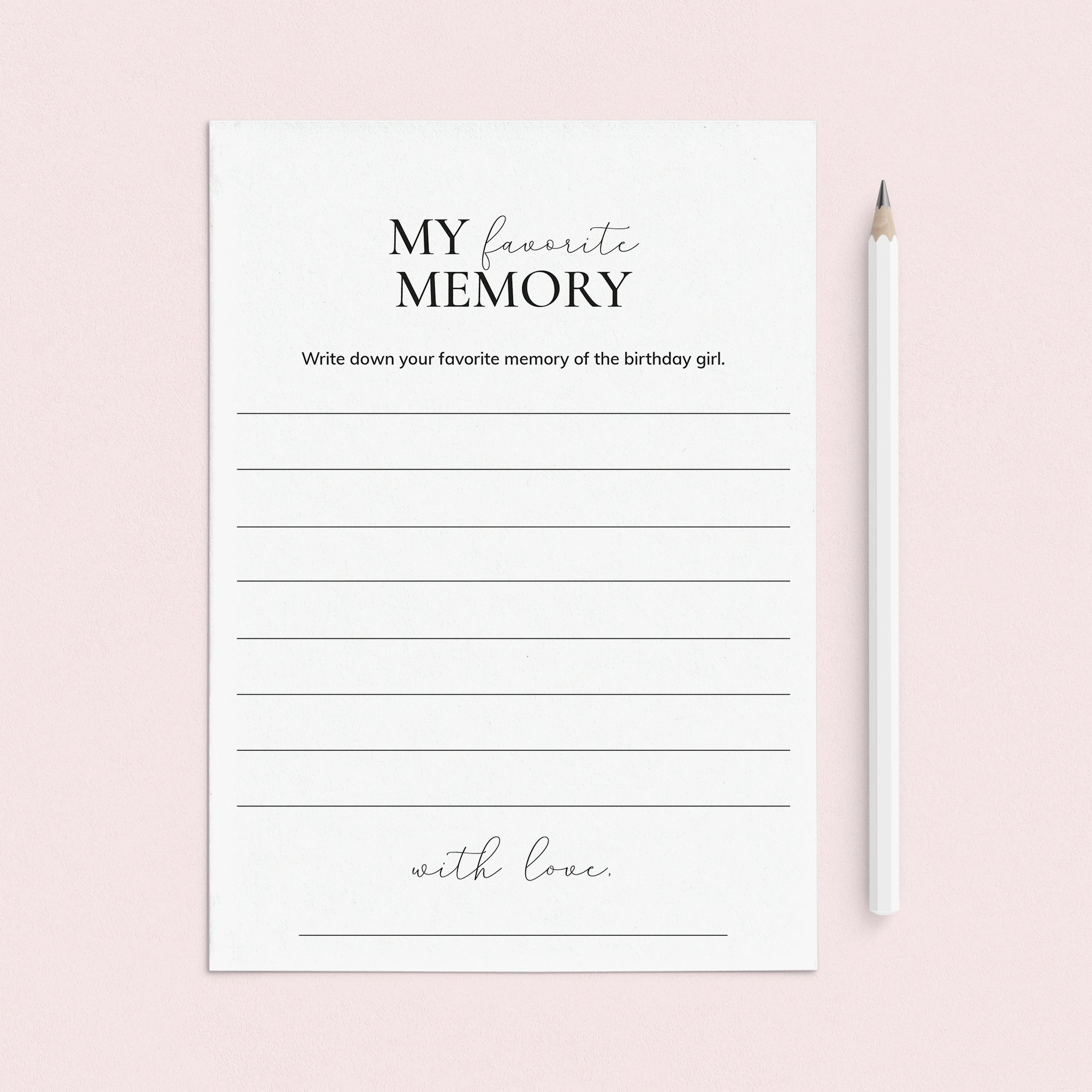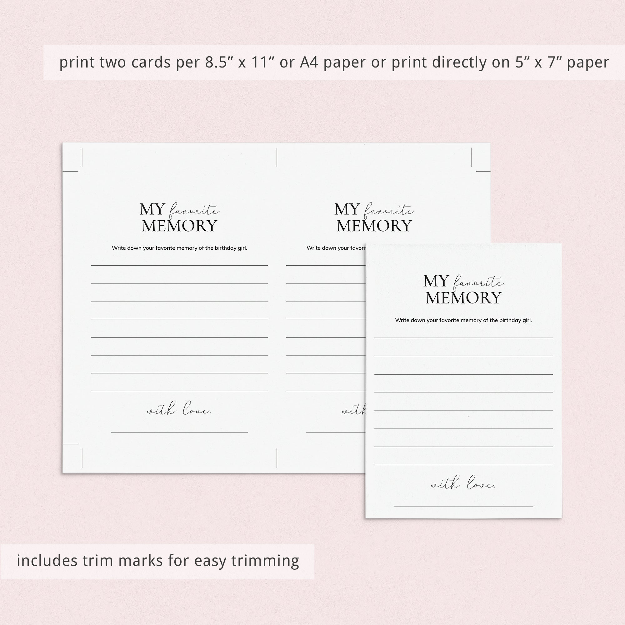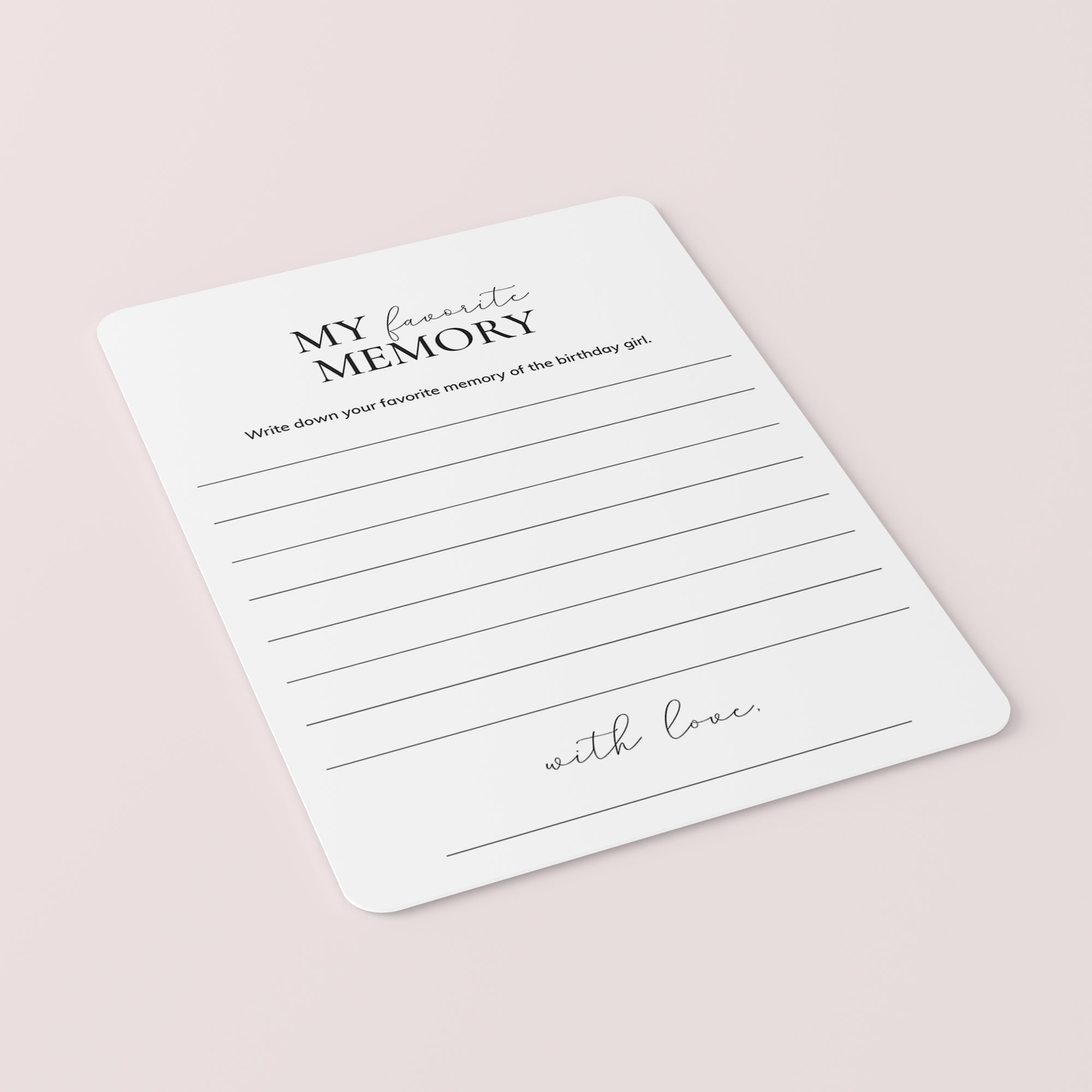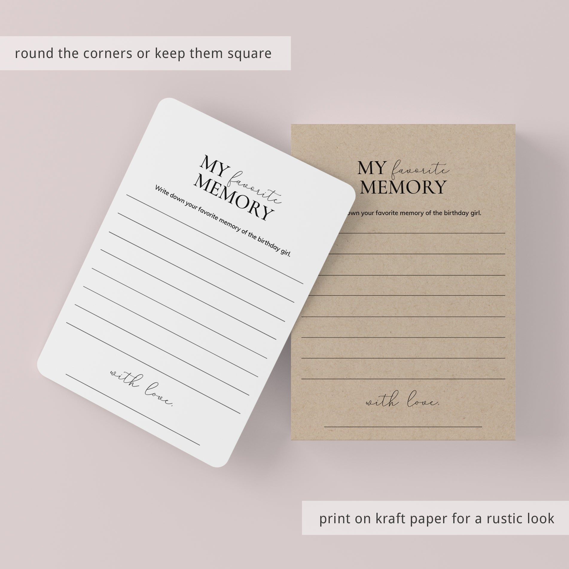 Are you looking for a memorable ice breaker game for your birthday party? Have your guests share their Favorite Memory of The Birthday Girl with these simple, yet elegant, minimal birthday cards. It's the perfect addition to any women's birthday party and it's sure to be a hit!