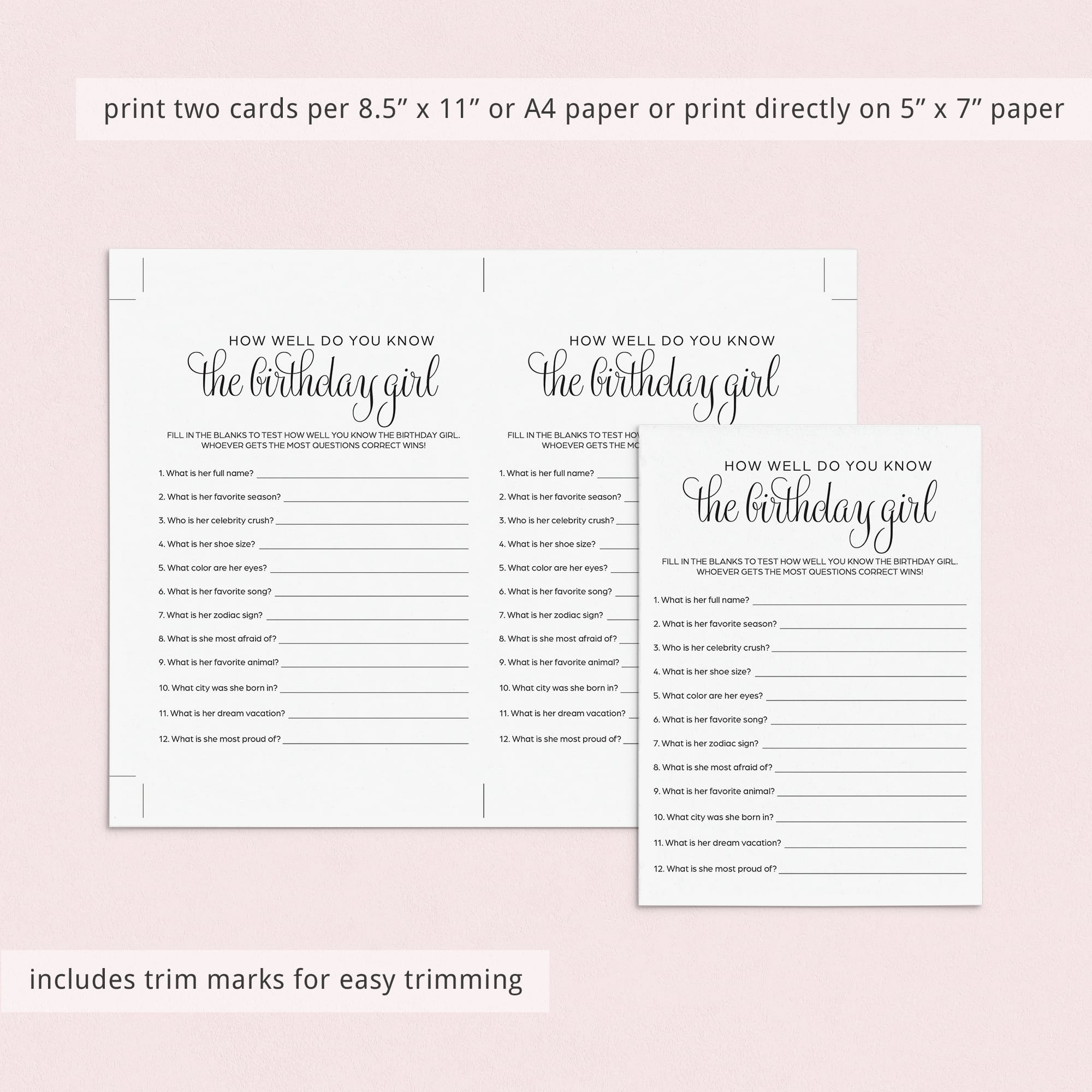 Print the games right from your computer in a matter of minutes or have the birthday cards printed at your favorite print shop. The games have been designed in black and white. You can print on kraft paper to create a rustic look or print on colored cardstock to match your party color palette. We recommend printing on a nice heavy card stock for highest quality feel.