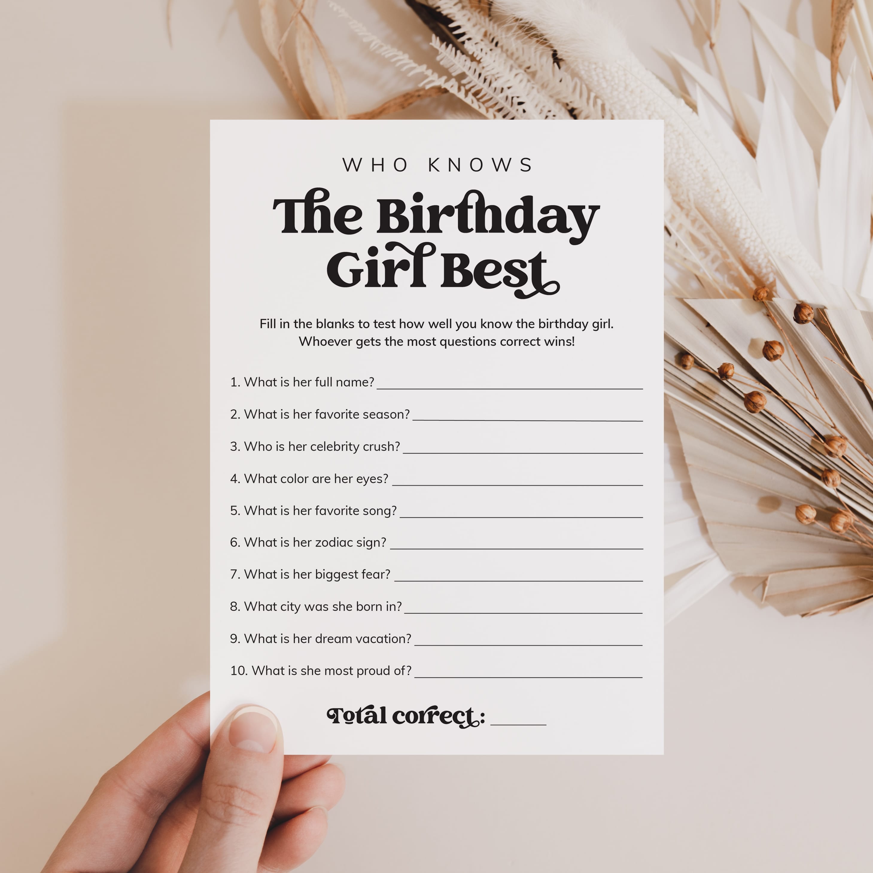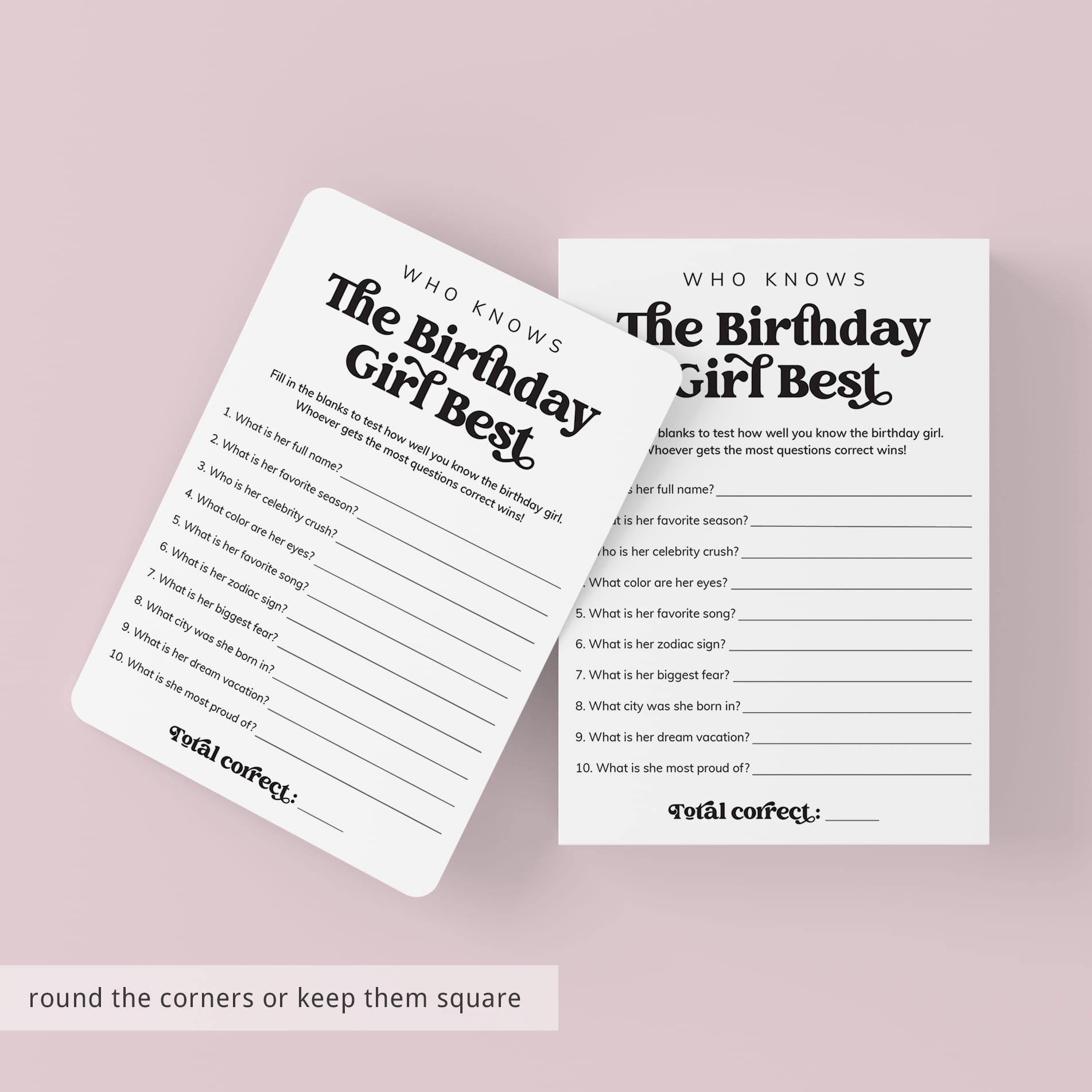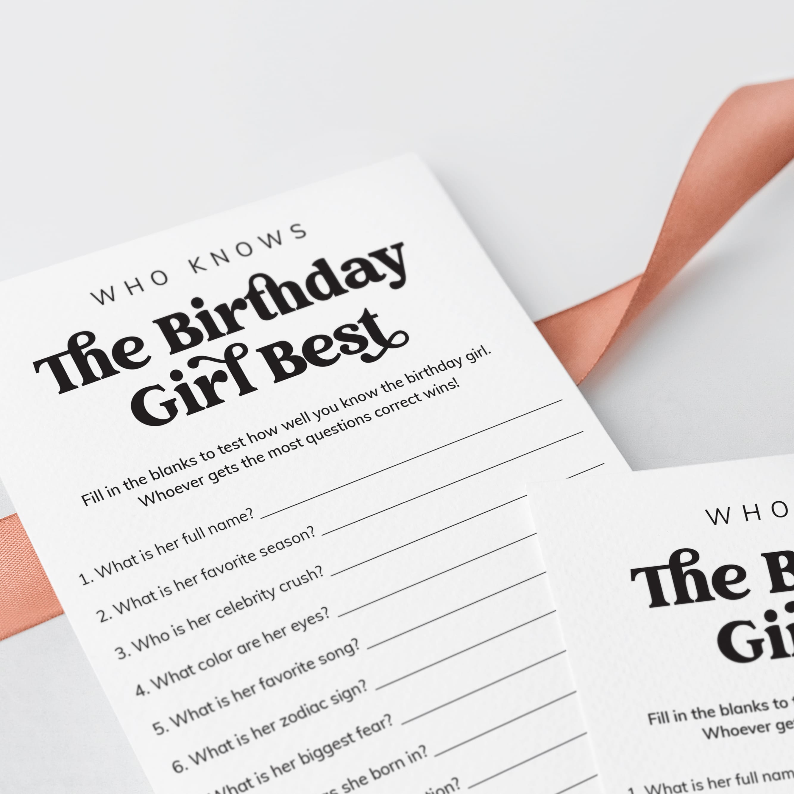 Test your birthday party guests how well they know the birthday girl and play 'Who Knows The Birthday Girl Best’ with this stylish birthday quiz with creative vintage script. The birthday questions are a great way to bring disparate people together and to put them all in a party mood. It's the perfect addition to your girl birthday party.
