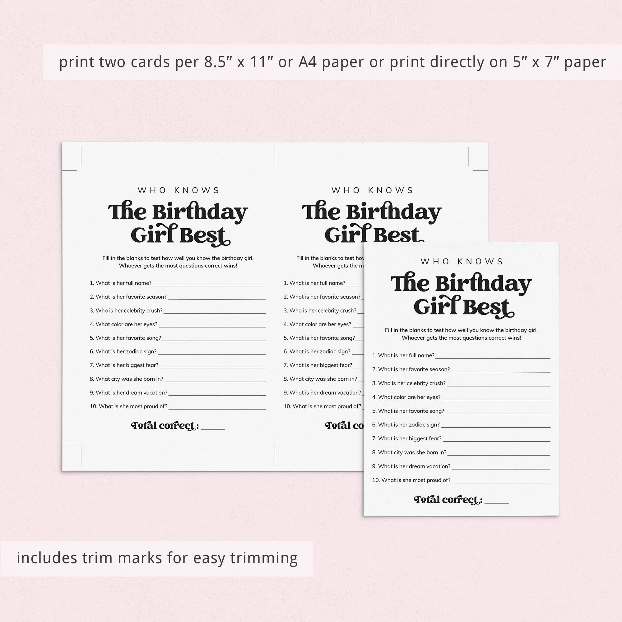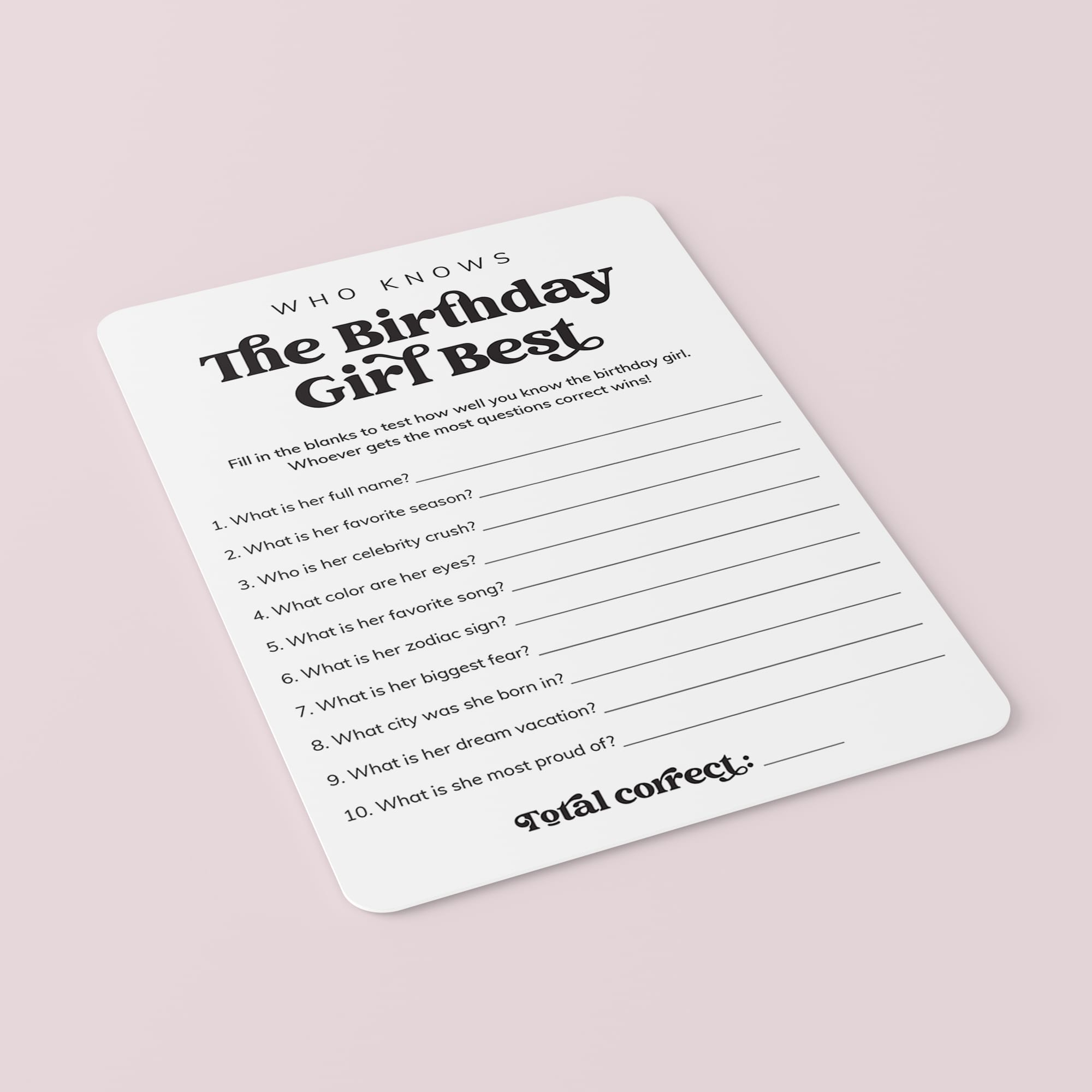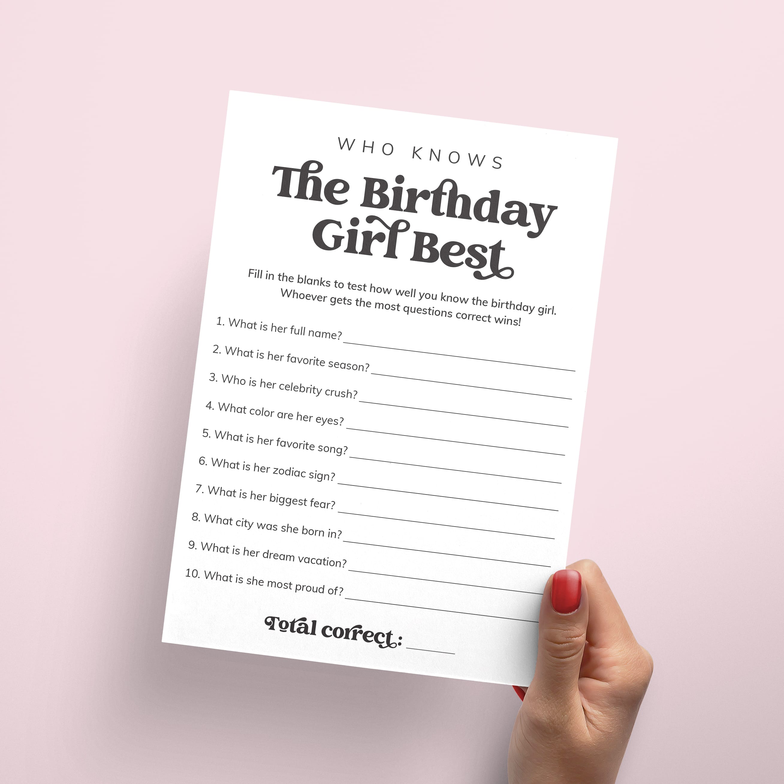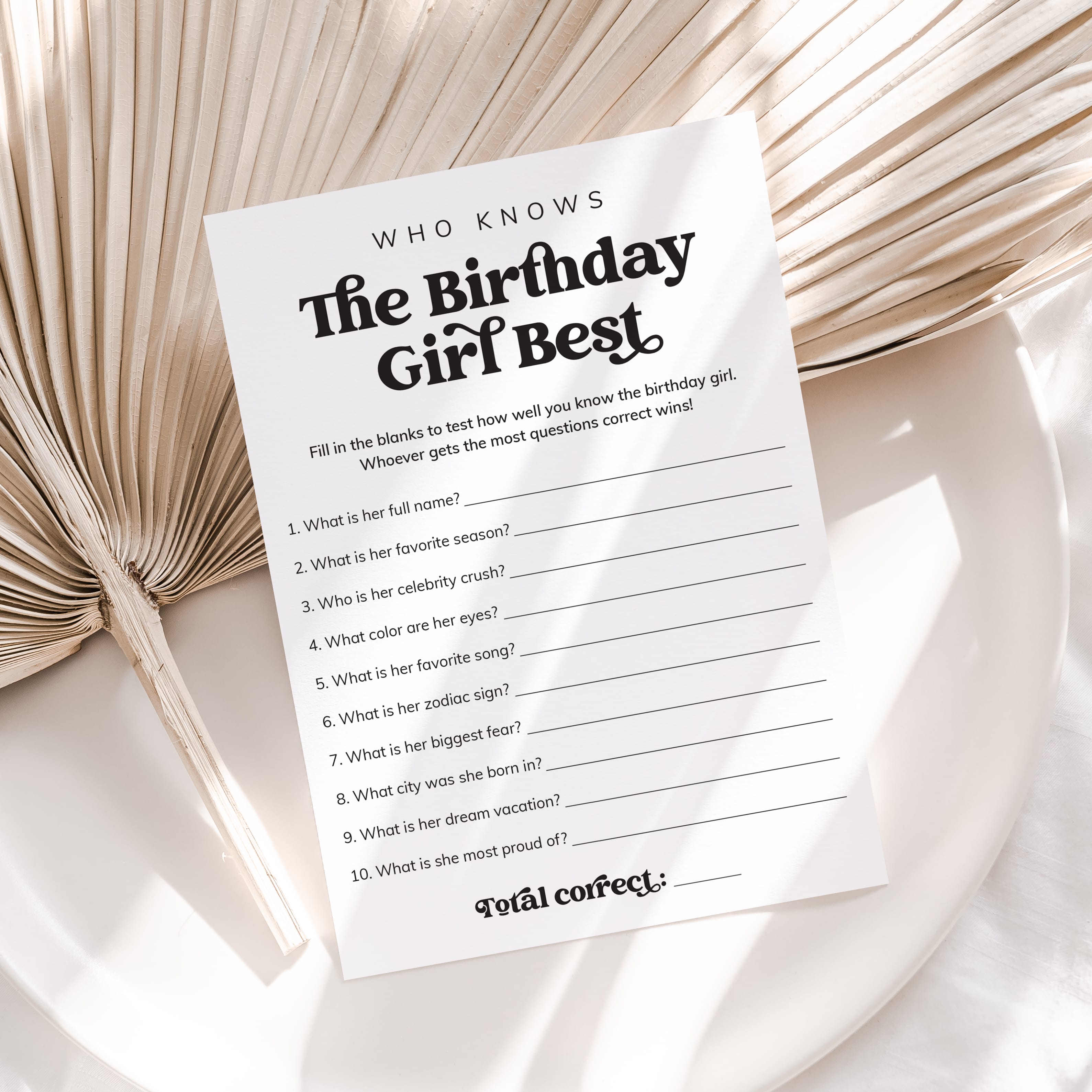 Test your birthday party guests how well they know the birthday girl and play 'Who Knows The Birthday Girl Best’ with this stylish birthday quiz with creative vintage script. The birthday questions are a great way to bring disparate people together and to put them all in a party mood. It's the perfect addition to your girl birthday party.