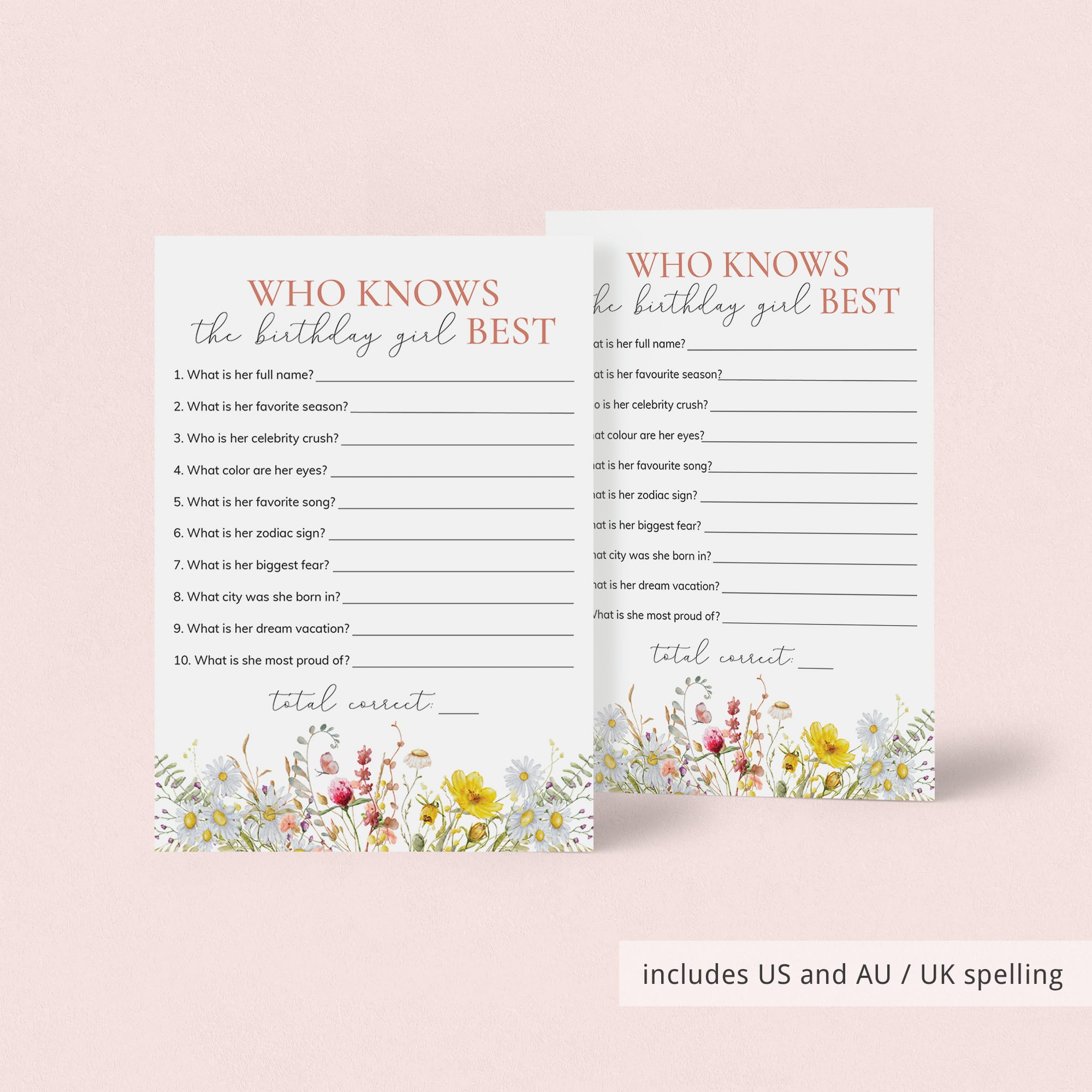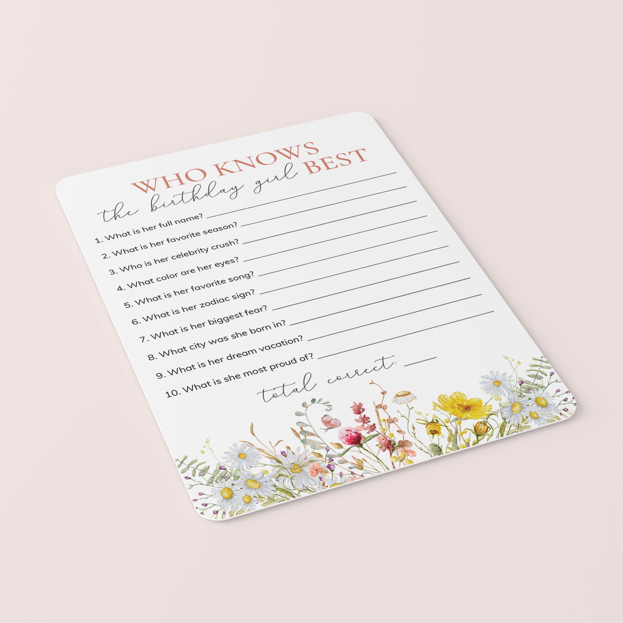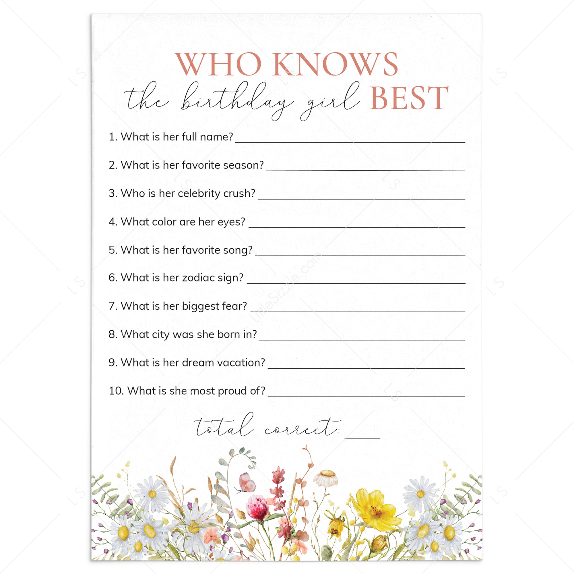 Test your birthday party guests how well they know the birthday girl and play "Who knows the birthday girl best" with this wildflower birthday trivia game. This birthday trivia is a great way to bring disparate people together and to put them all in a party mood. It's the perfect addition to a women's birthday party.