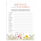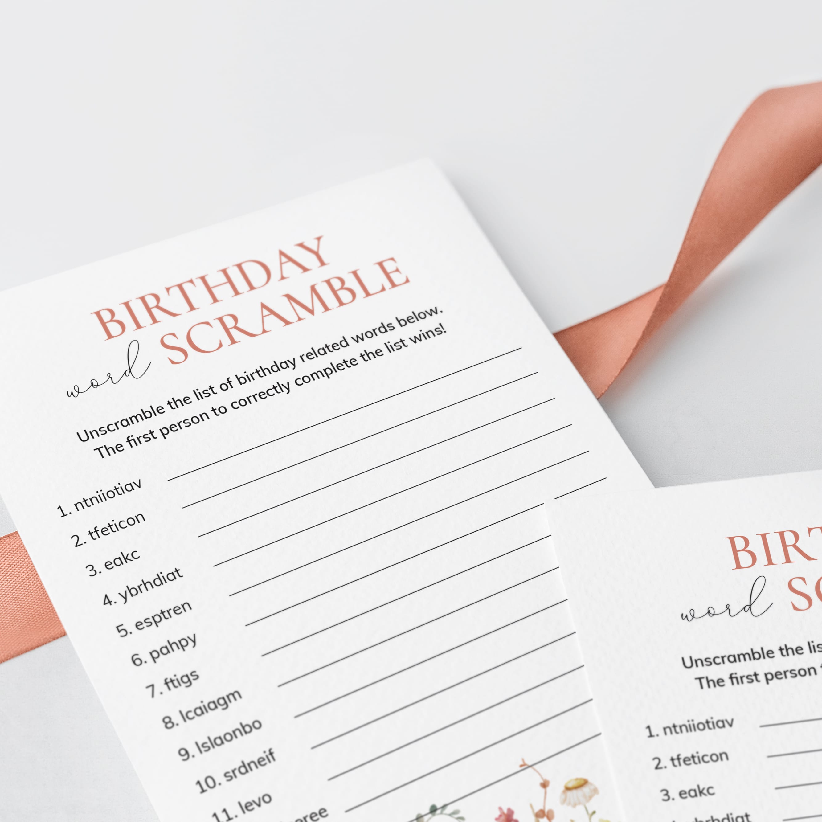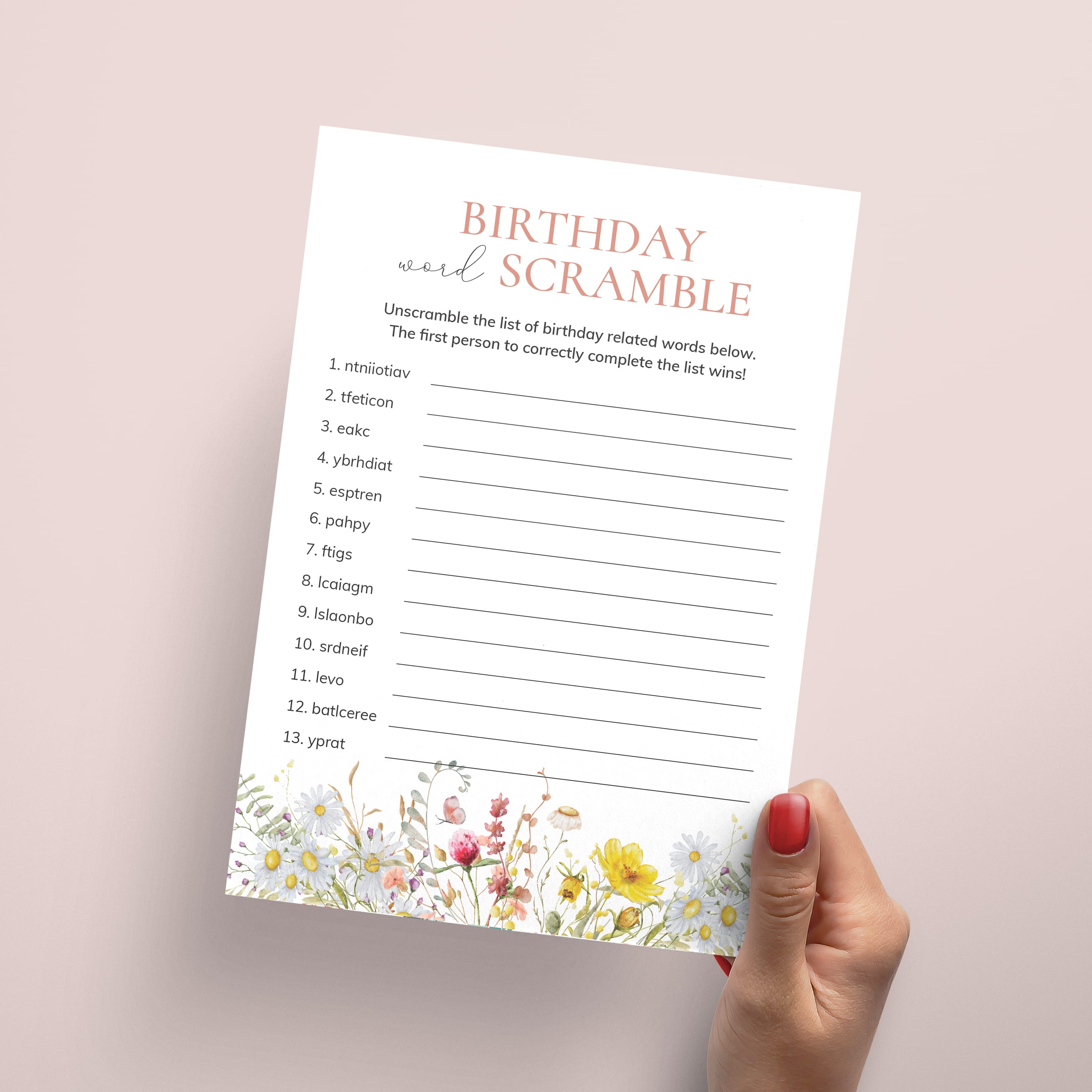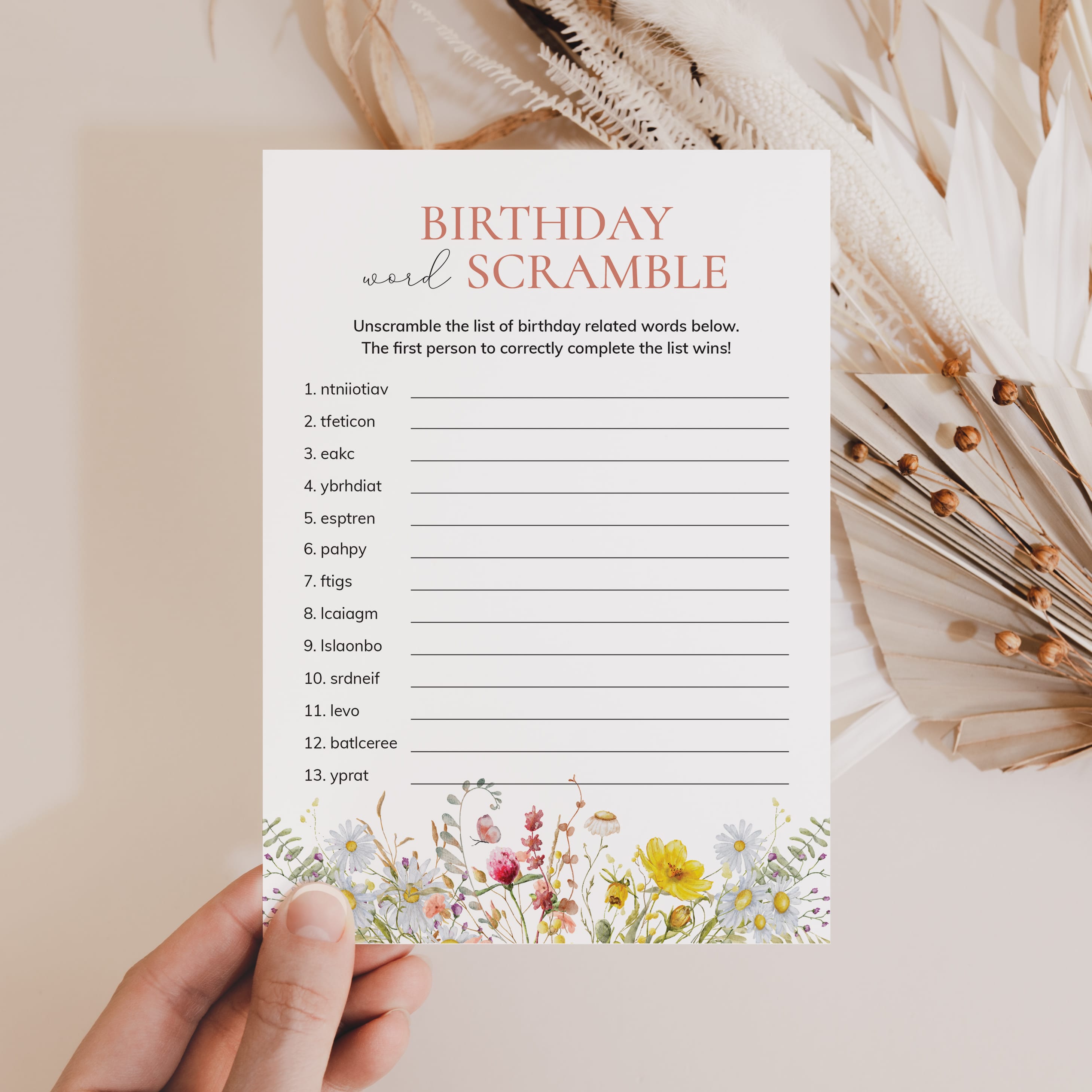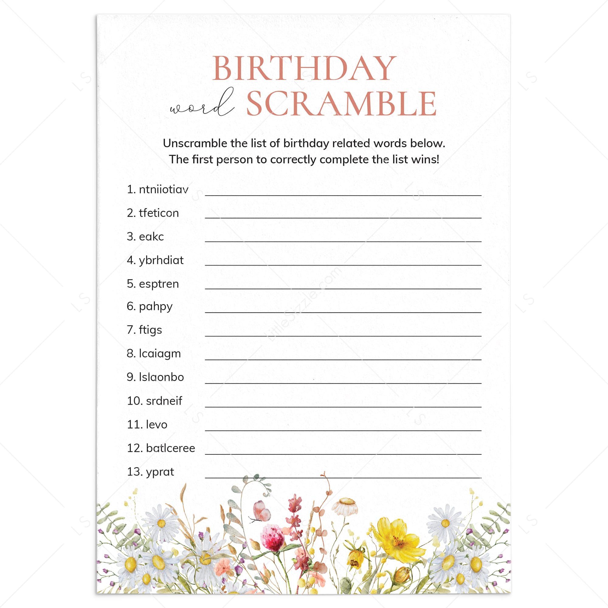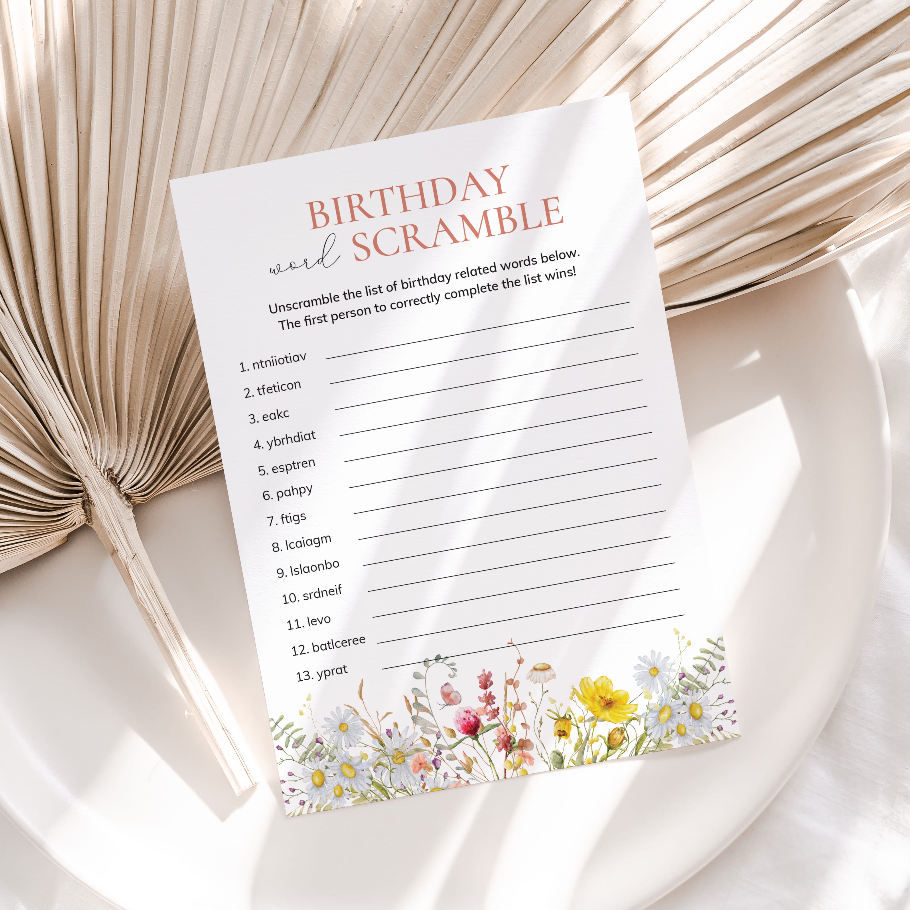 Play one of the most popular party games with this gorgeous Wildflower Birthday Word Scramble game. This floral party game will fit any womens birthday party theme. The game will create a fun and enjoyable moment for all of your guests.