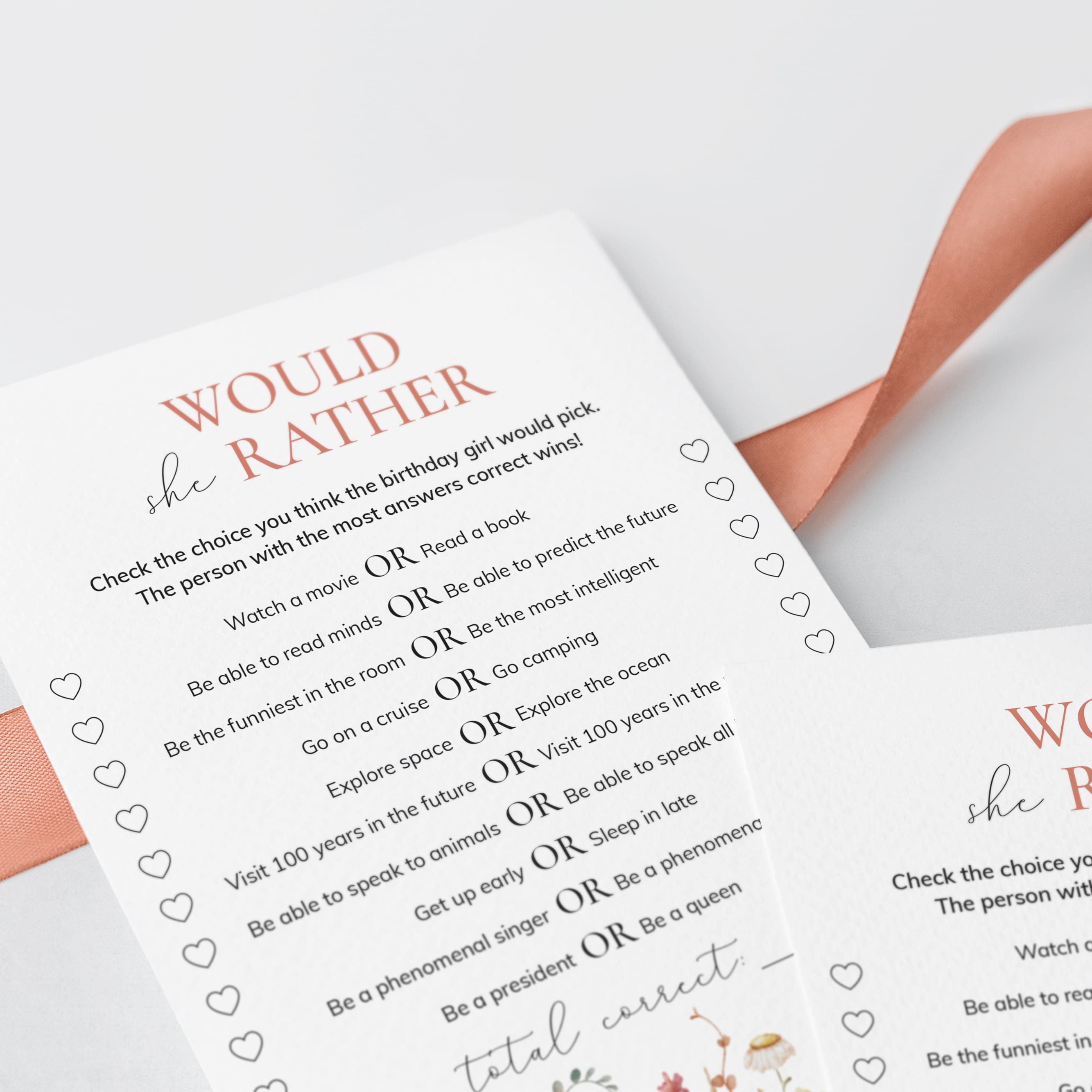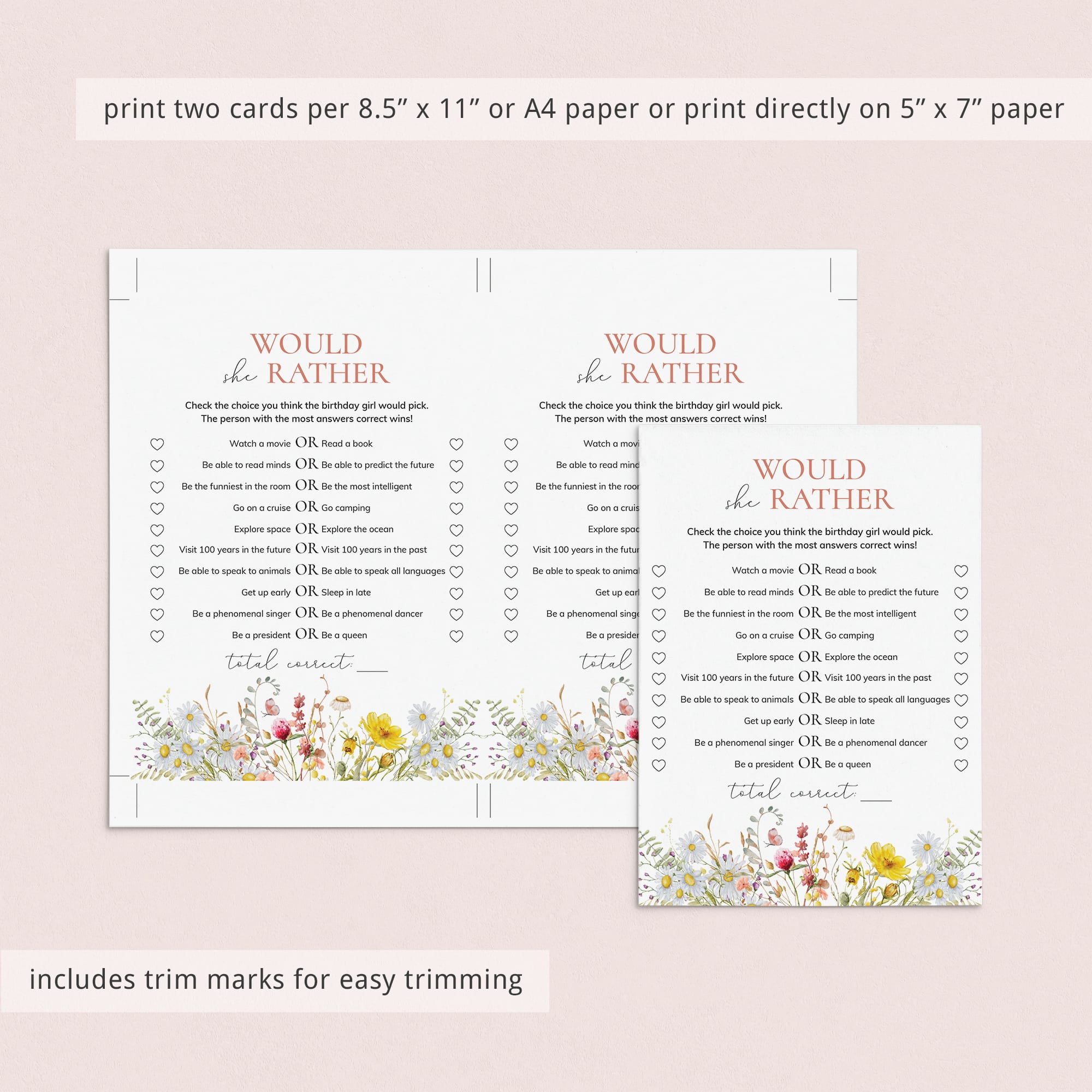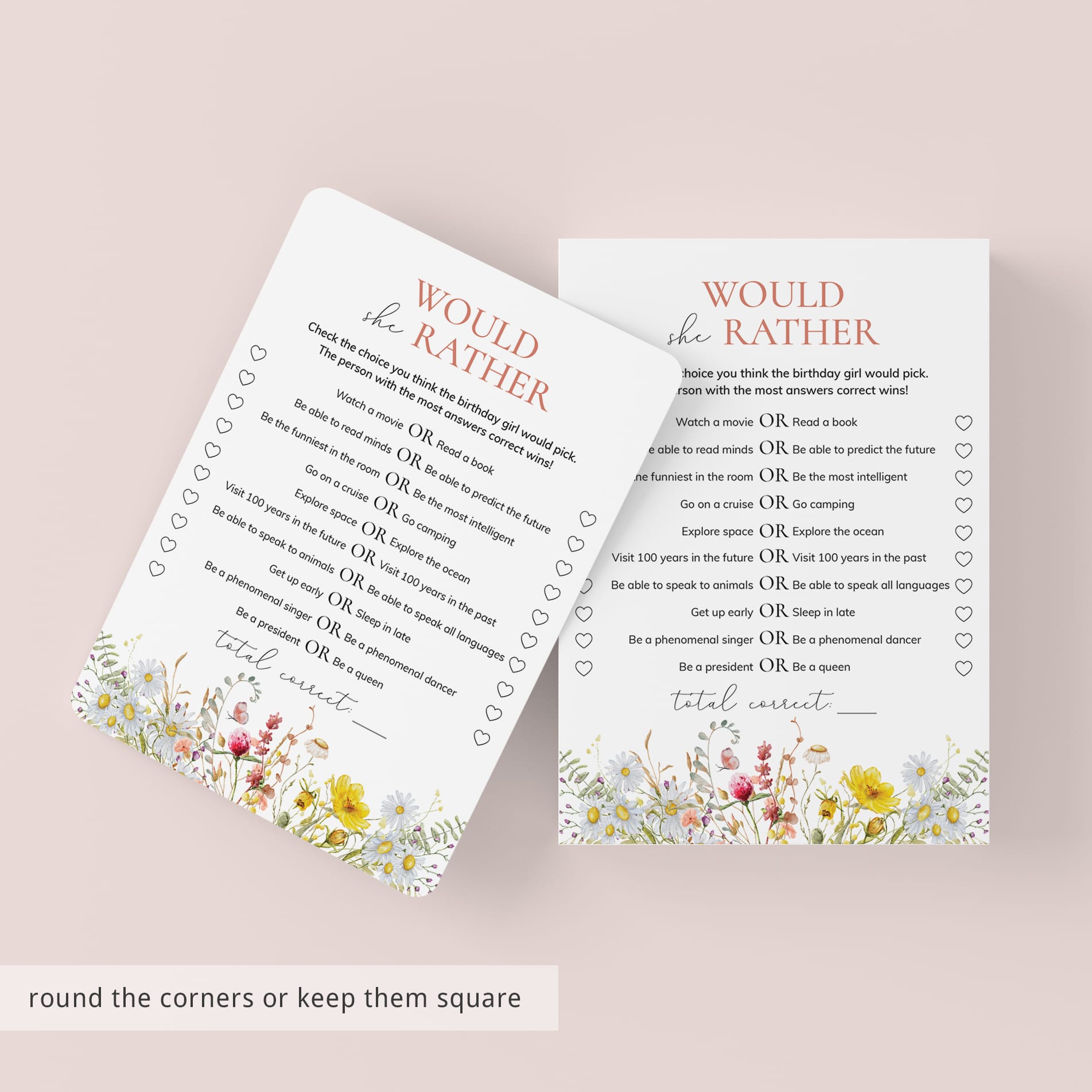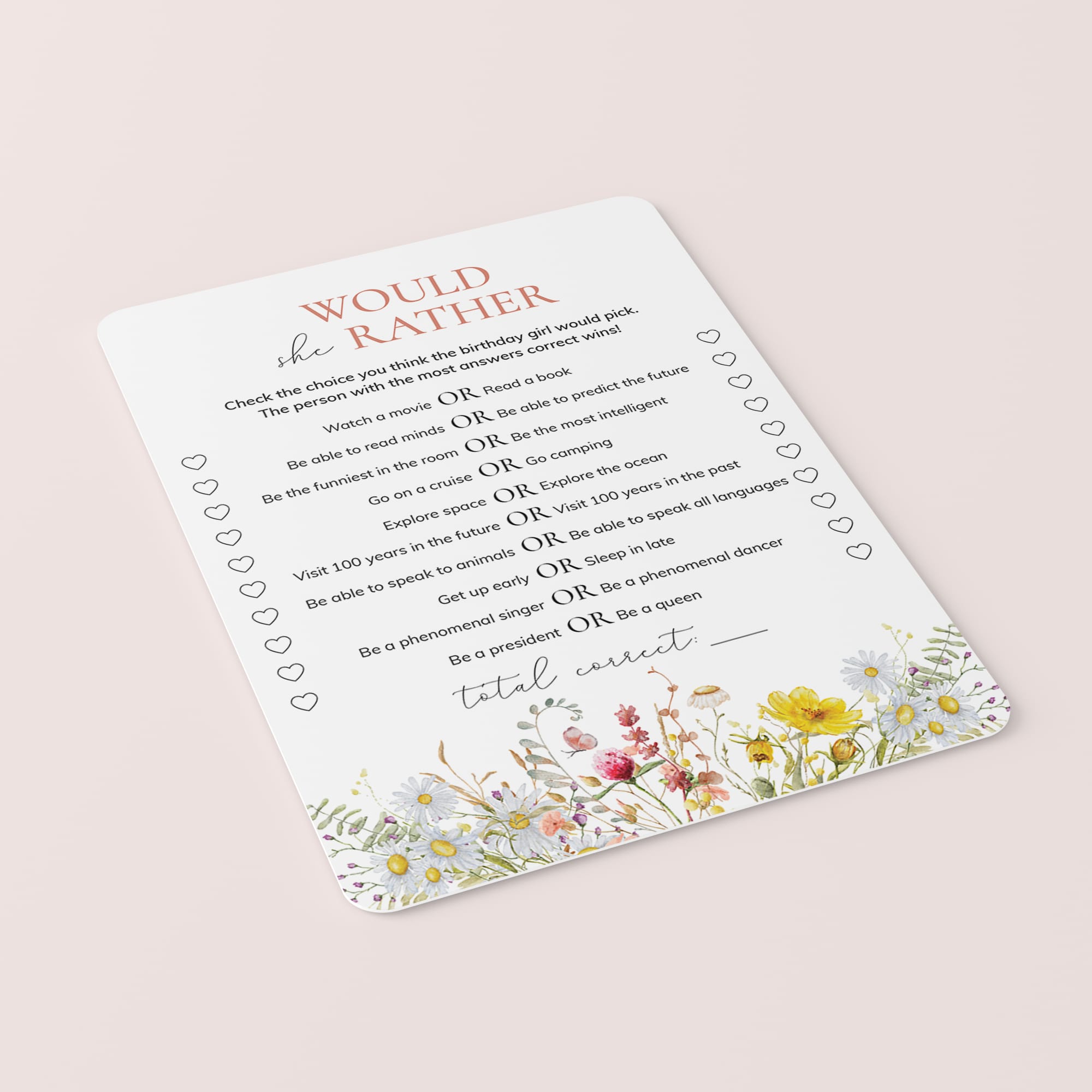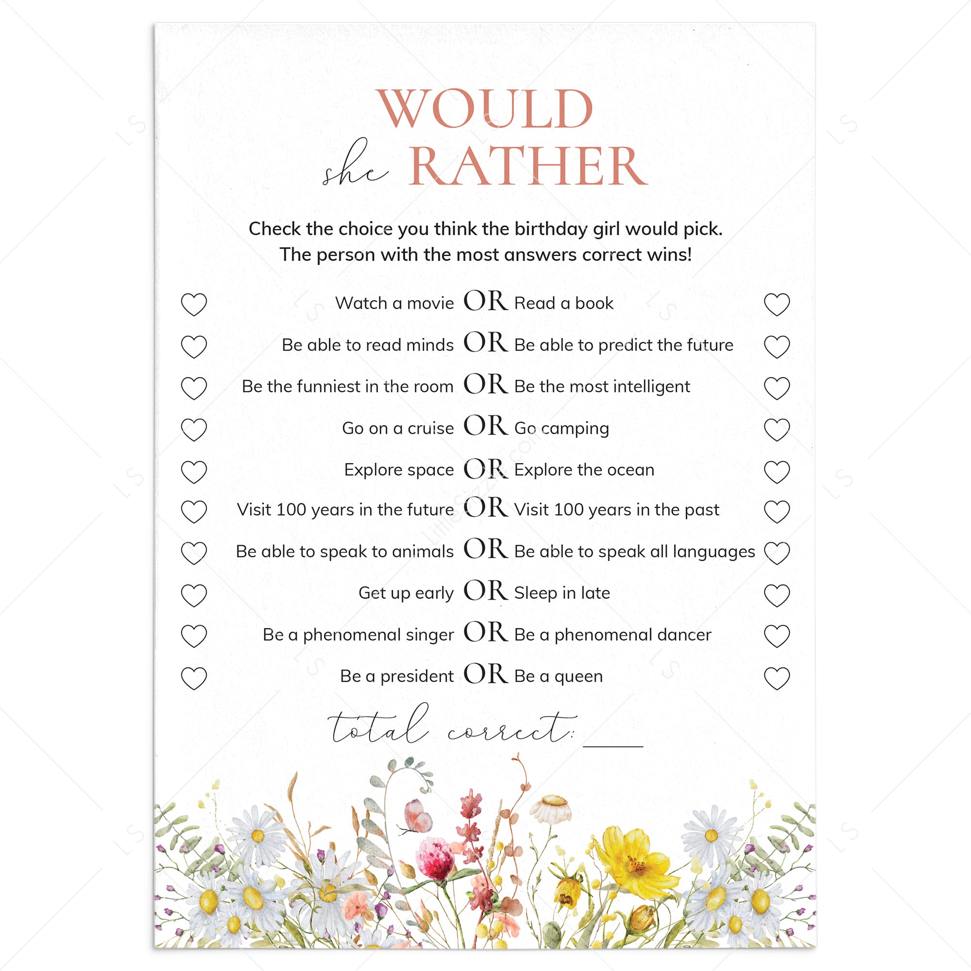Are you looking for the perfect icebreaker game to get people talking and in the party mood for your birthday party? Play Would She Rather! After all, your guests have one thing in common: you know the birthday girl. This gorgeous Would She Rather birthday game card with watercolor wildflowers is the perfect addition to a birthday party for a woman of any age.