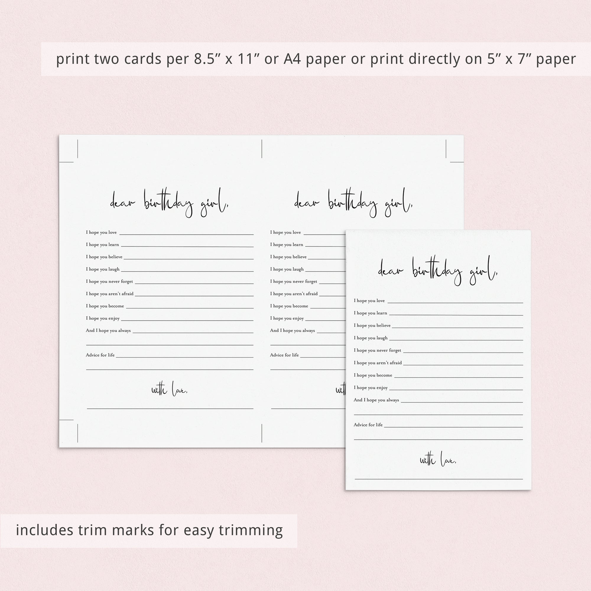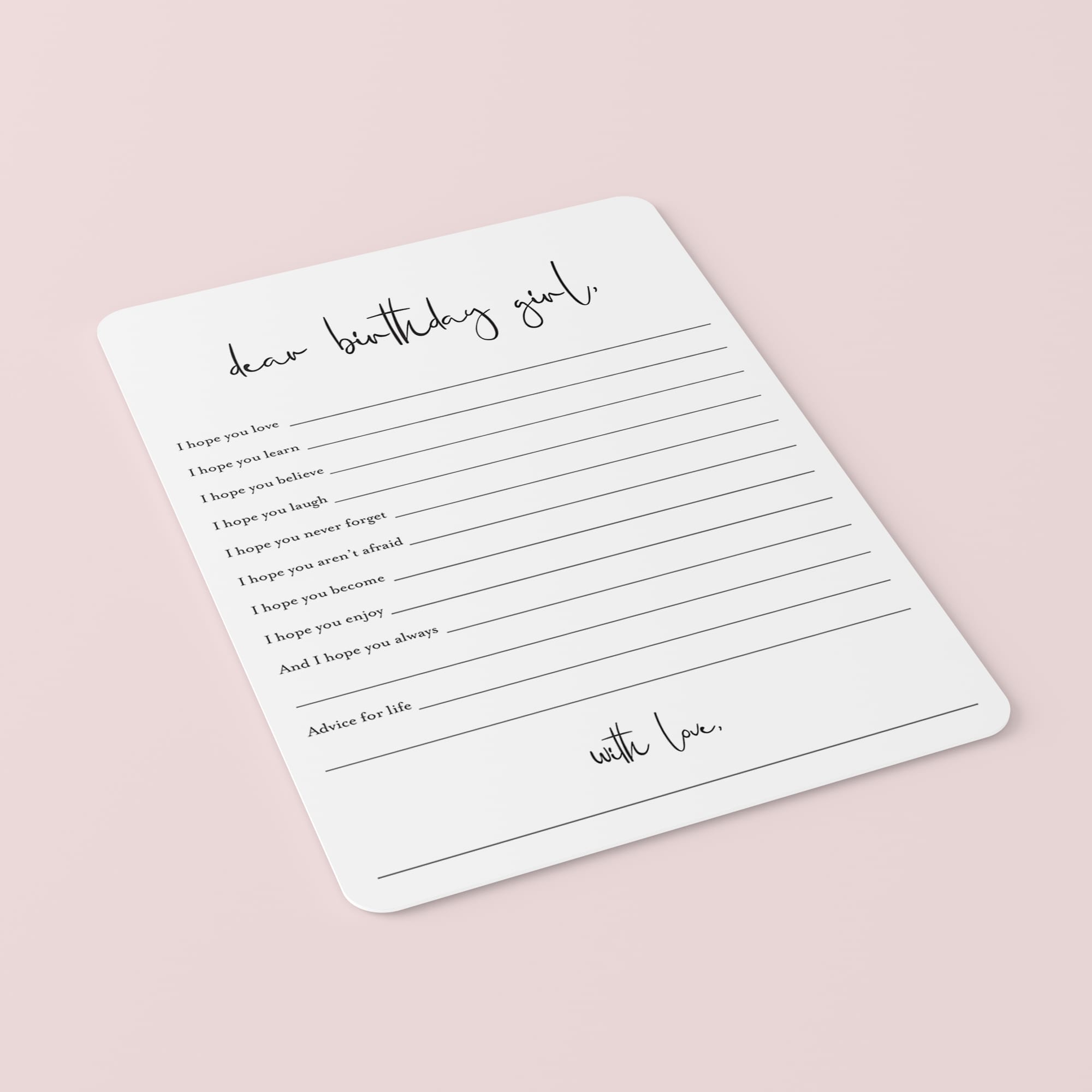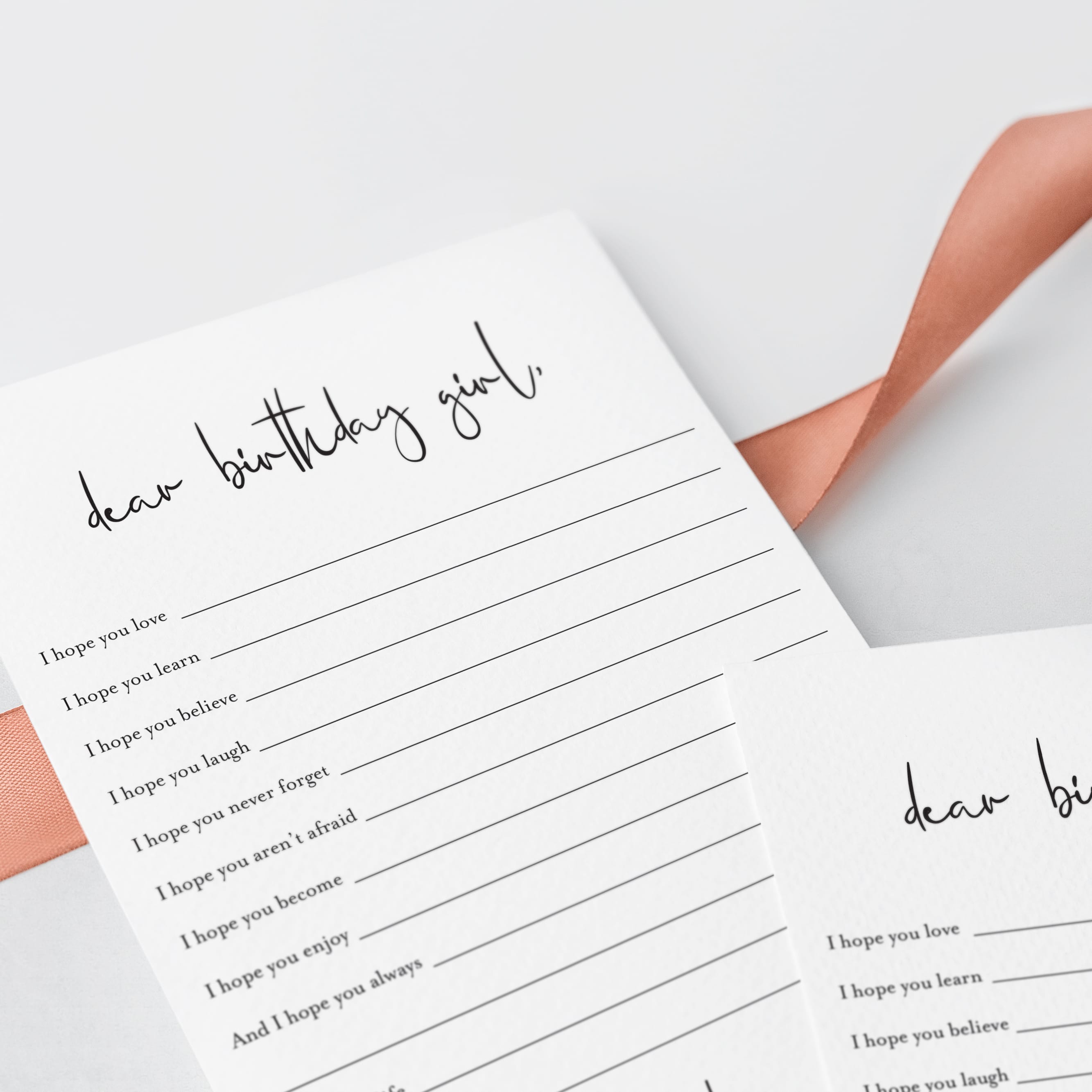 Create an amazing keepsake for the birthday girl with these modern minimalist Wishes for the Birthday Girl cards. The birthday wishes cards will fit any women's birthday party theme. Let every guest write down their wishes for the birthday girl and collect the cards for the lucky lady.