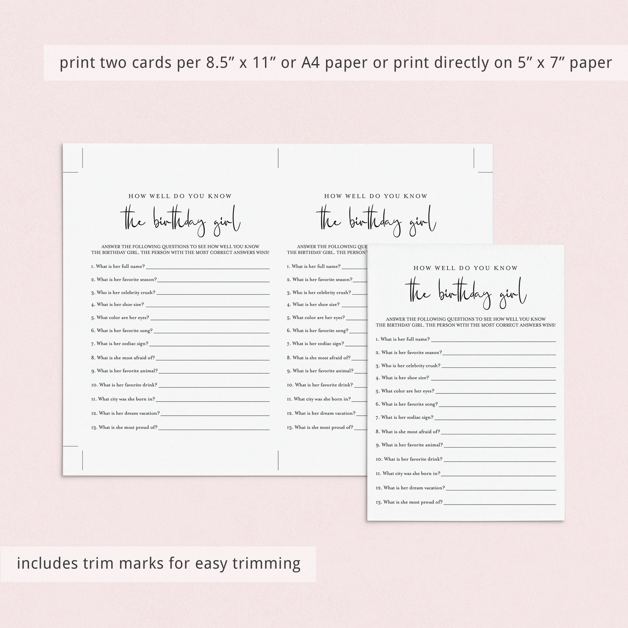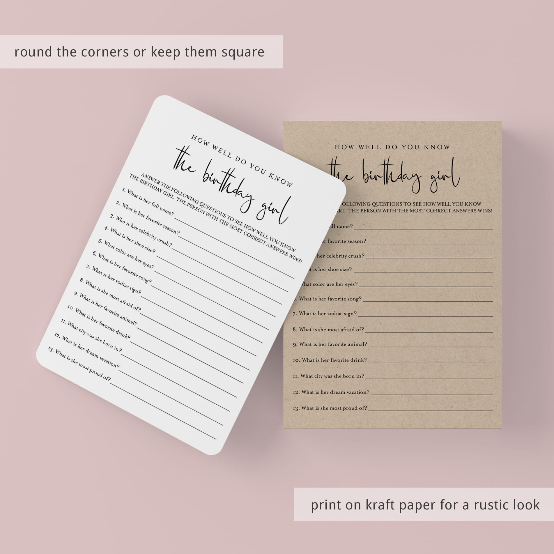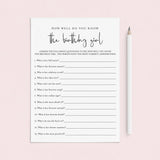 Test your womens birthday party guests how well they know the birthday girl and play "How well do you know the birthday girl" with this modern minimalist birthday game. This womens birthday trivia is a great way to bring disparate people together and to put them all in a party mood. It's the perfect addition to your birthday party.