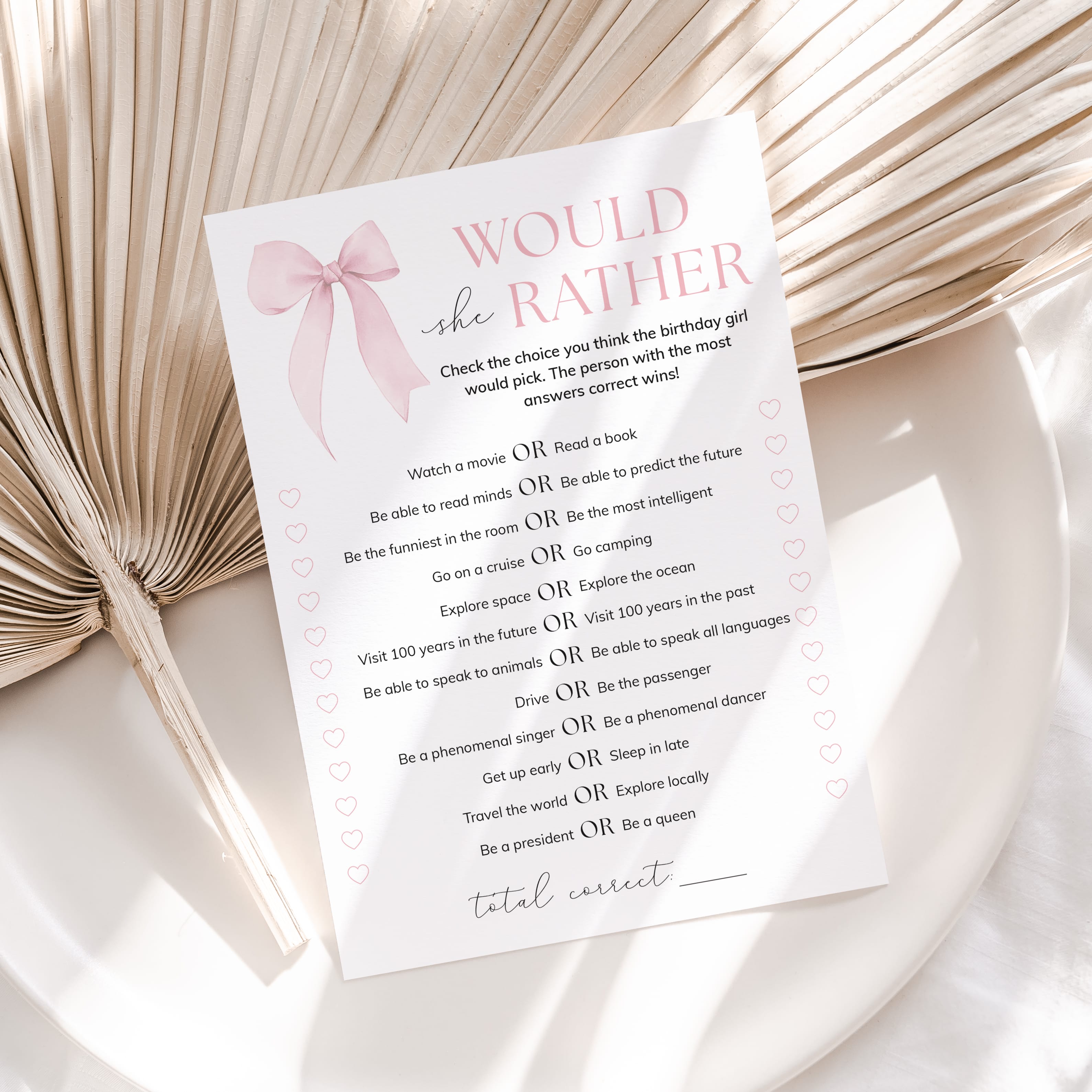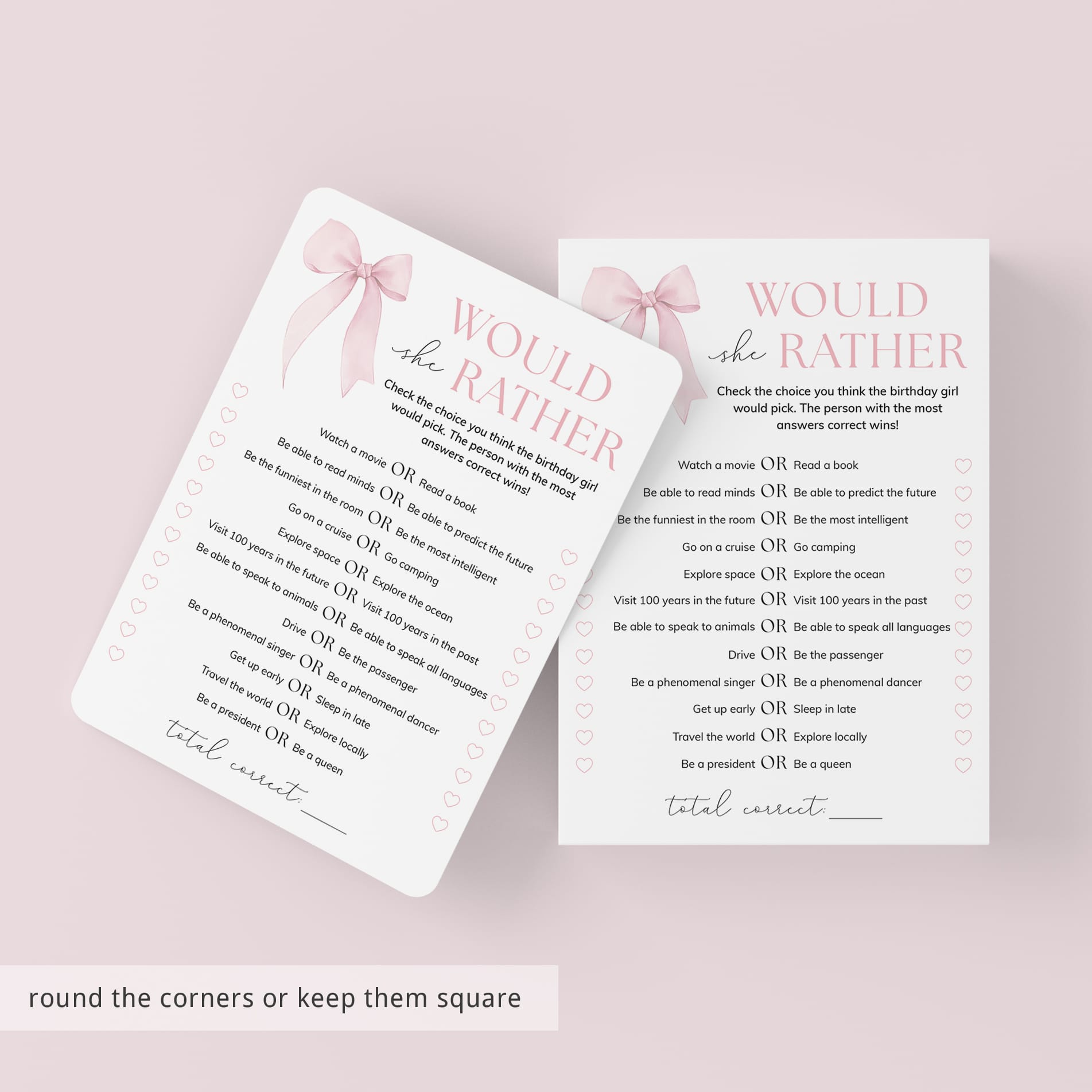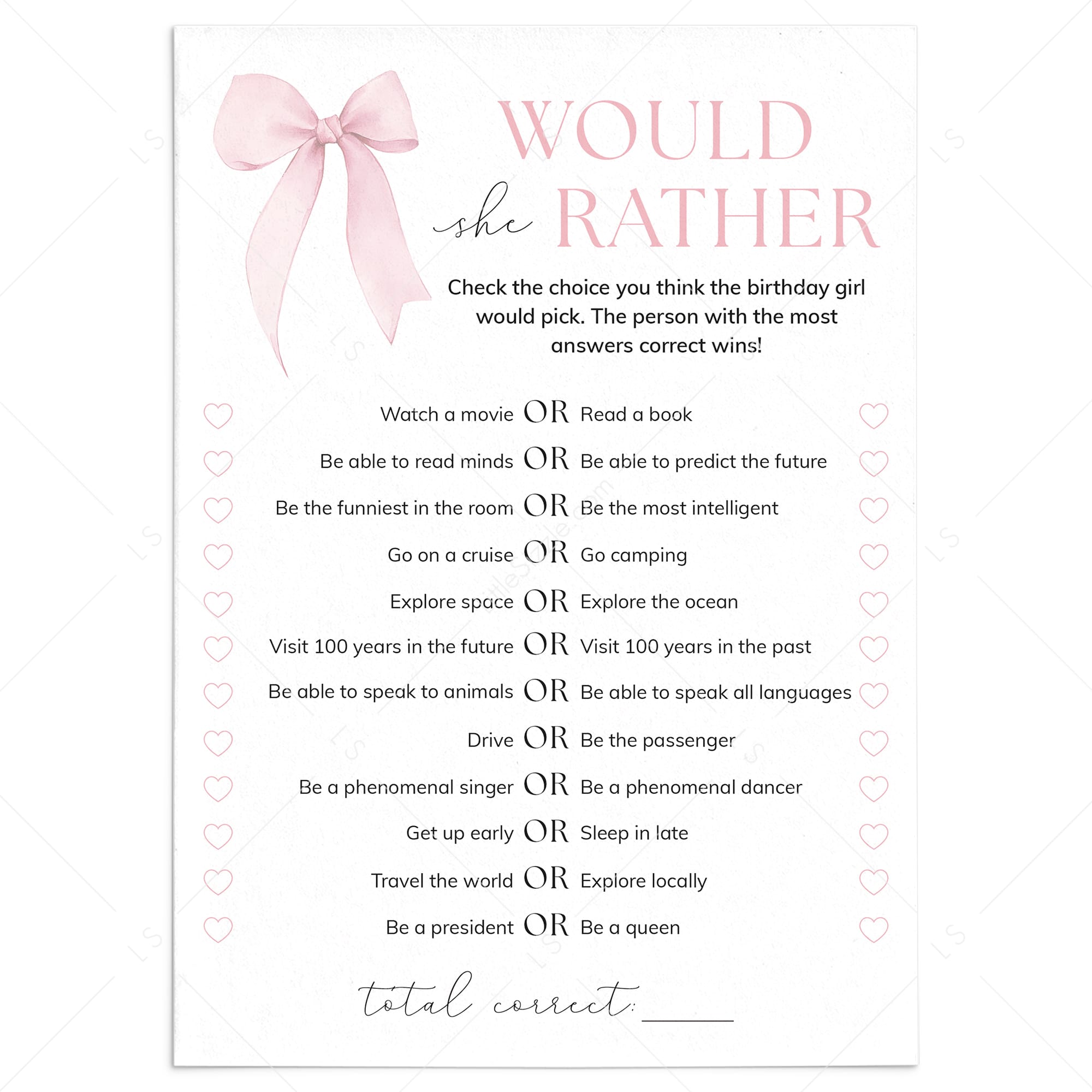 Are you looking for the perfect icebreaker to get people talking and in the party mood for your birthday party? Play Would She Rather! After all, your guests have one thing in common: you know the birthday girl. This Would She Rather game with elegant pink bow and 12 Would She Rather questions is the perfect addition to a birthday party for a woman of any age.