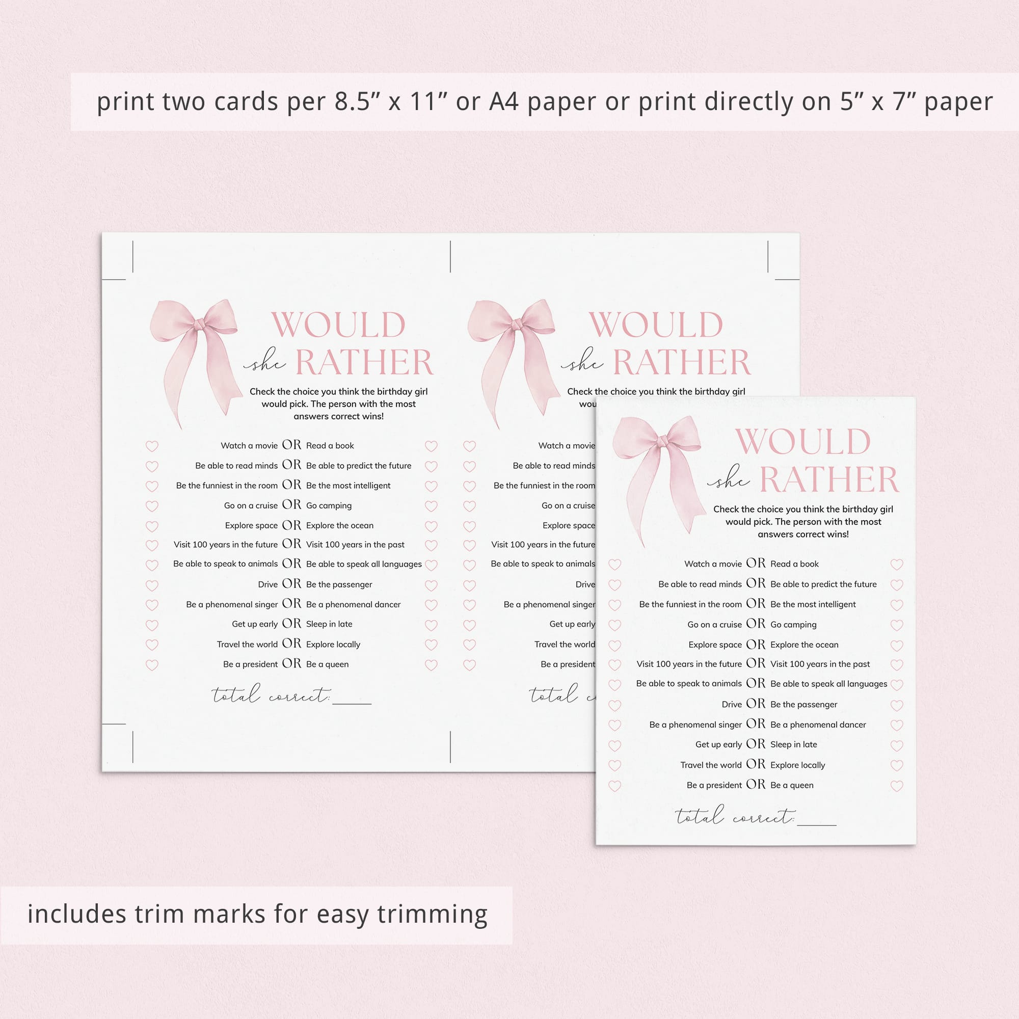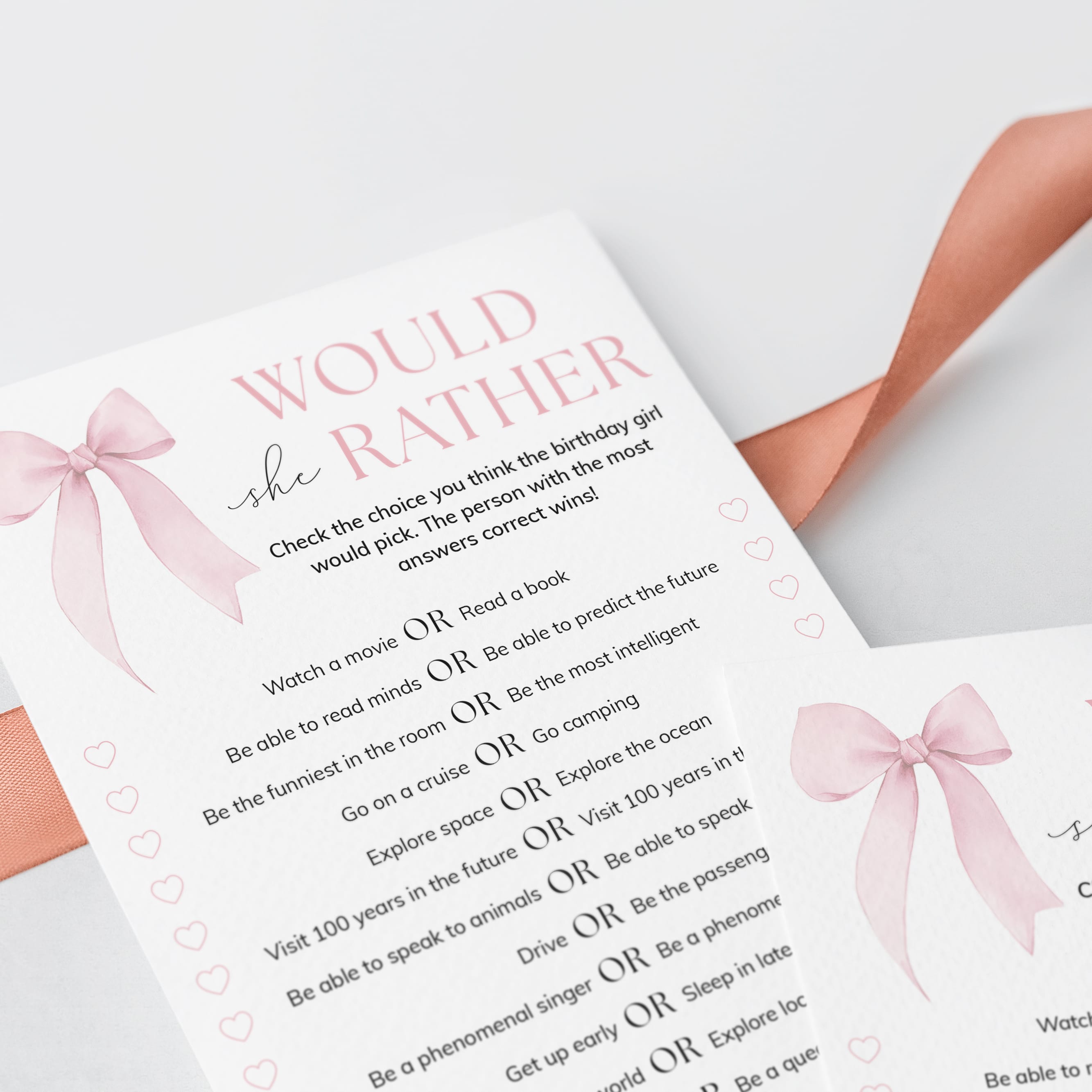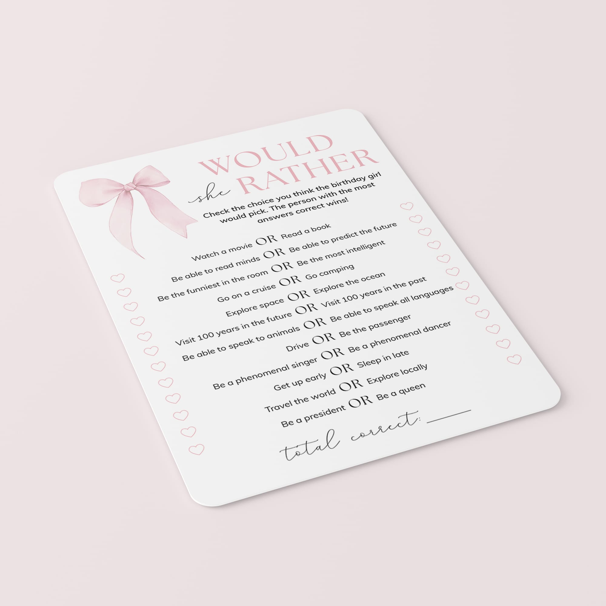 Are you looking for the perfect icebreaker to get people talking and in the party mood for your birthday party? Play Would She Rather! After all, your guests have one thing in common: you know the birthday girl. This Would She Rather game with elegant pink bow and 12 Would She Rather questions is the perfect addition to a birthday party for a woman of any age.