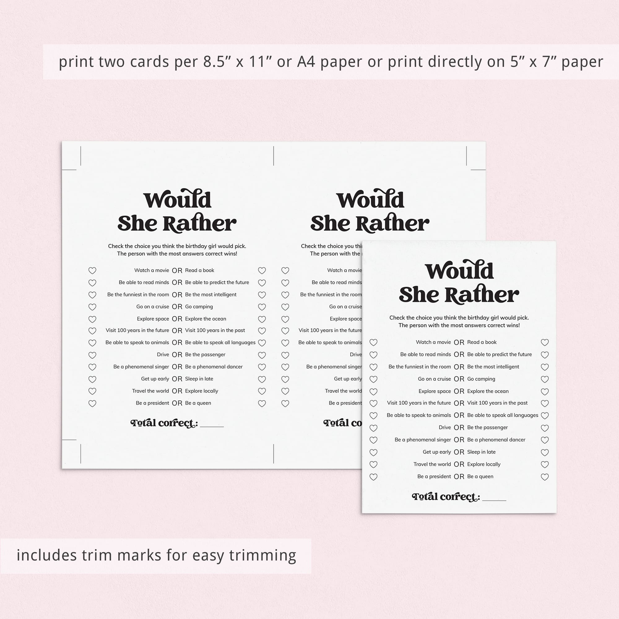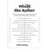 This Would She Rather birthday party game is an instant download. After purchase you will receive a download link immediately on screen. Also within minutes of your order and payment, an e-mail will be sent to you with a link for your download.