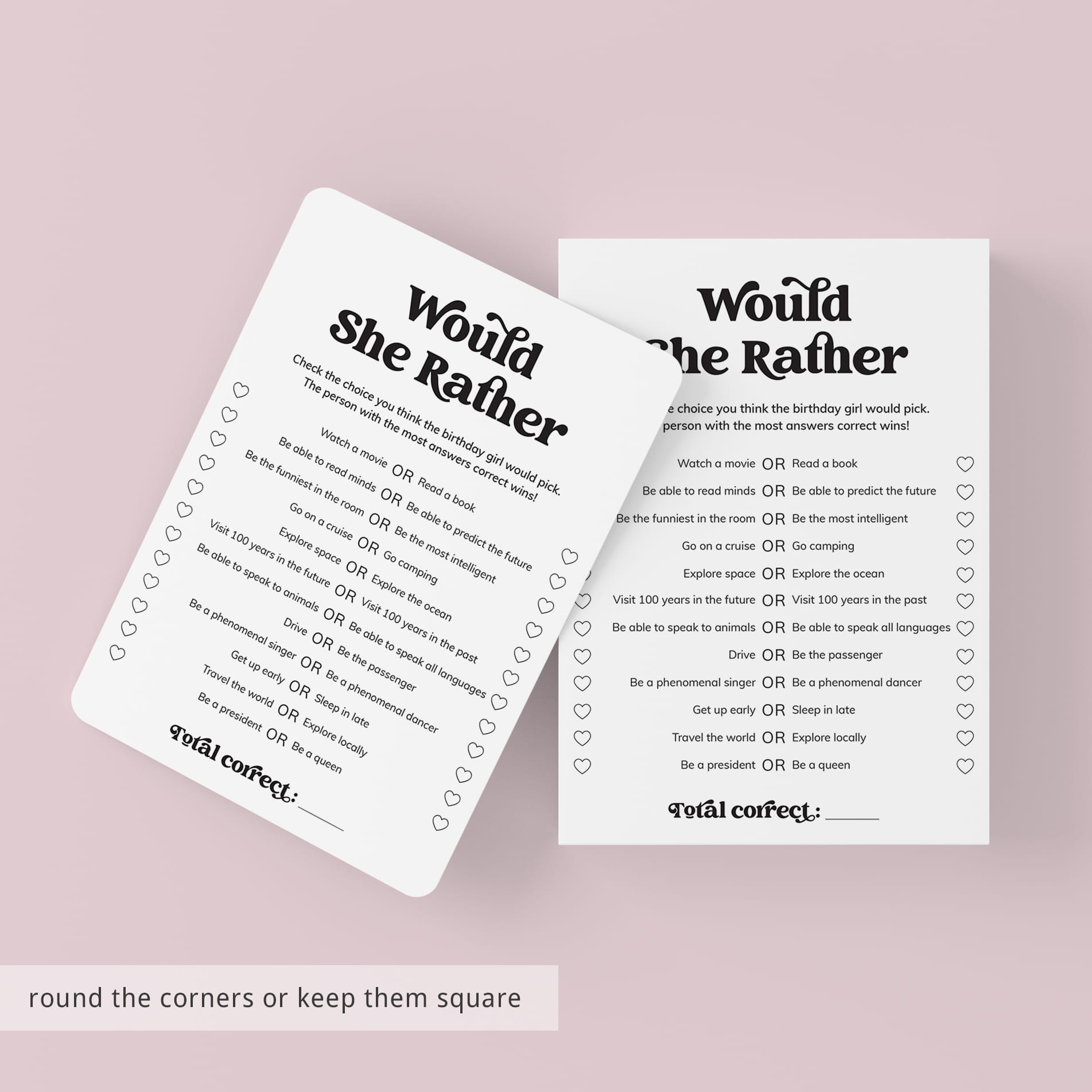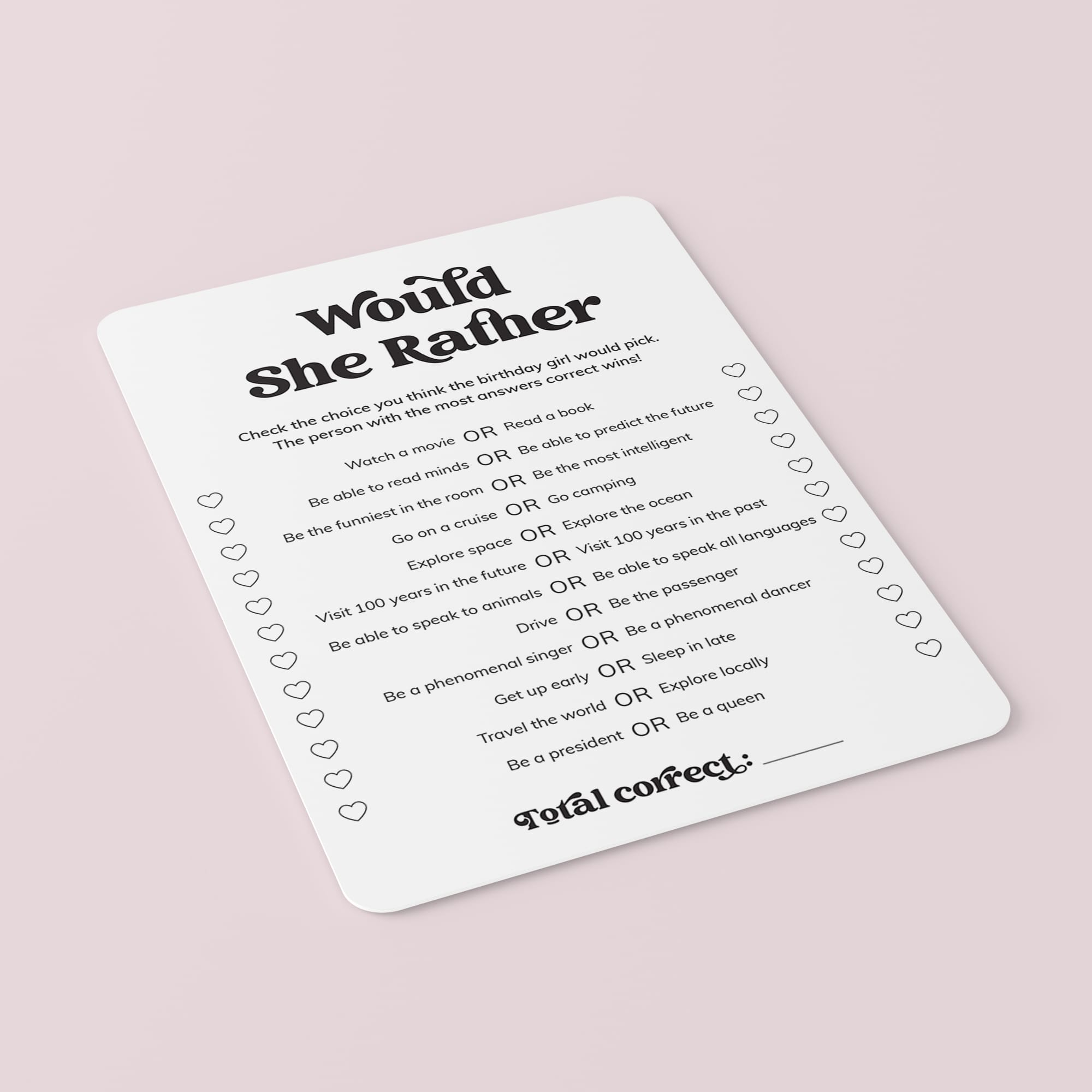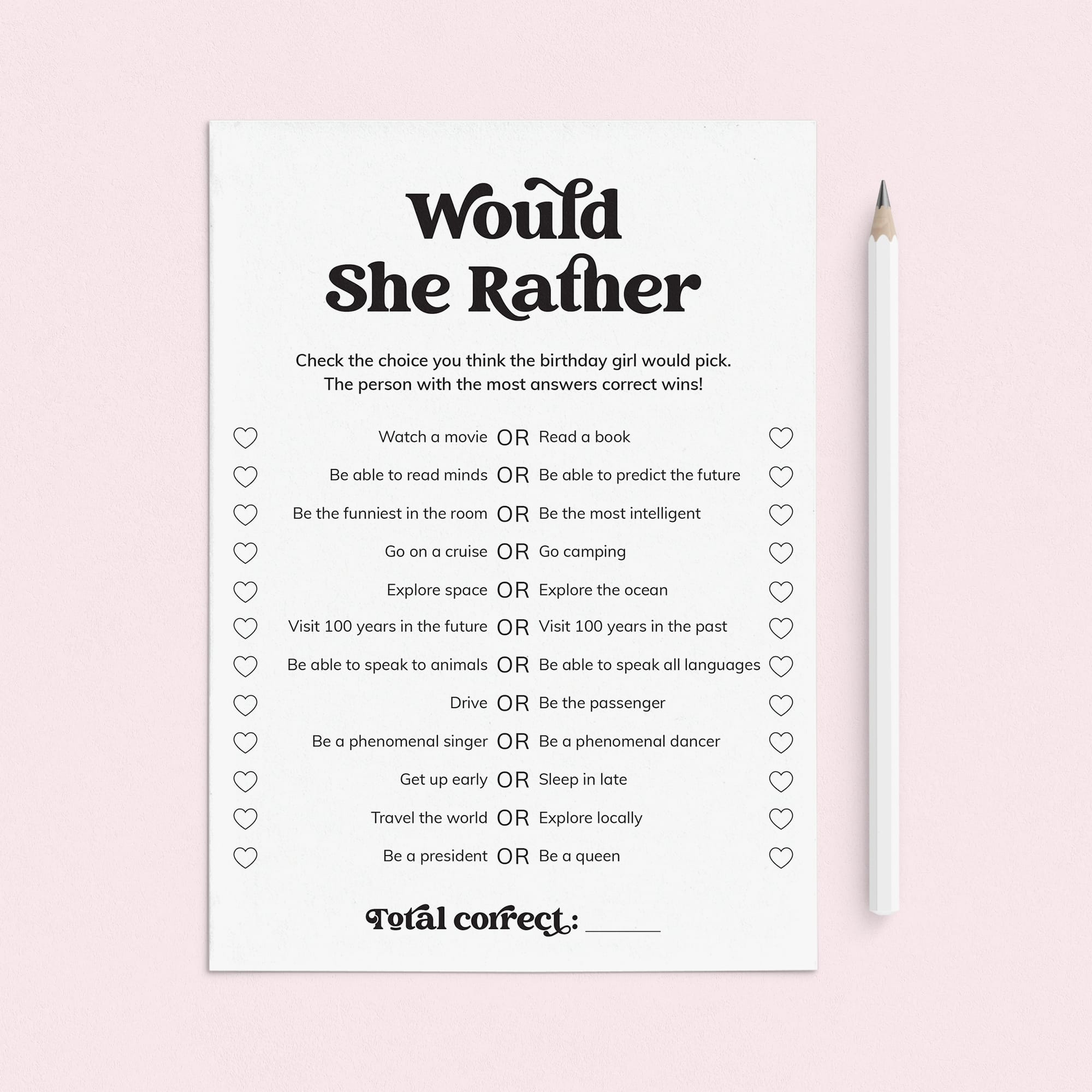 Give everyone 5-10 minutes to tick the choices on the game sheet they think the birthday girl would make. When everyone’s finished, ask the birthday girl what she’d actually pick and total up your scores. The person with the most correct answers wins!