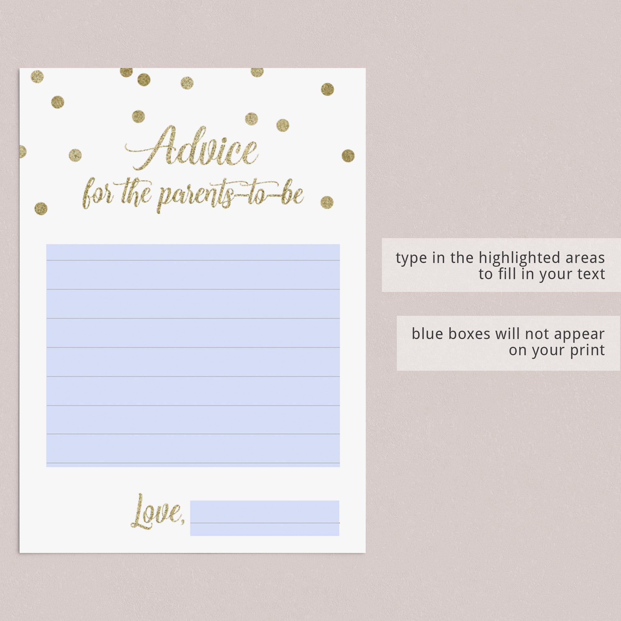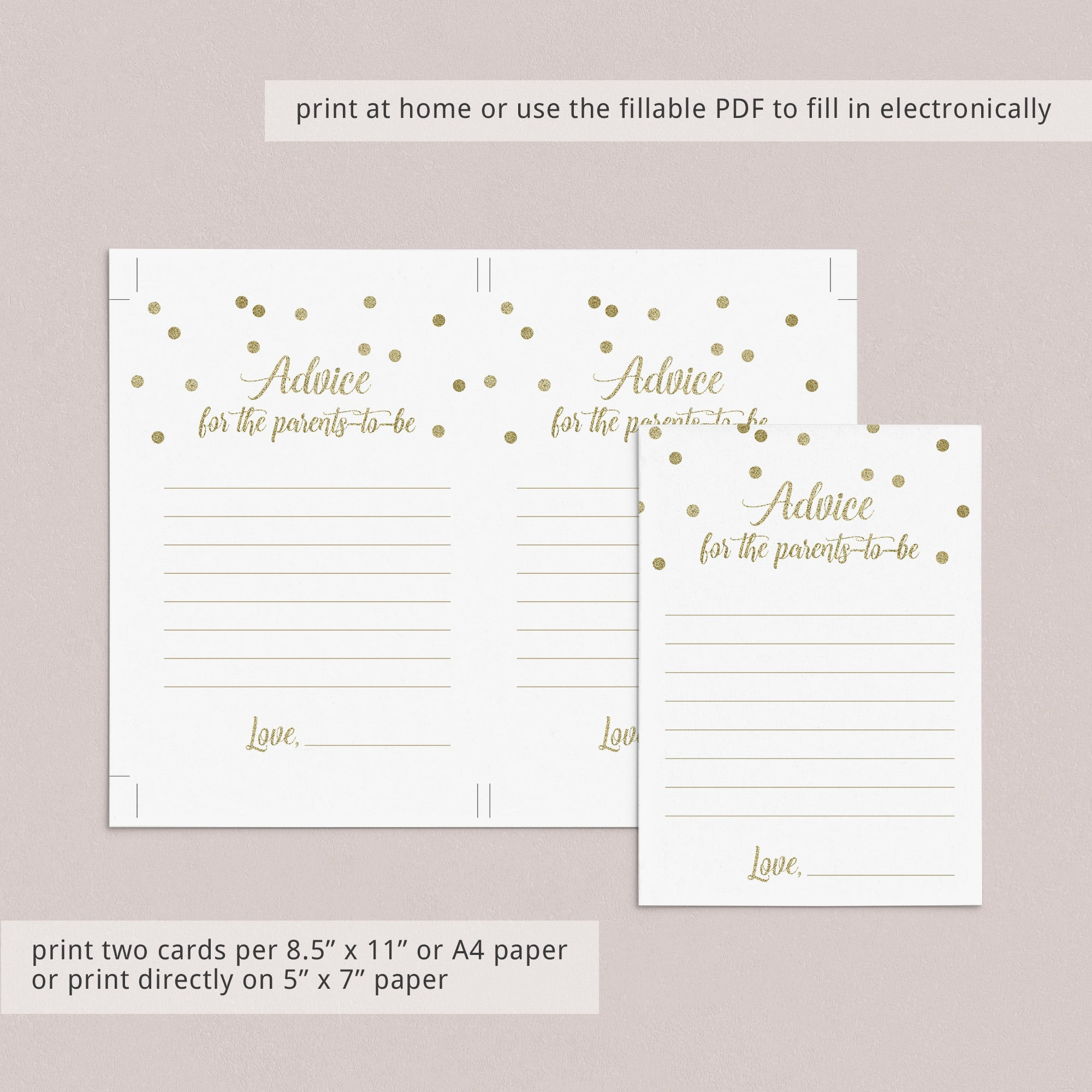Create a magnificent keepsake for the new parents with these gold baby shower advice cards. Let every guest write down or fill in their advice for the parents-to-be and collect the cards for the lucky couple. Printable and electronically fillable files are included.
