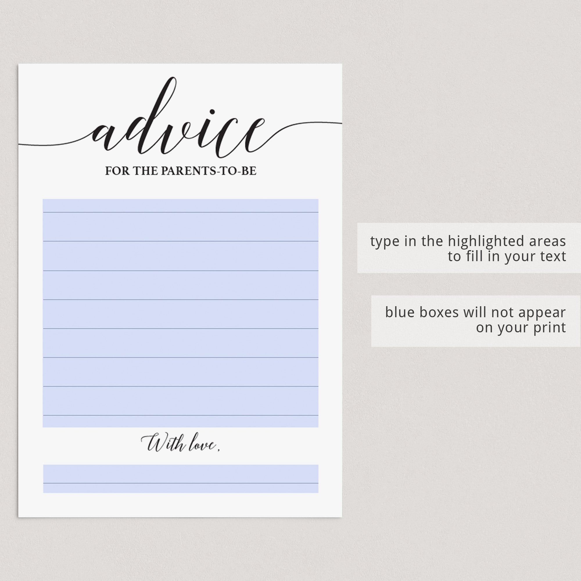 Let your guests write down their words of wisdom for the parents to be on these minimal baby shower advice cards!