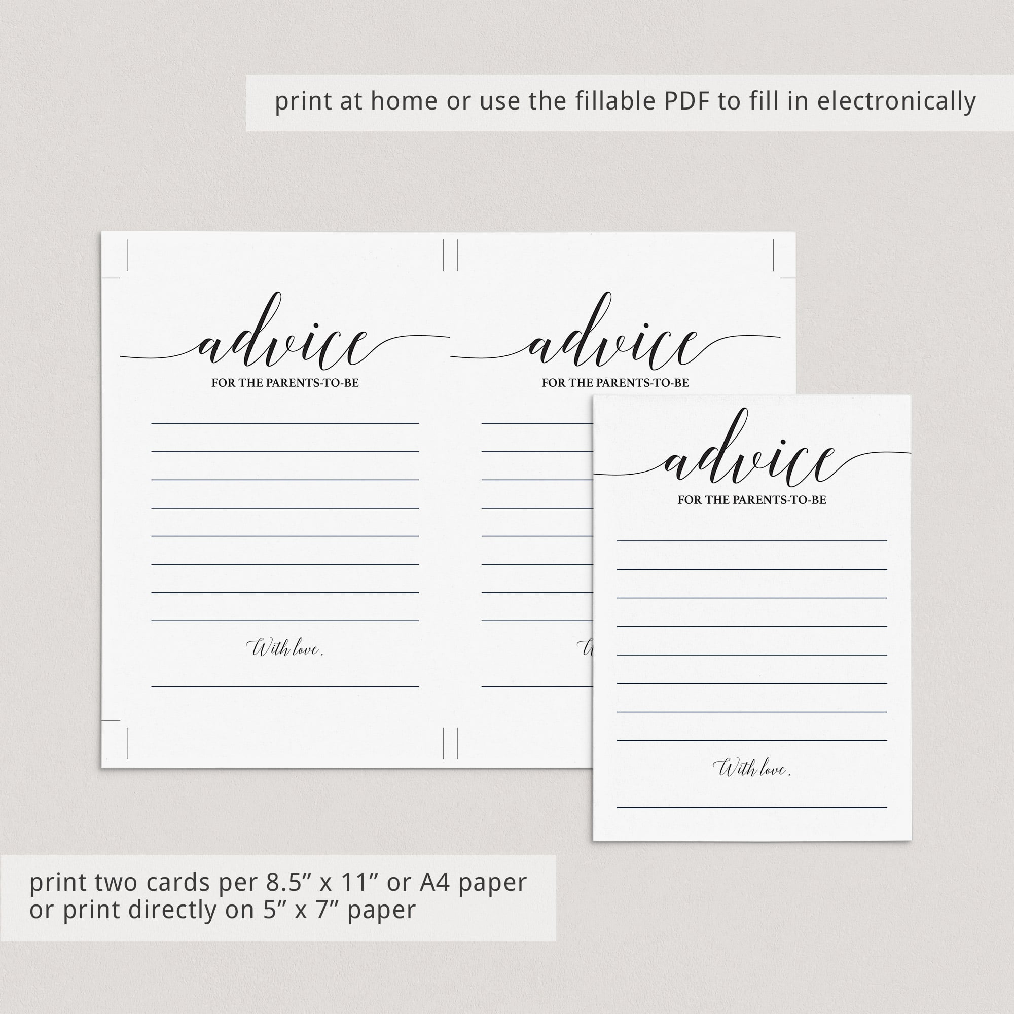 The advice card has been designed in black and white. You can print on kraft paper to create a rustic look or print on colored cardstock for beautiful results. Print right from your computer in a matter of minutes or have the cards printed at your favorite print shop.